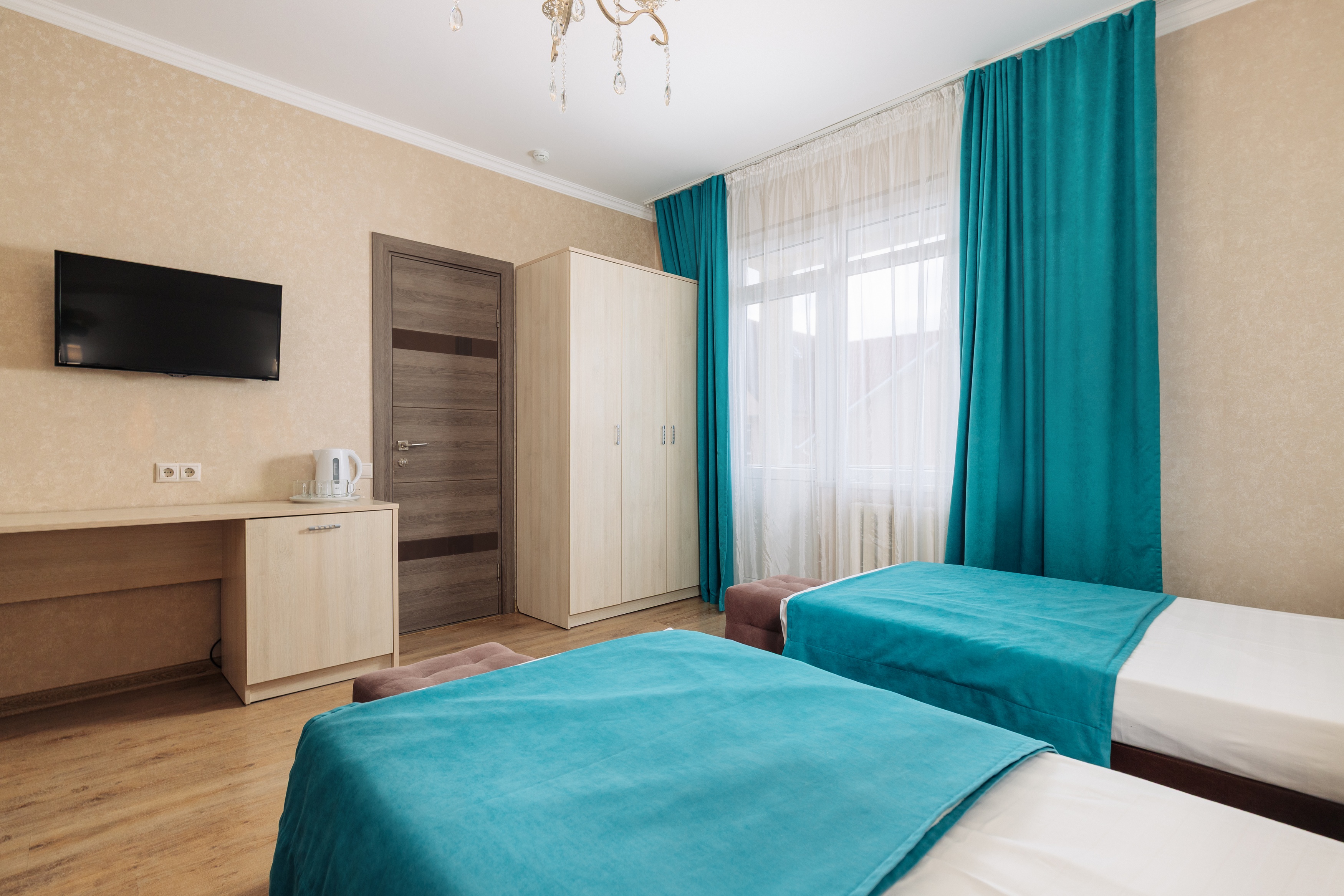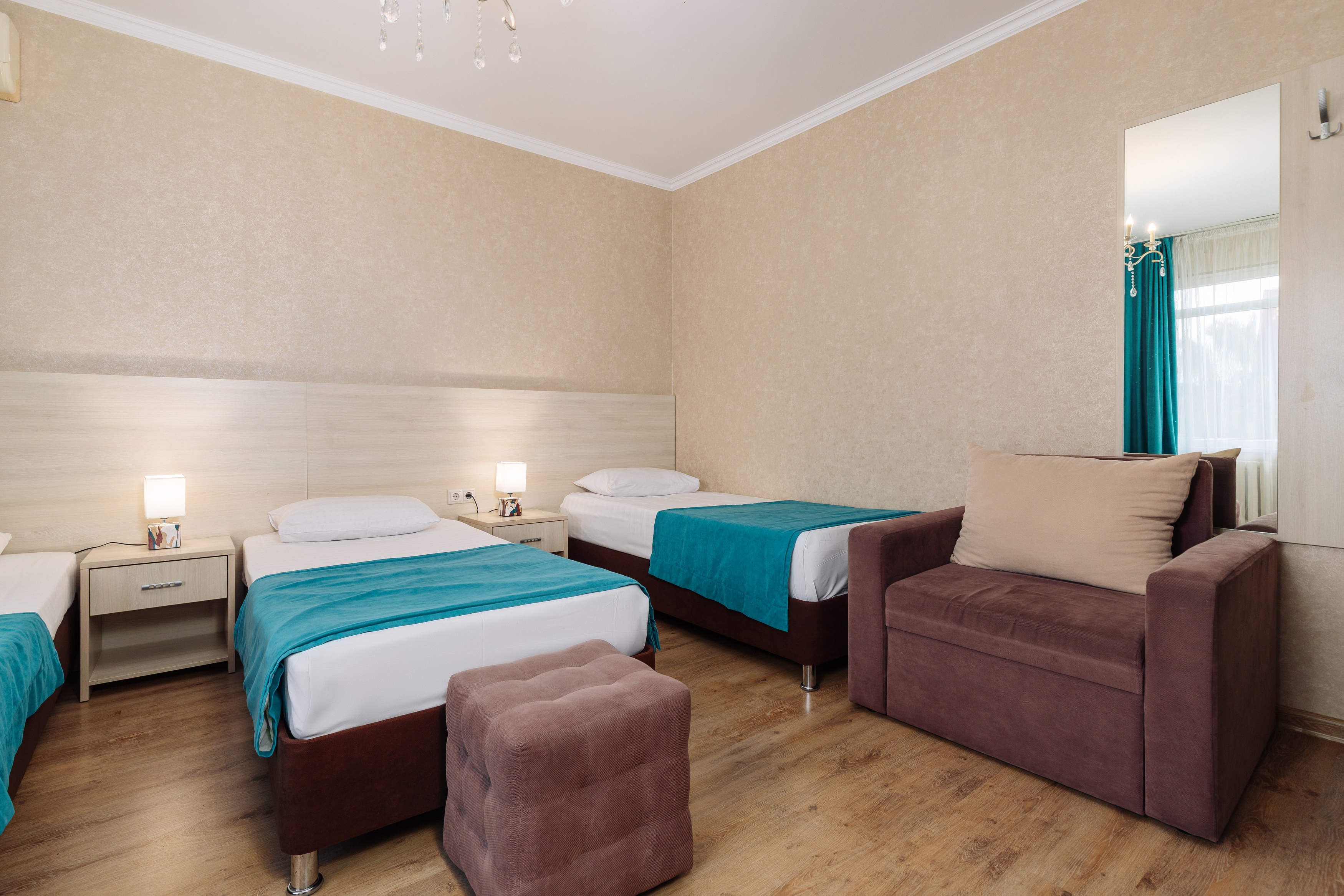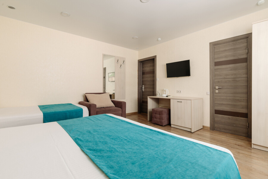В номере: зеркало, кресло-кровать, кровати односпальные, прикроватные тумбочки, стол, столик журнальный, стулья, шкаф, кондиционер, телевизор ЖК, холодильник, электрочайник