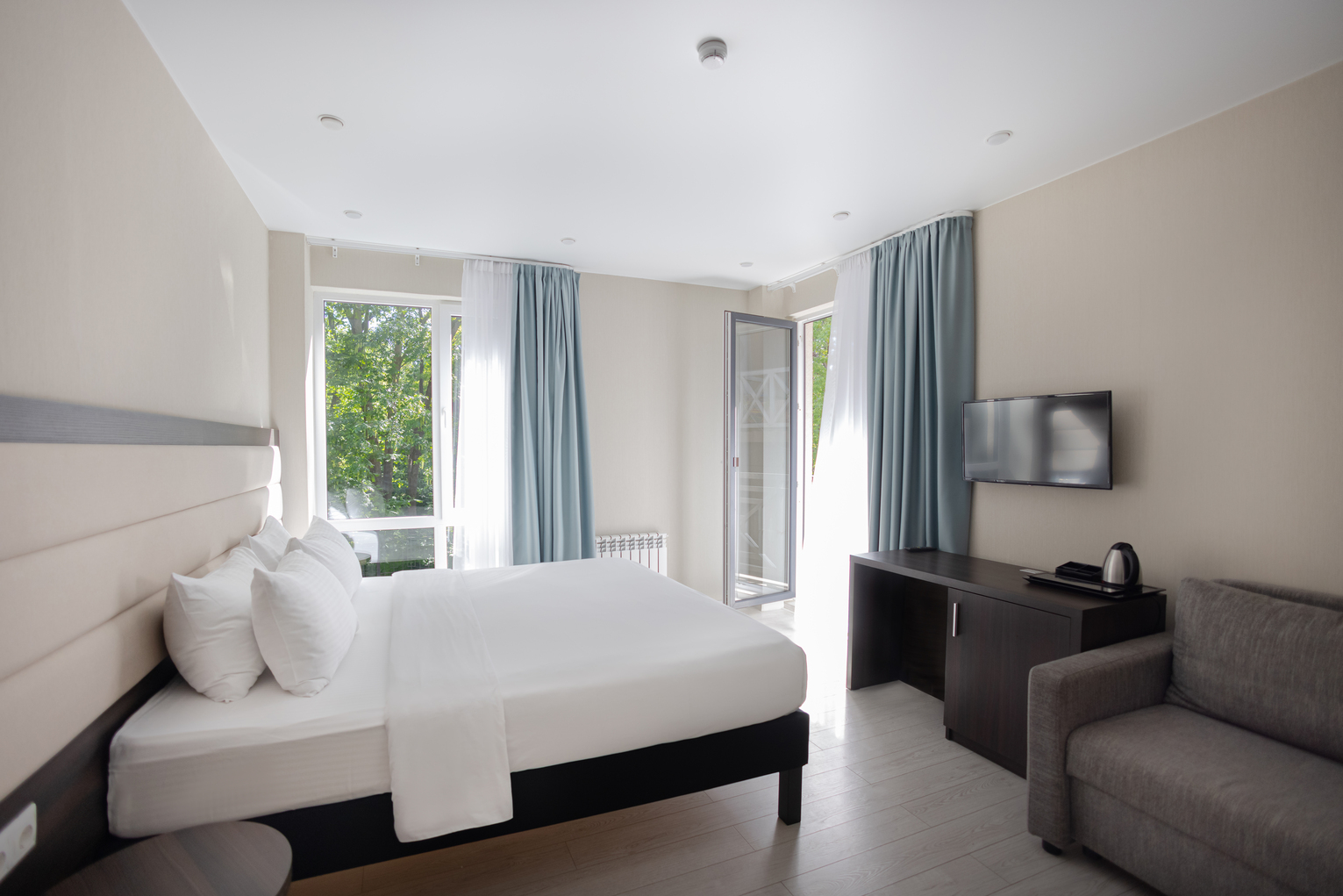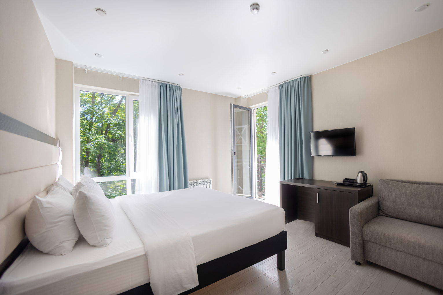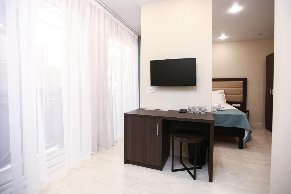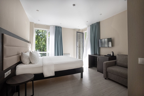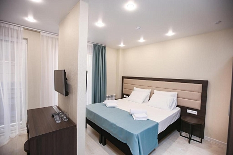 В номере: вешалка, диван раскладной, зеркало, кровать двуспальная, обувная полка, прикроватные столики, стол, стул, тумба багажная, шкаф, мини-холодильник, сплит-система, телевизор ЖК, чайная станция