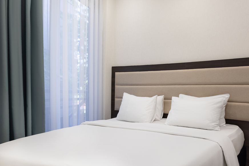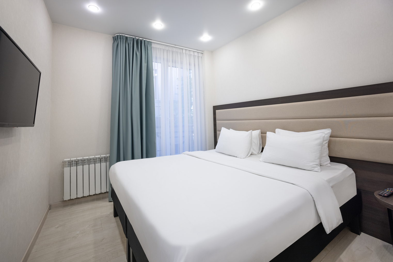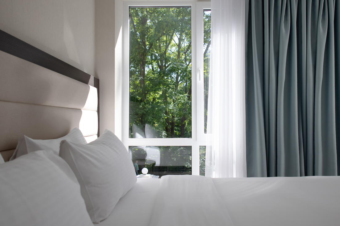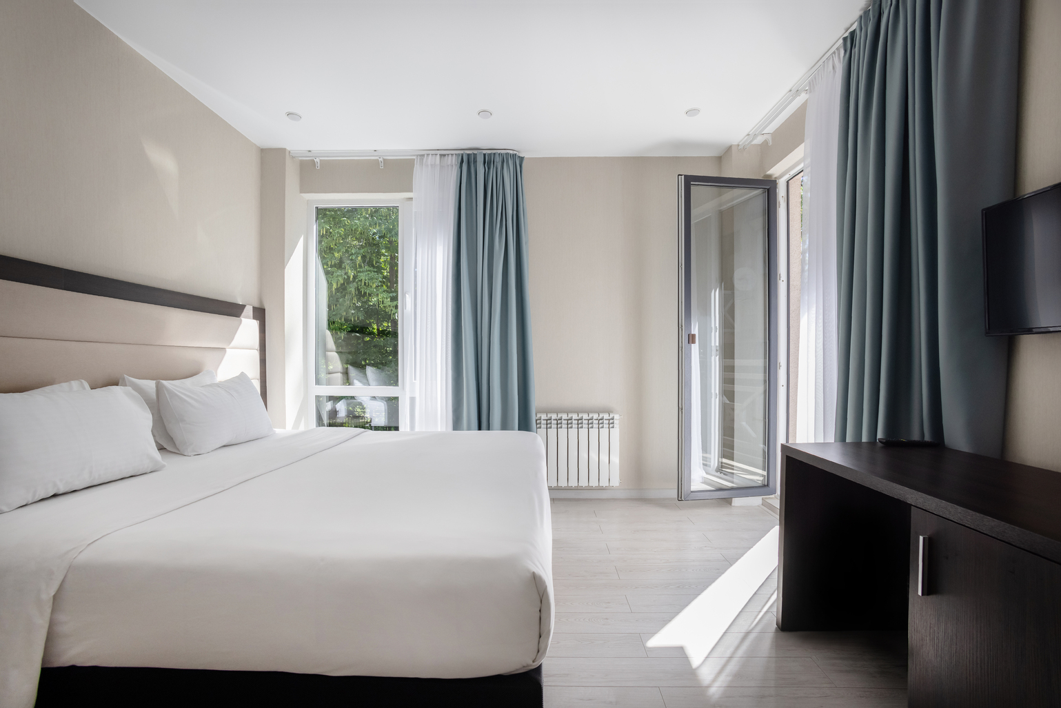 В номере: вешалка, диван раскладной, зеркало, кровать двуспальная, обувная полка, прикроватные столики, стол, стул, тумба багажная, шкаф, мини-холодильник, сплит-система, телевизор ЖК, чайная станция
