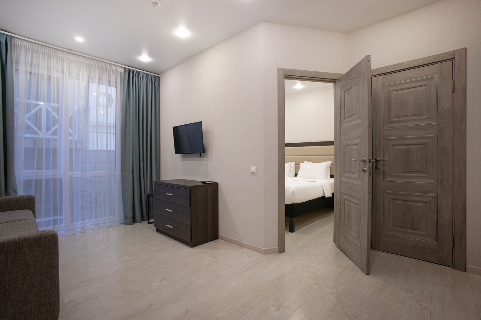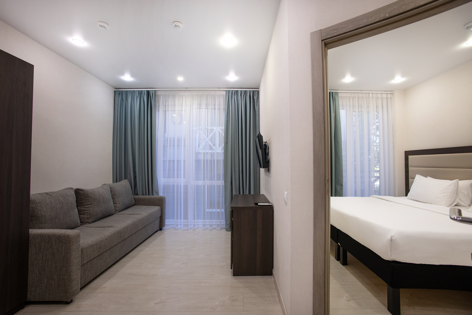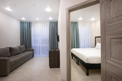 В номере: вешалка, диван раскладной, зеркало, комод, кровать двуспальная, обувная полка, прикроватные столики, стол, стул, тумба багажная, шкаф, мини-холодильник, сплит-система, телевизор ЖК, чайная станция