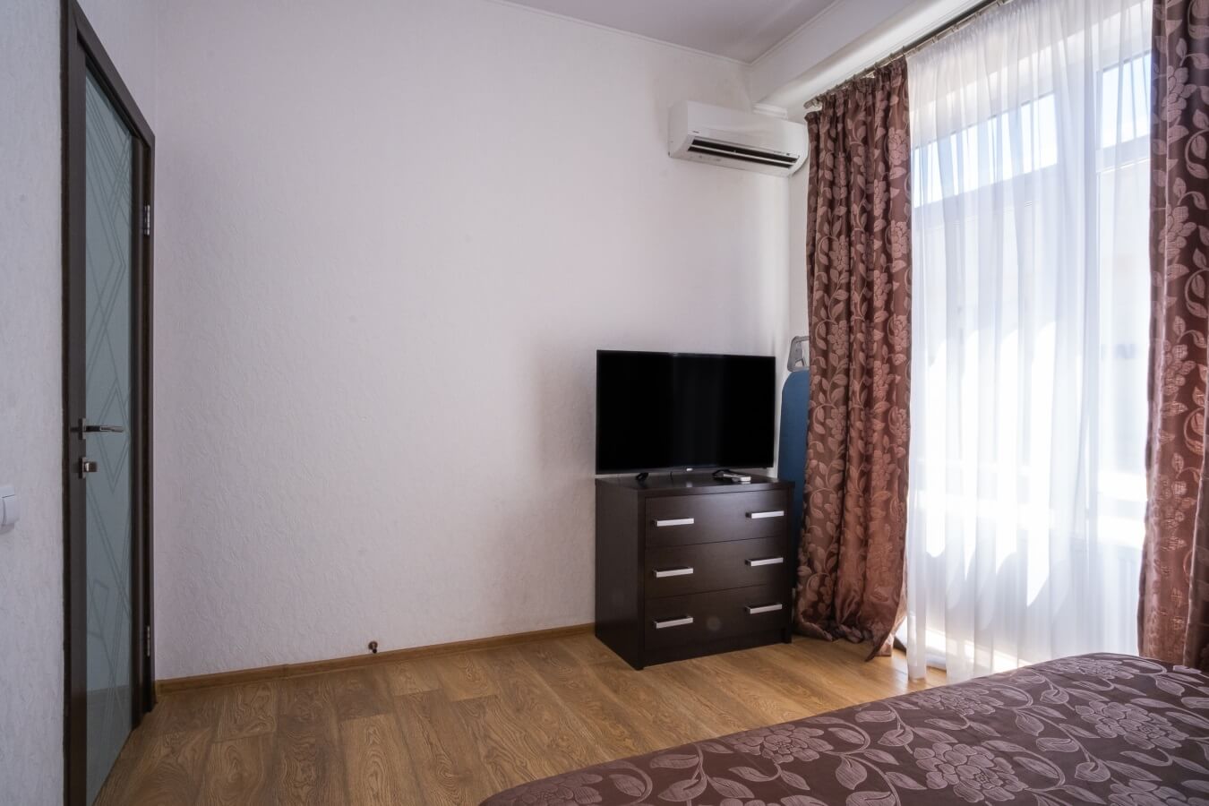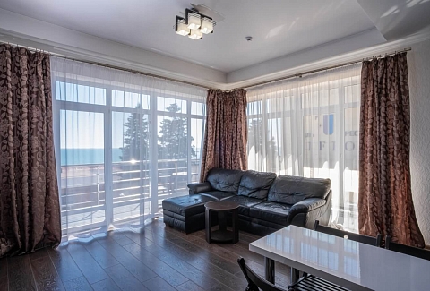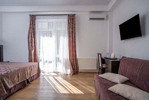 В номере: вешалка, диван, зеркало, кровать двуспальная, прикроватные тумбочки, стол, столик журнальный, стол обеденный, стулья, шкаф, кондиционер, микроволновая печь, мини-холодильник, плита индукционная, пляжные полотенца, сейф, телевизор ЖК, телефон, чайный набор посуды, электрочайник