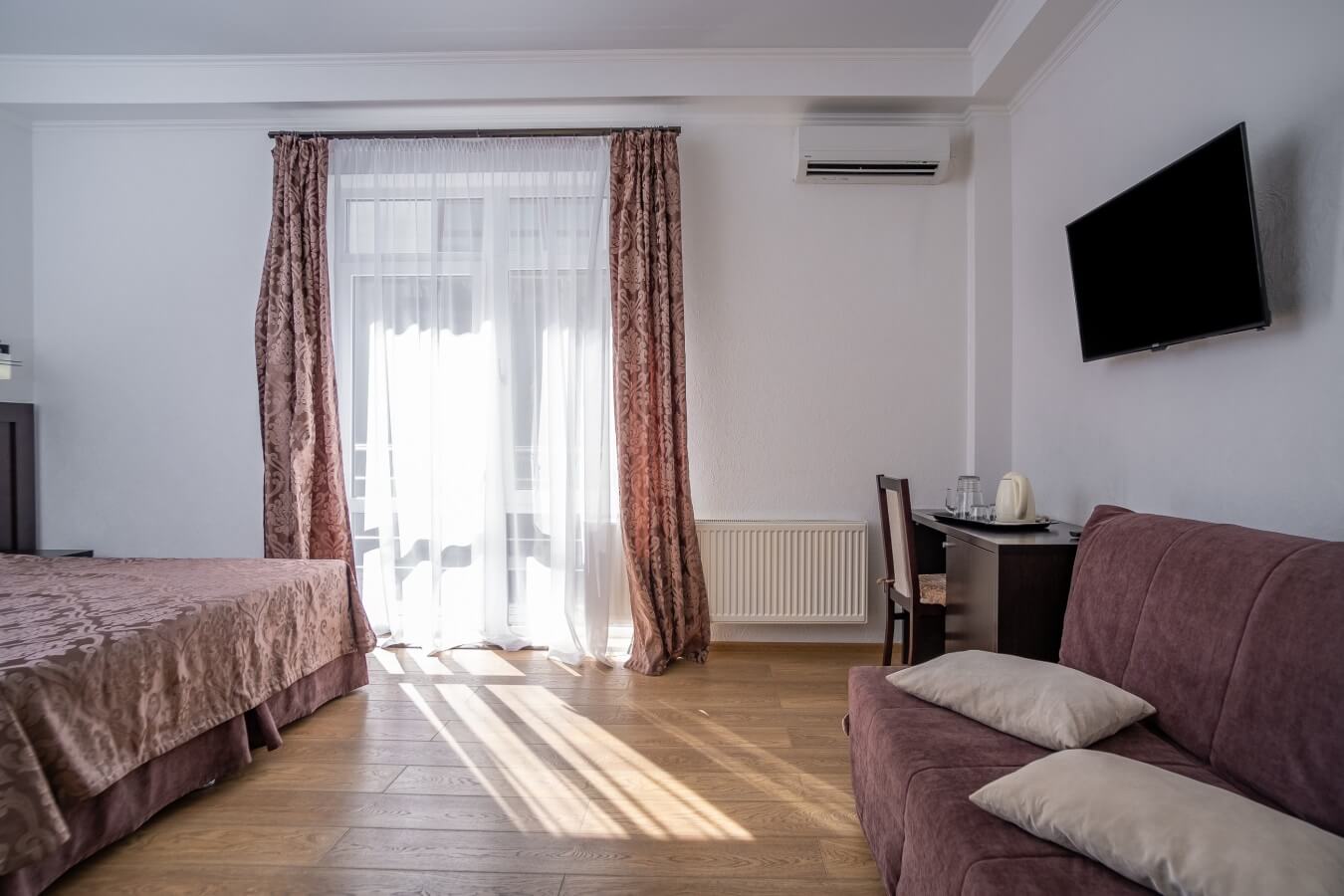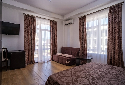 В номере: вешалка, диван, кровати односпальные /одна двуспальная кровать, прикроватные тумбочки, стол, стул, шкаф, кондиционер, мини-холодильник, пляжные полотенца, сейф, телевизор ЖК, телефон, чайный набор посуды, электрочайник