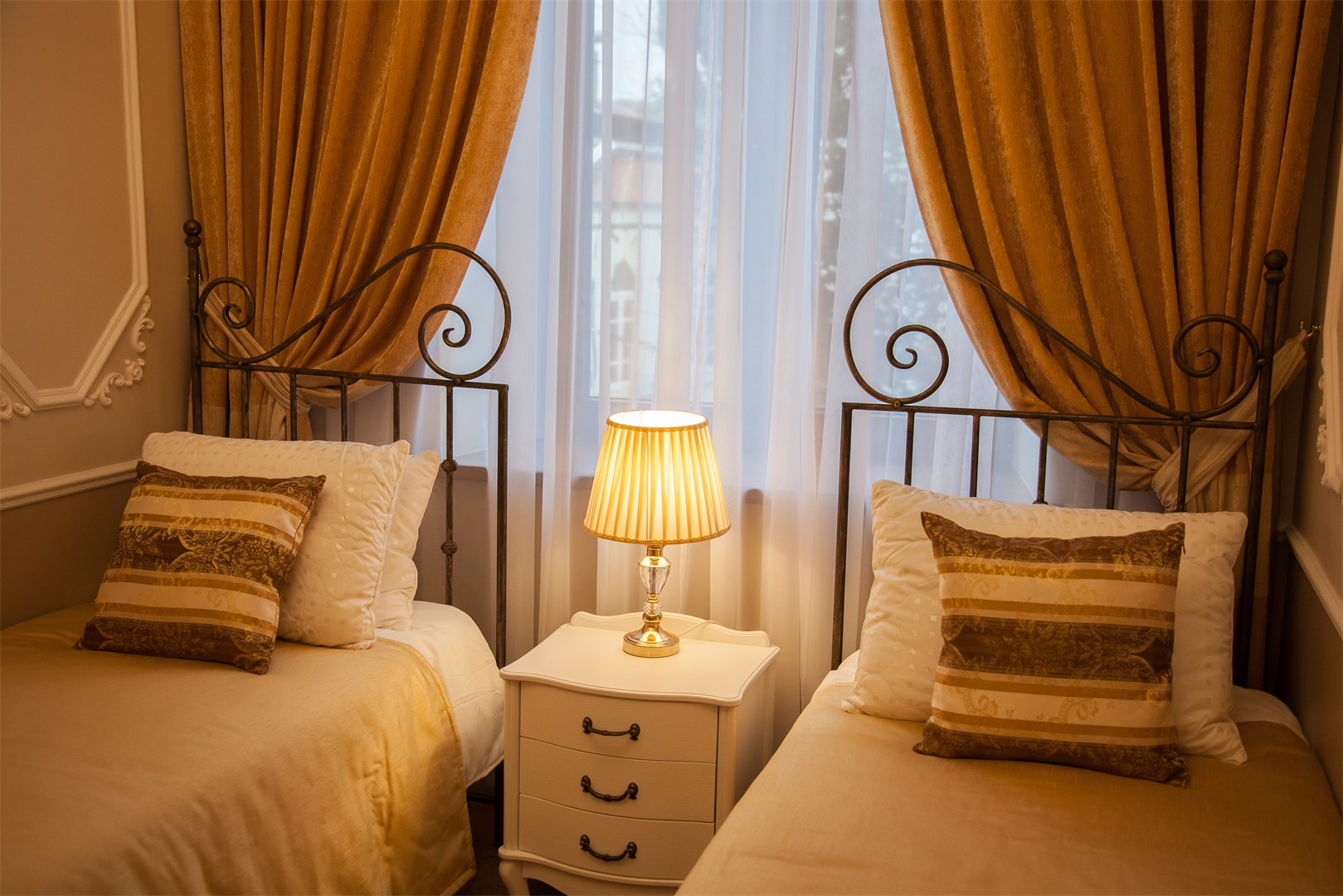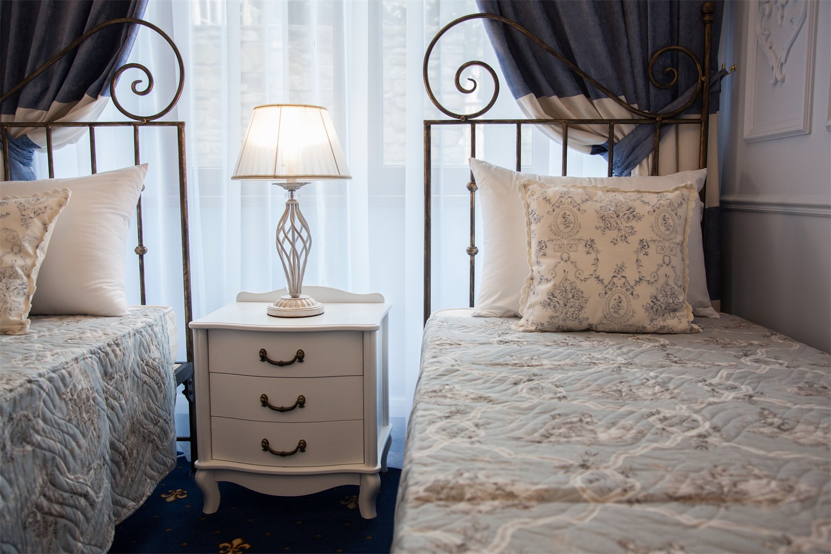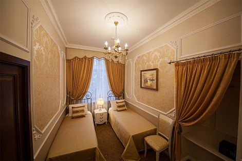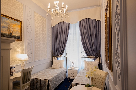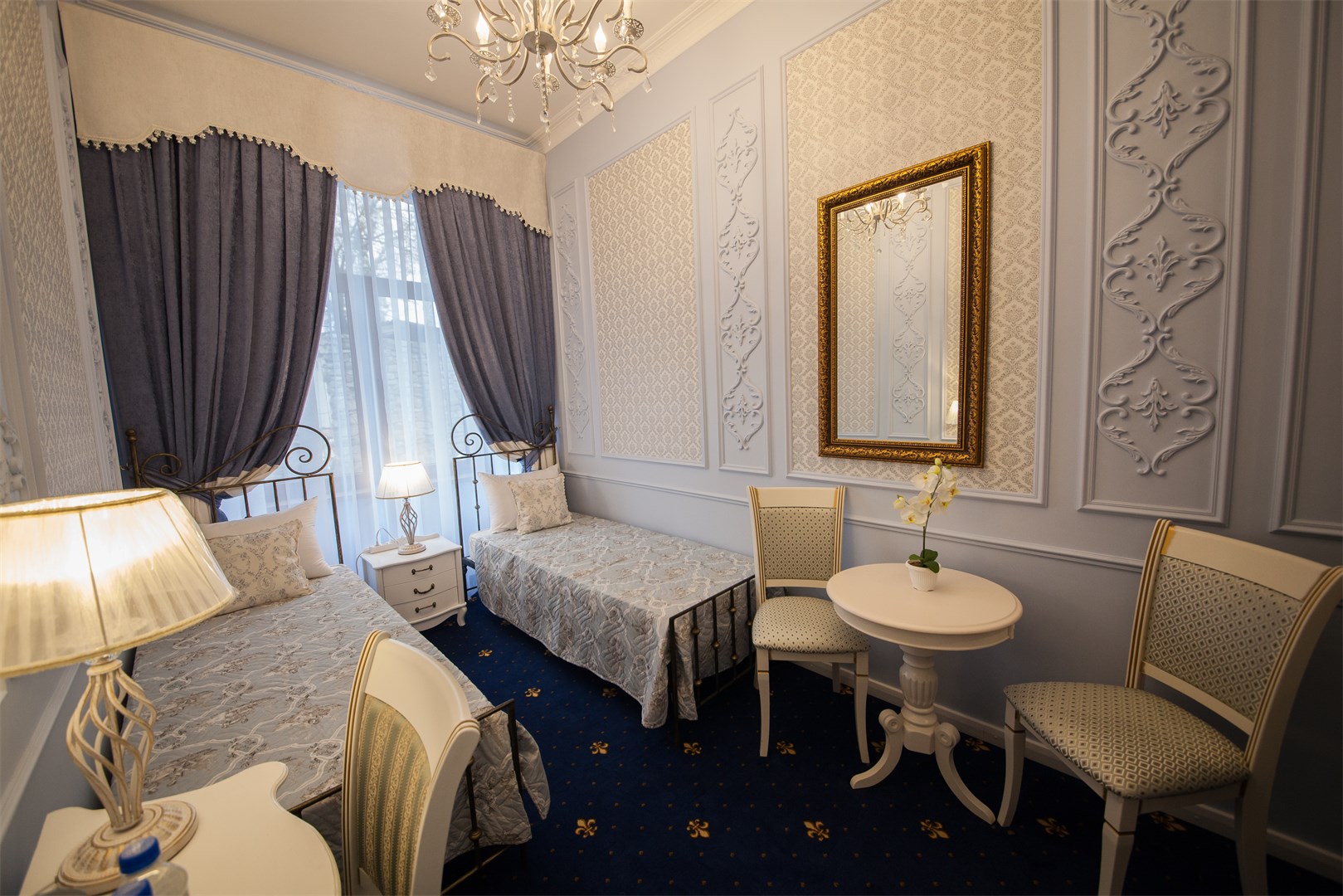 В номере: вешалка, зеркало, кровати односпальные, прикроватные тумбочки, столик журнальный, стулья, кондиционер, мини-холодильник, сейф, телевизор, чайник, чайный набор посуды