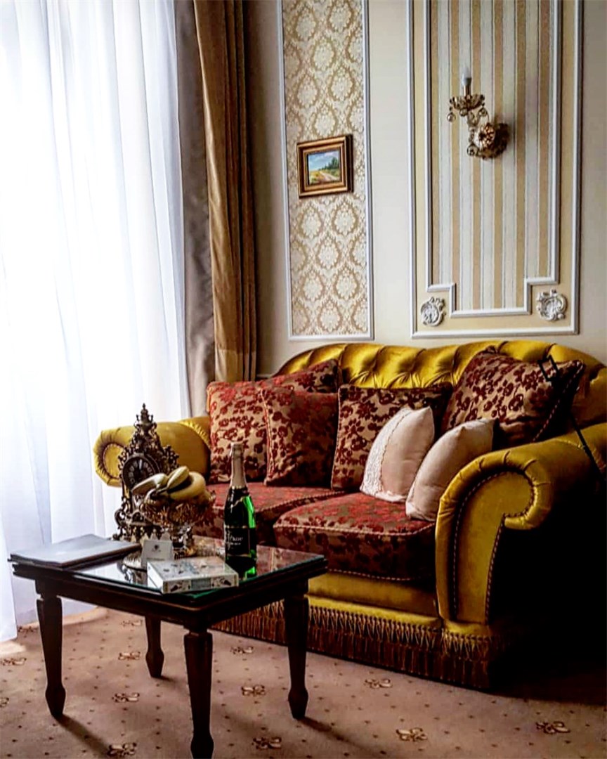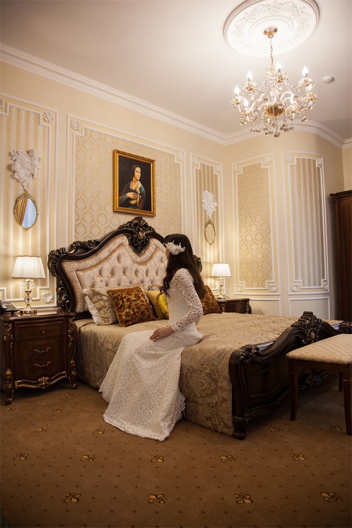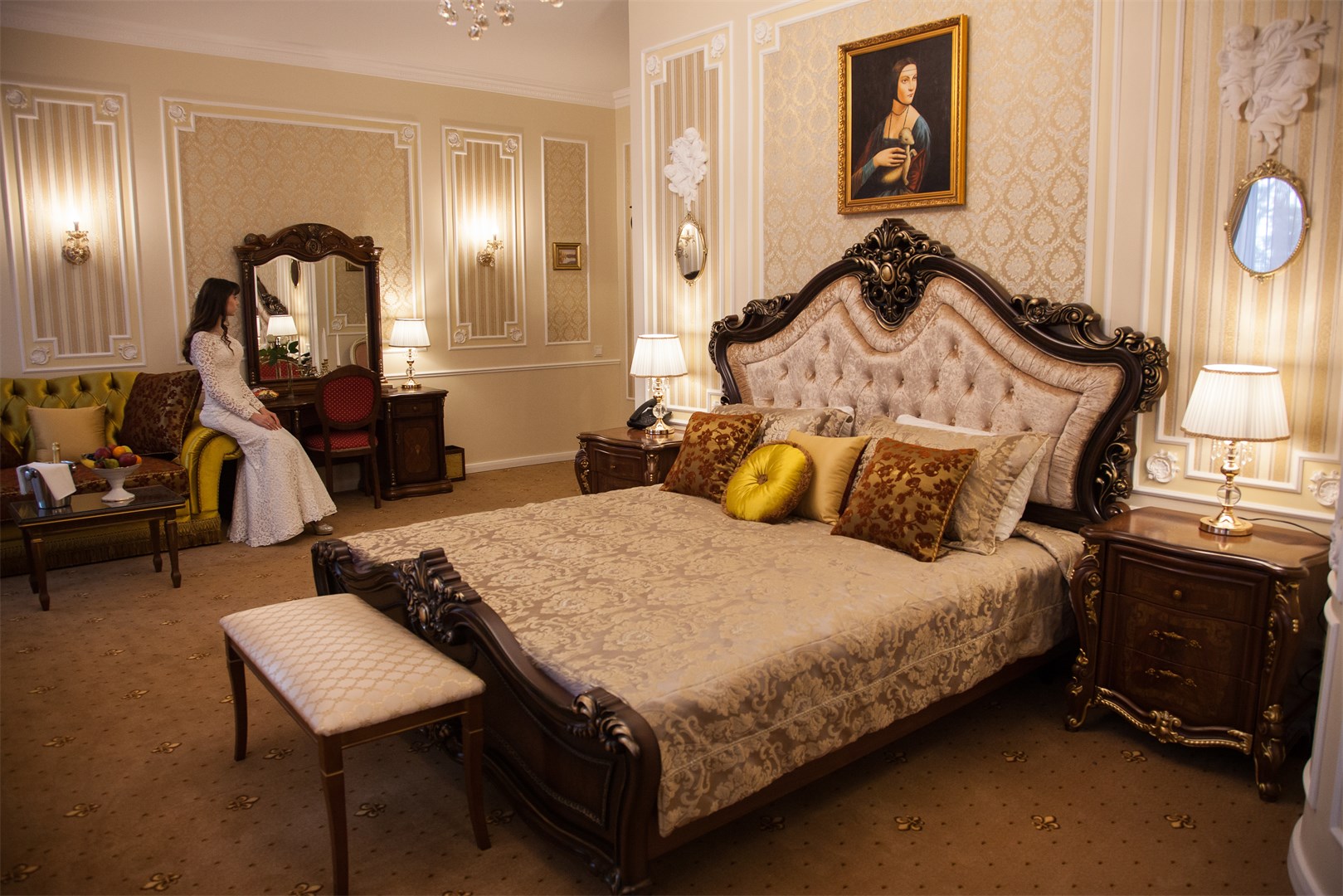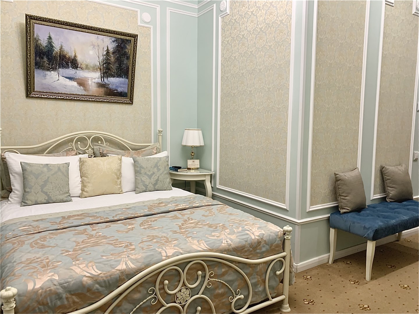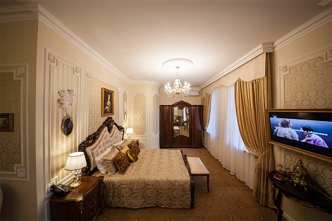 В номере: вешалка, диван раскладной, зеркало, кровать двуспальная, прикроватные тумбочки, столик журнальный, стул, шкаф, кондиционер, мини-холодильник, сейф, телевизор, чайник, чайный набор посуды