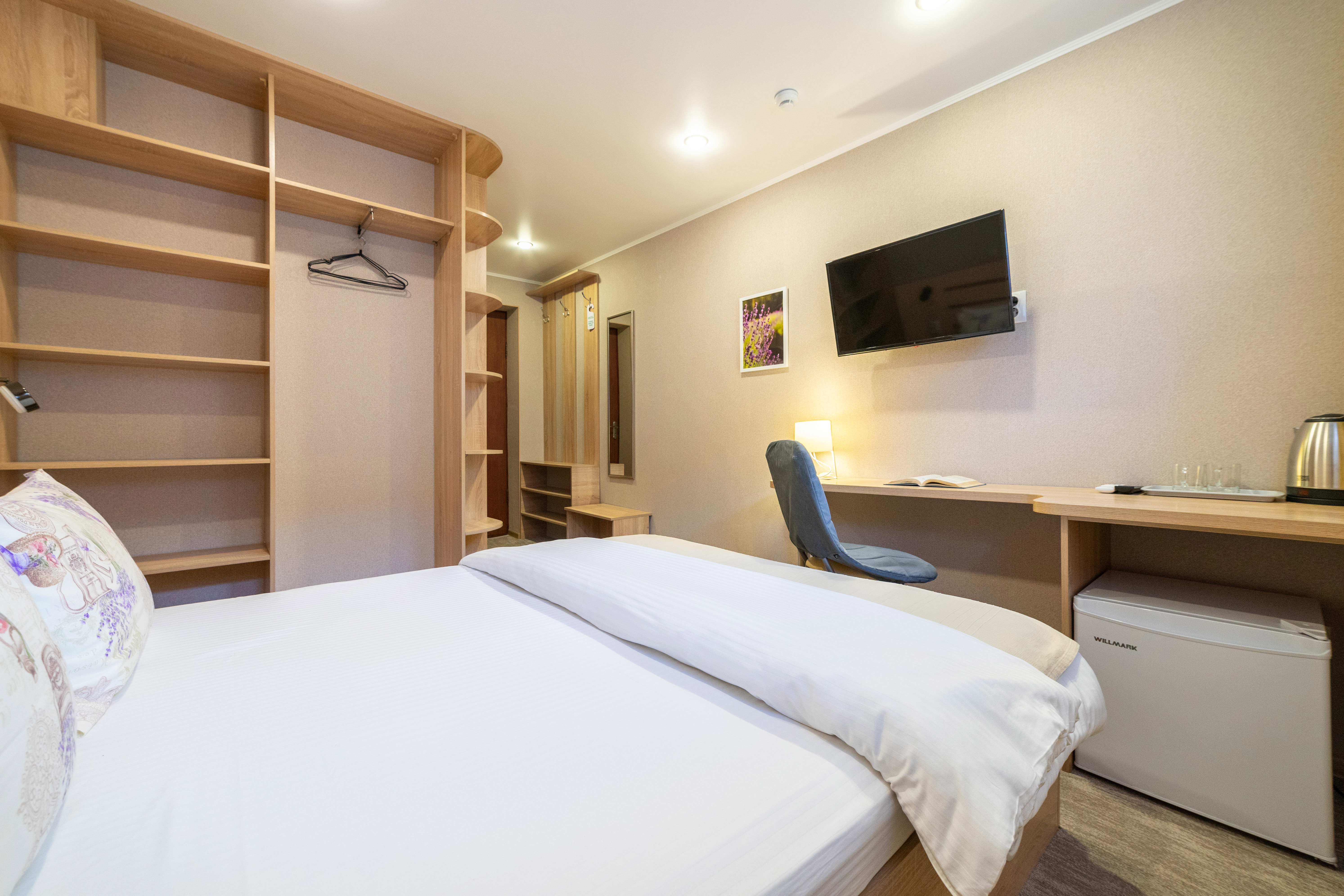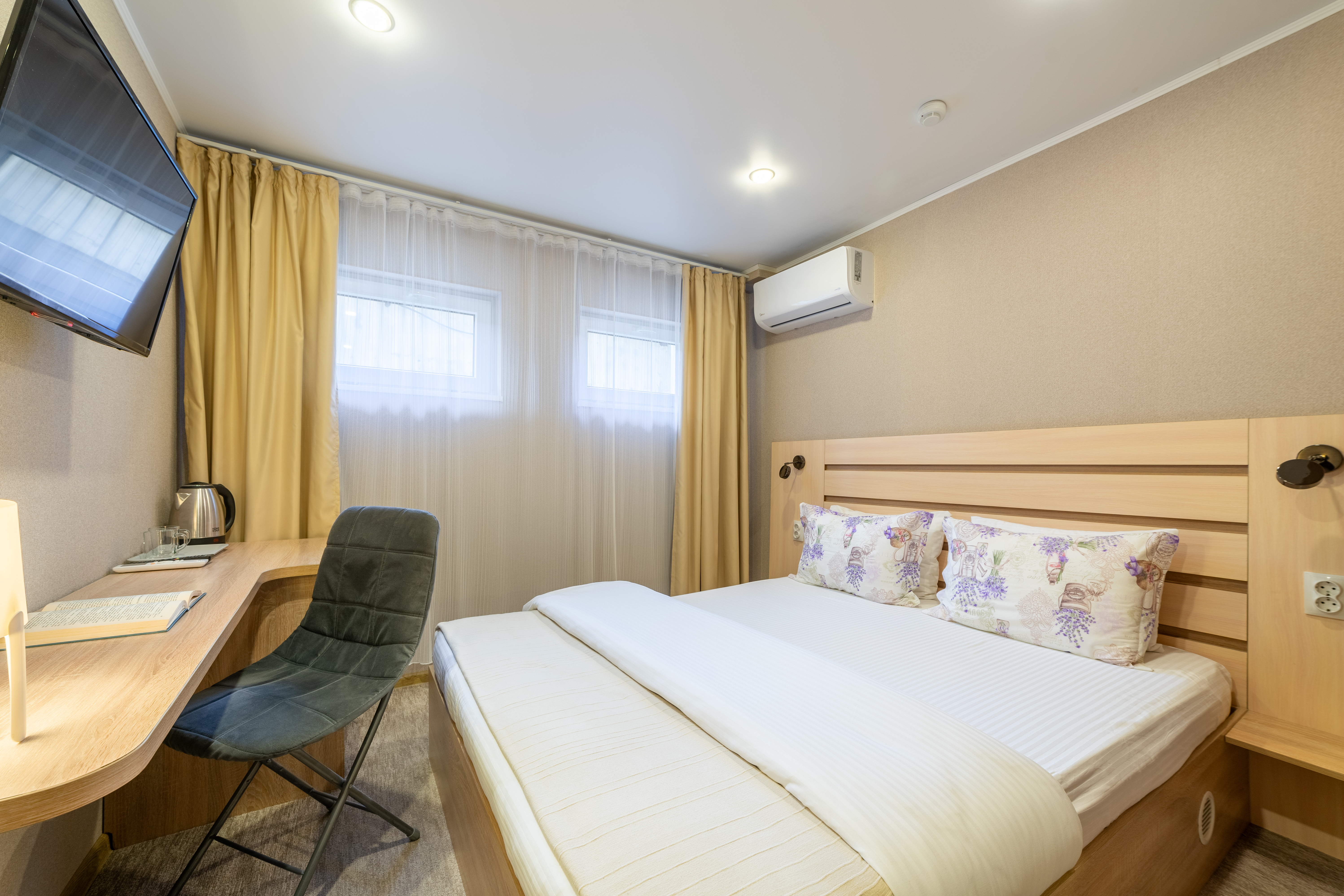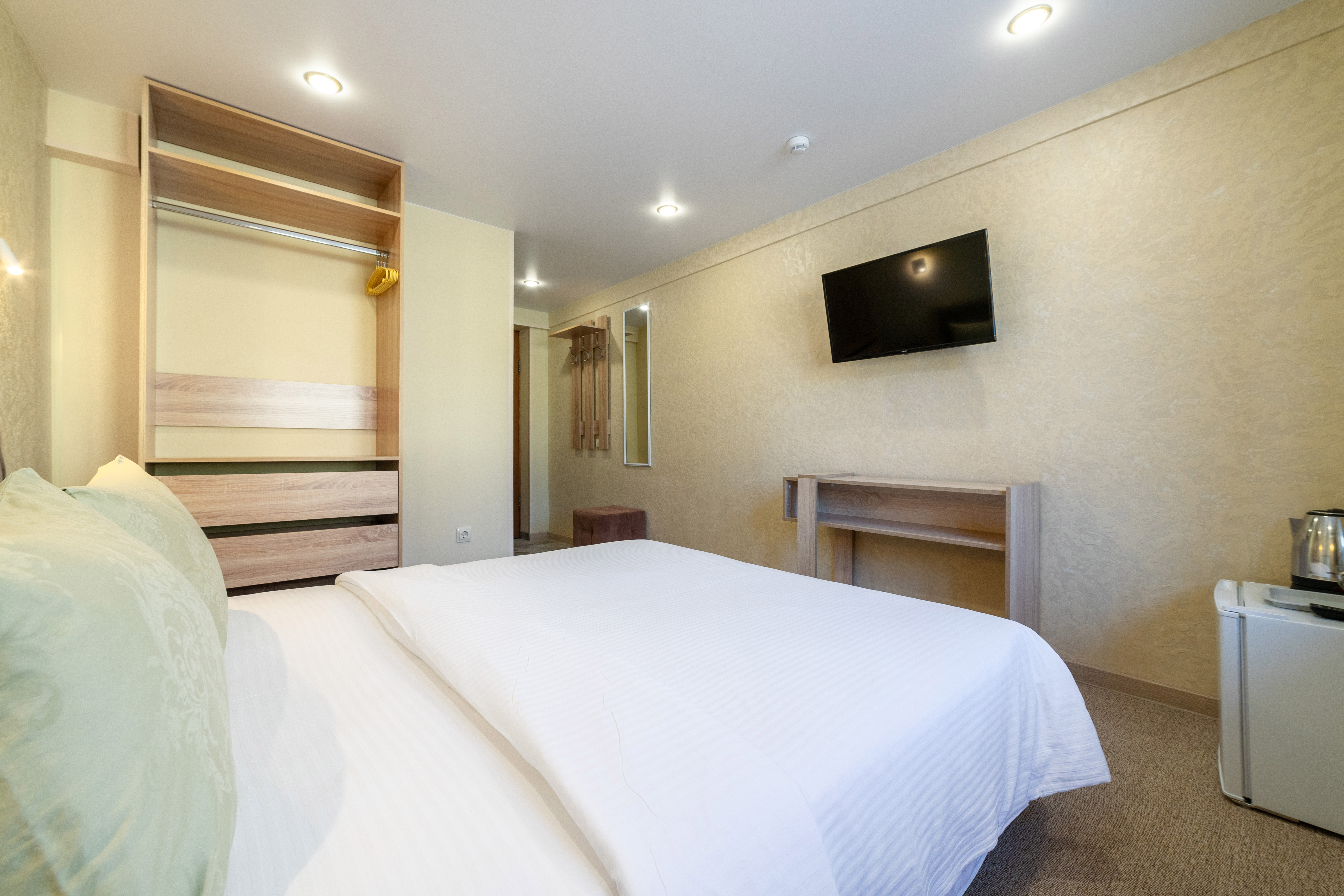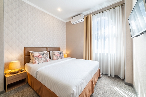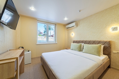 В номере: вешалка, зеркало, кровать двуспальная, прикроватные тумбочки, стол, стулья, шкаф, кондиционер, мини-холодильник, телевизор