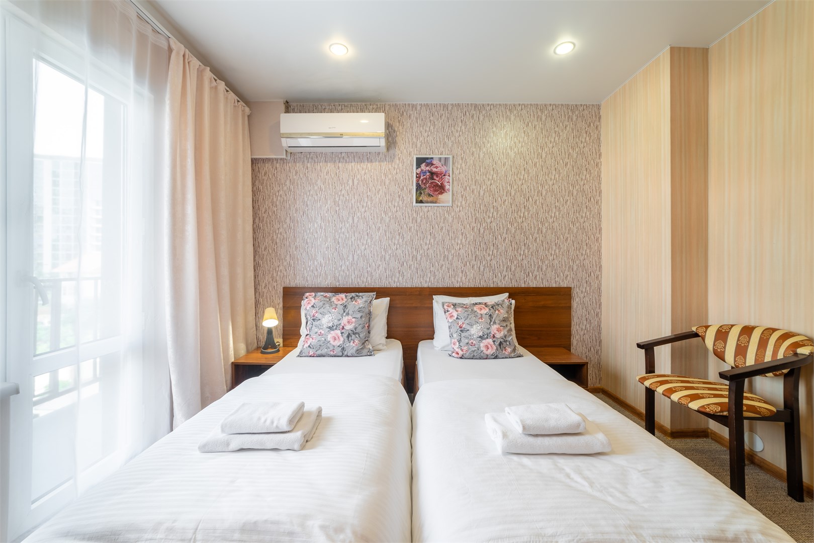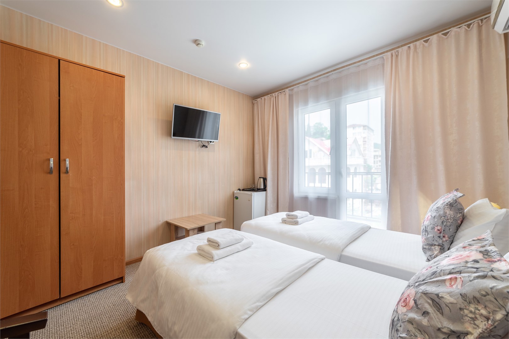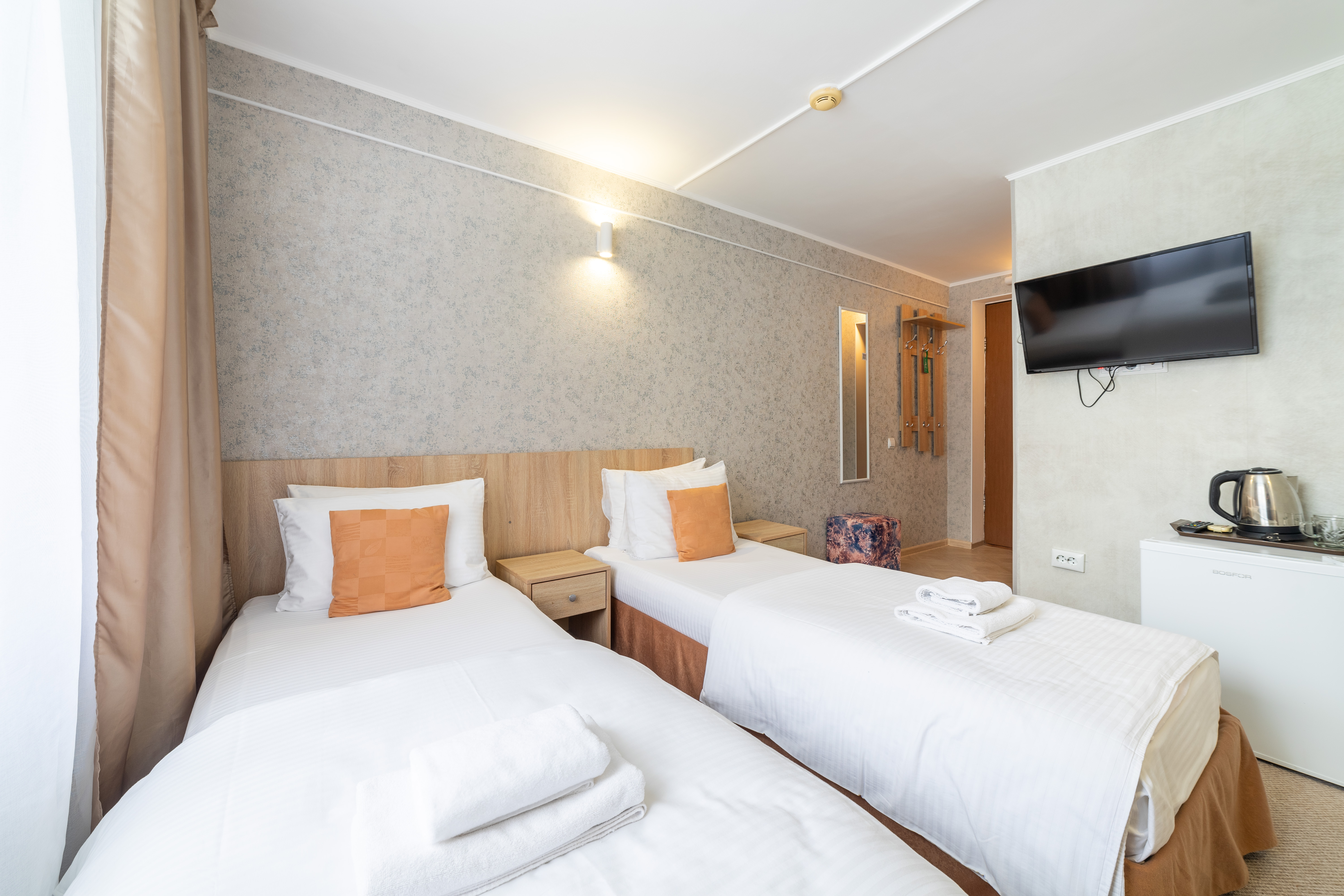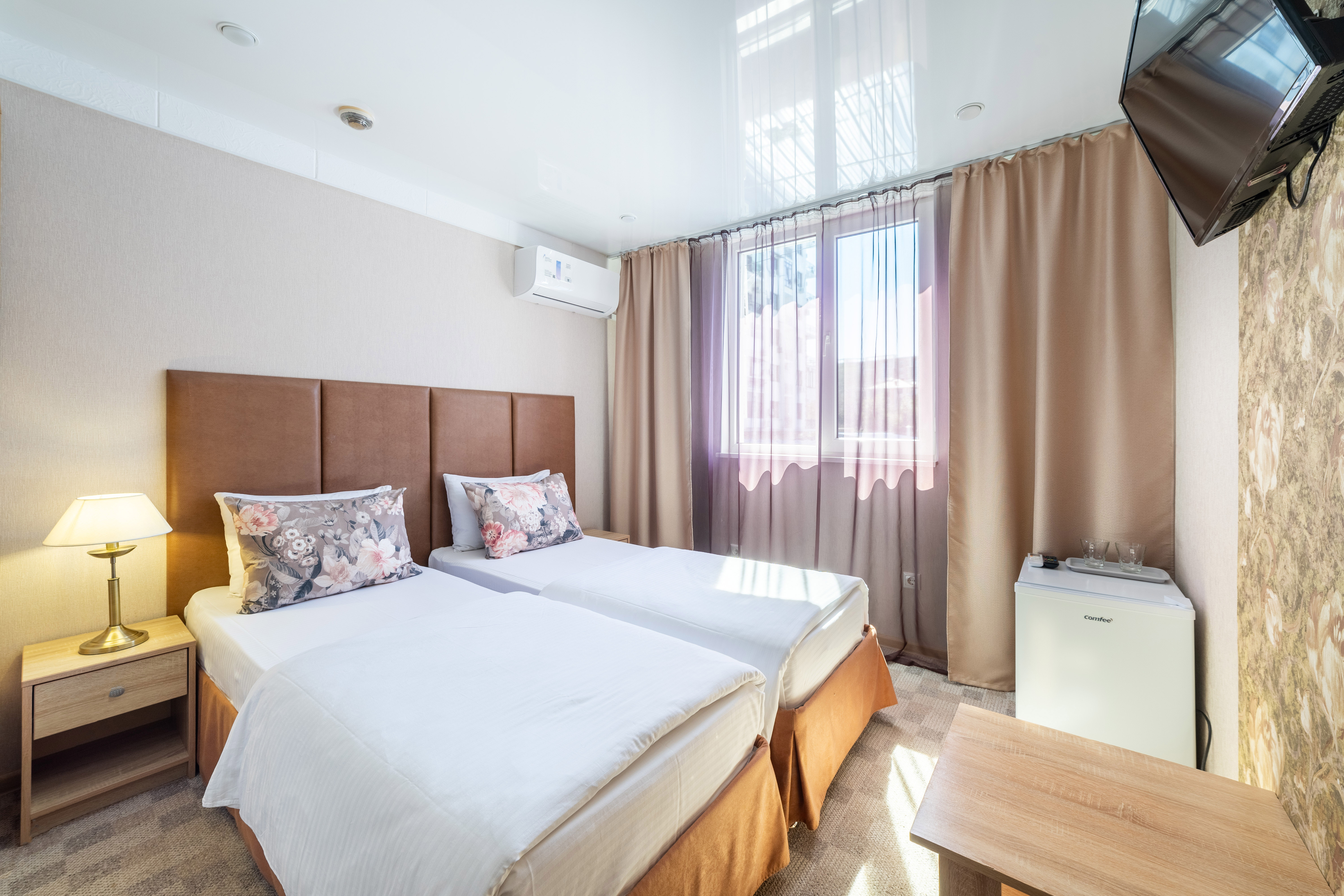 В номере: вешалка, зеркало, кровати односпальные, прикроватные тумбочки, стол, стулья, шкаф, кондиционер, мини-холодильник, телевизор