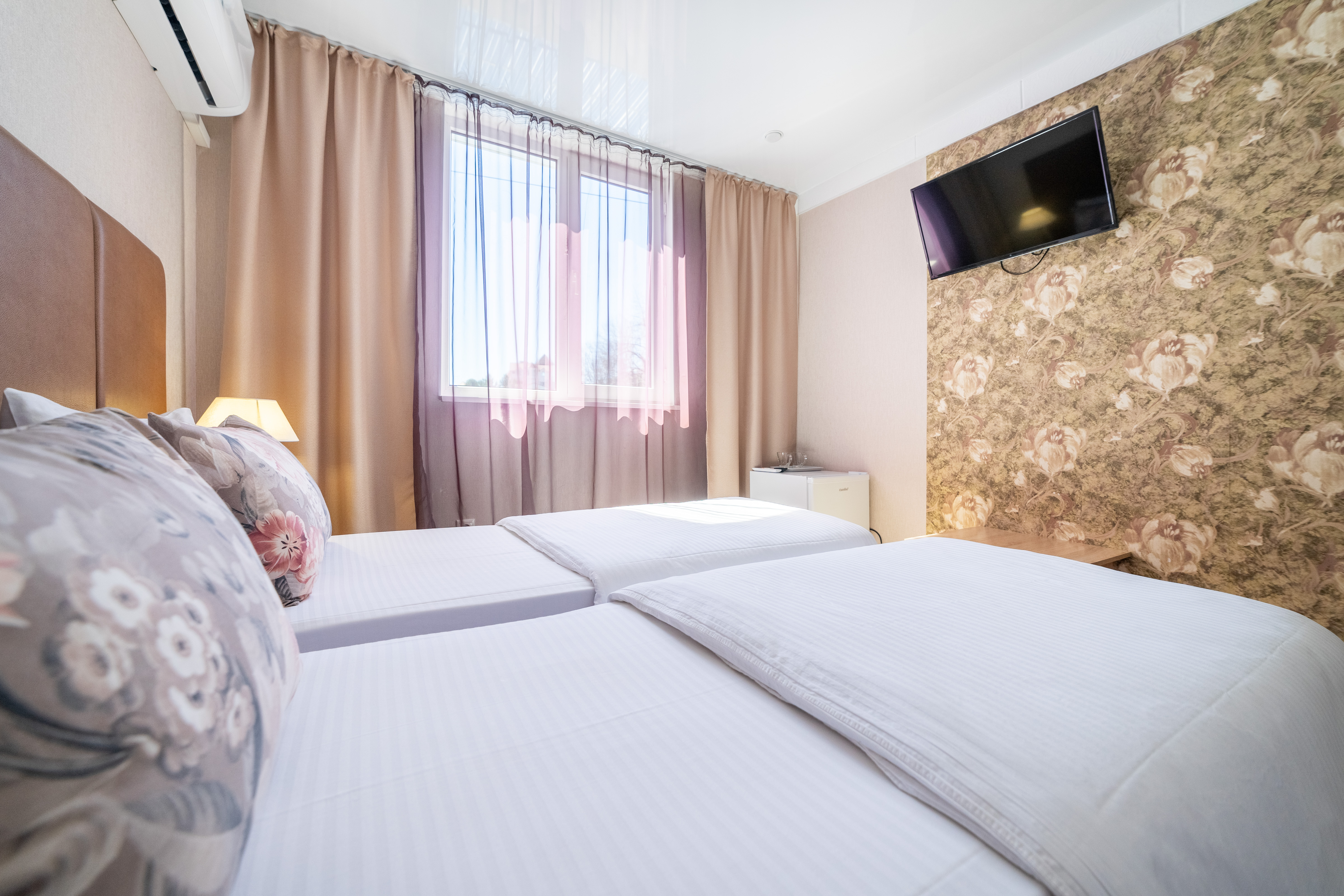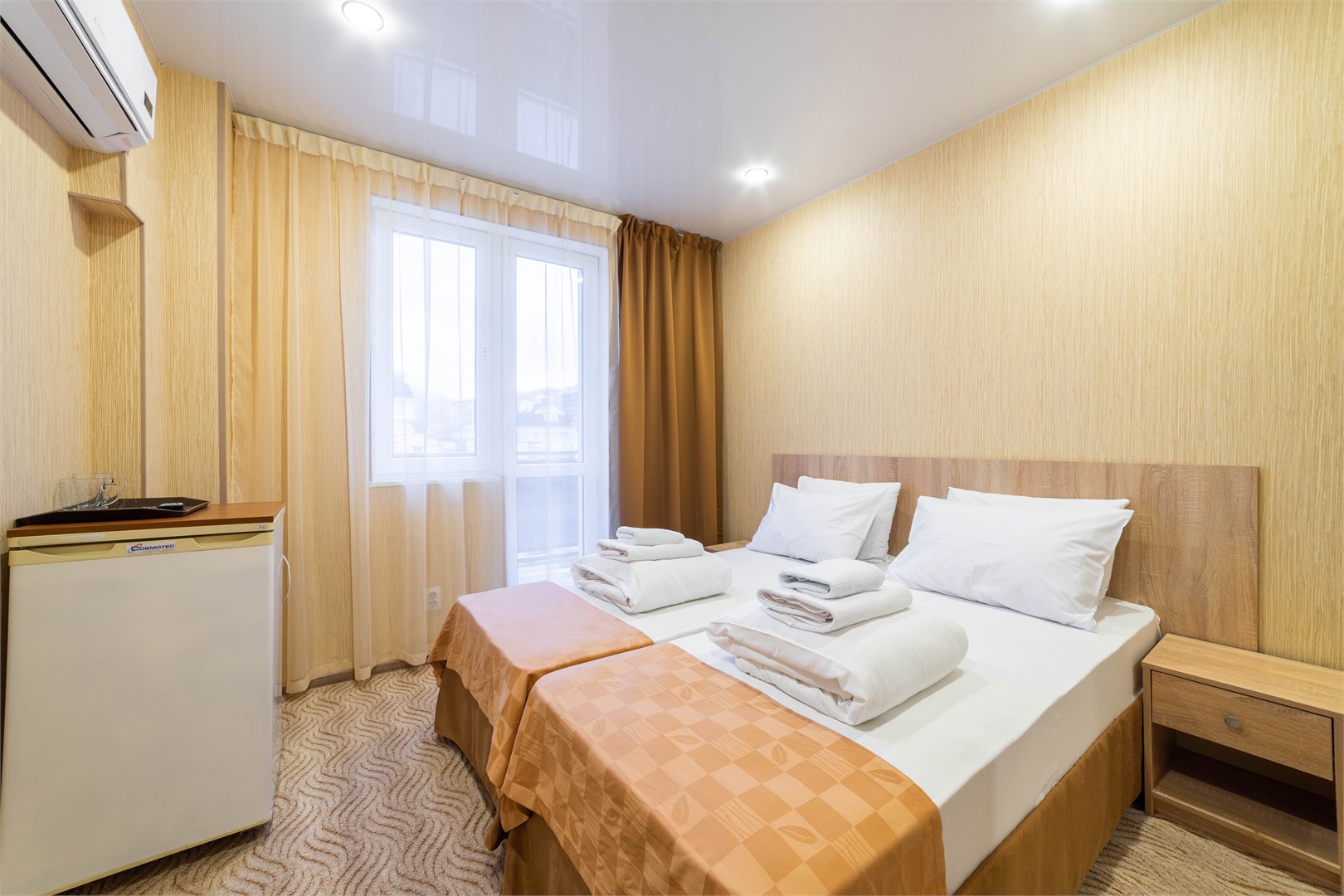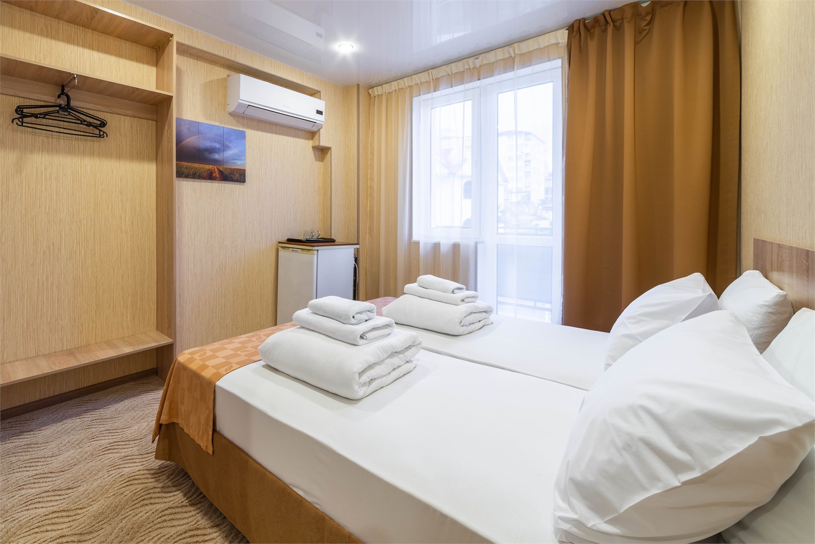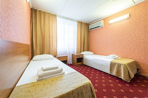В номере: вешалка, зеркало, кровати односпальные, прикроватные тумбочки, стол, стулья, шкаф, кондиционер, мини-холодильник, телевизор