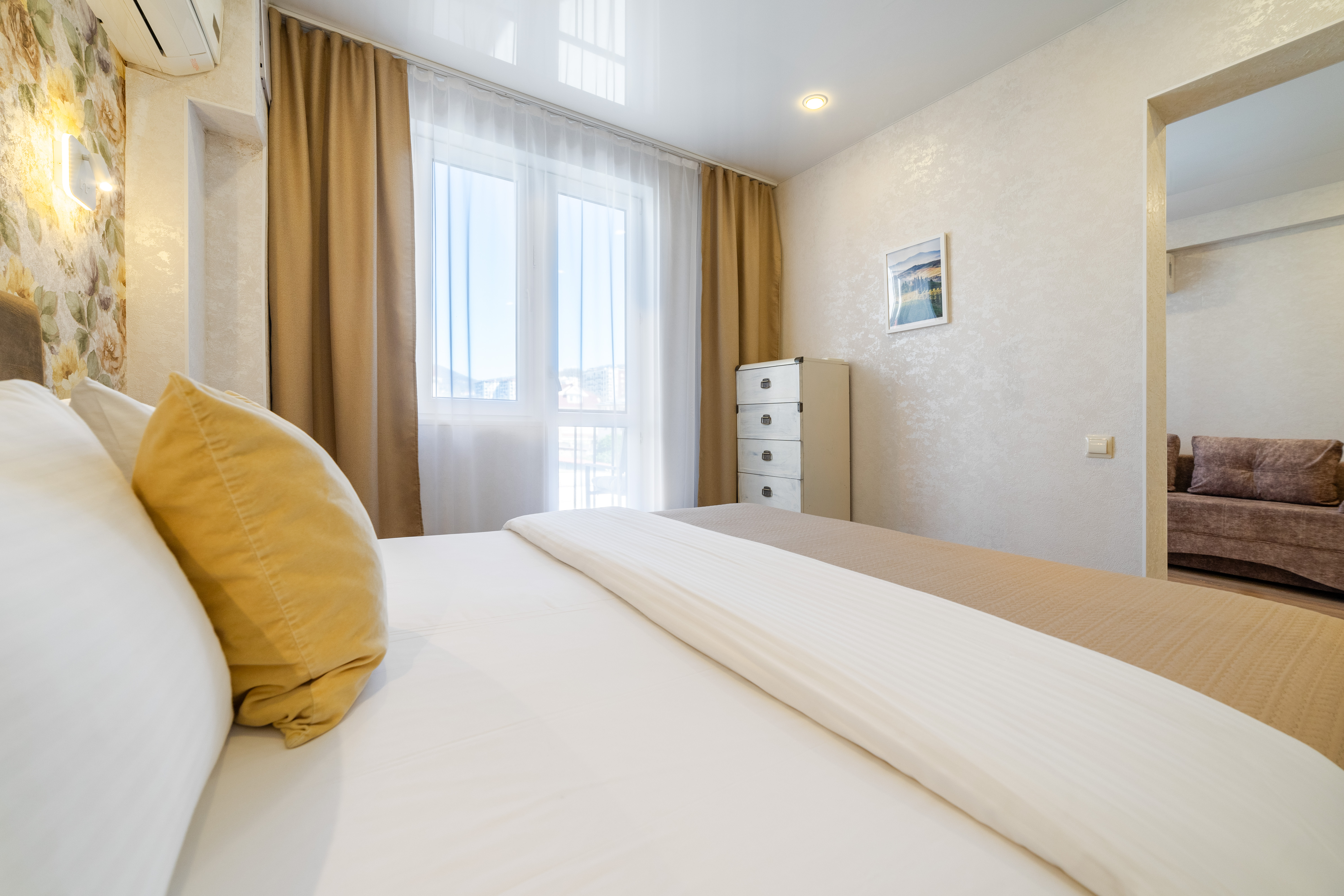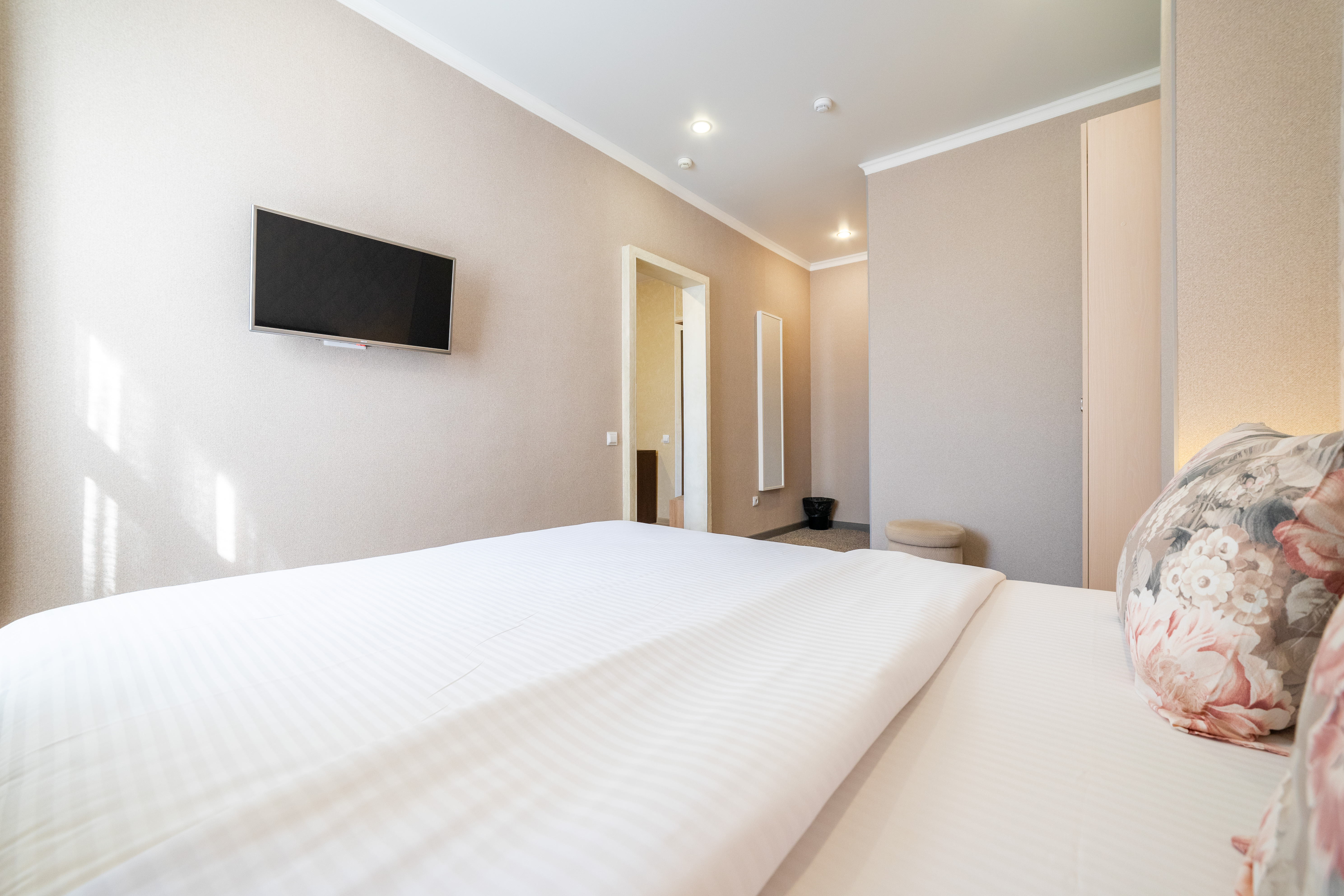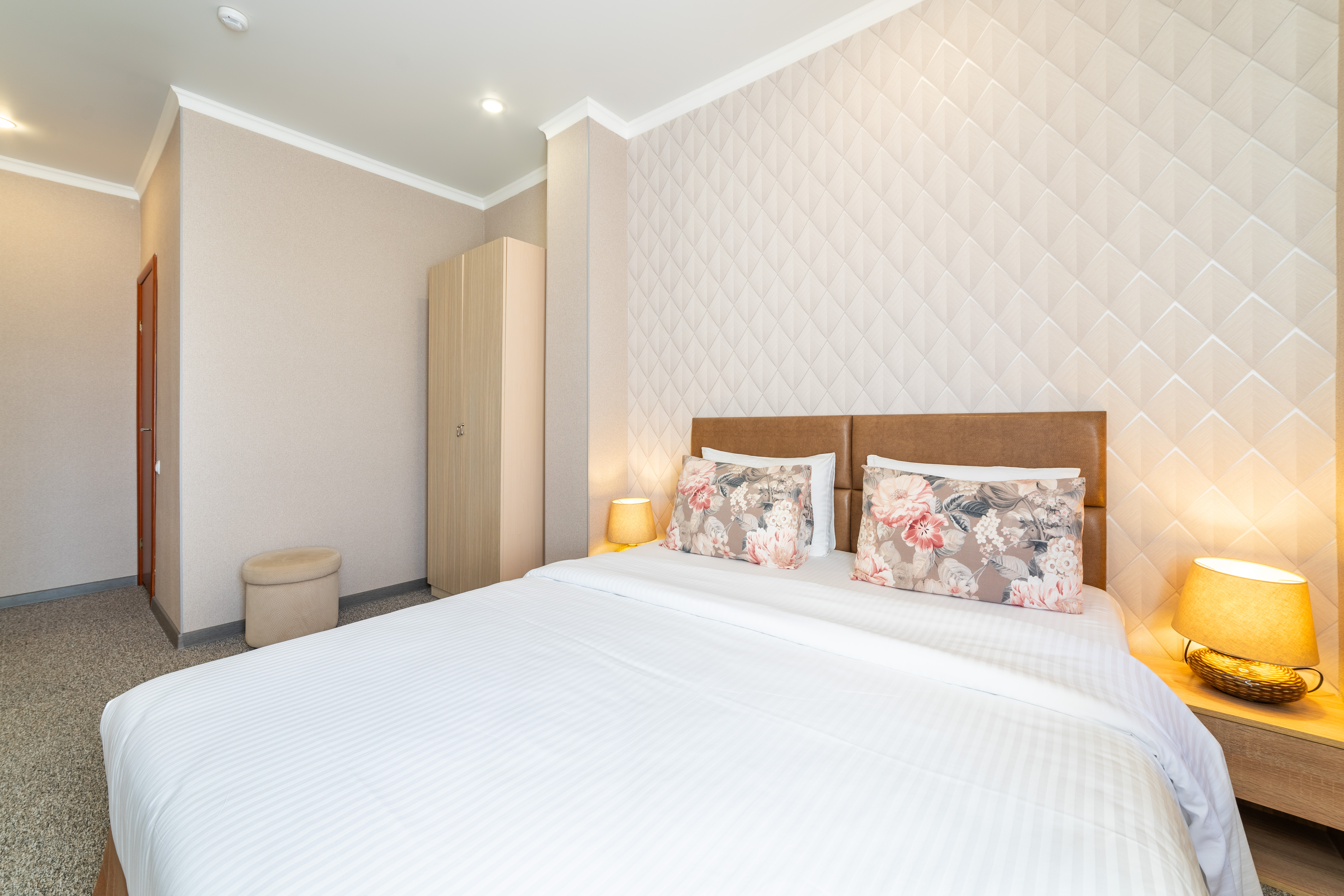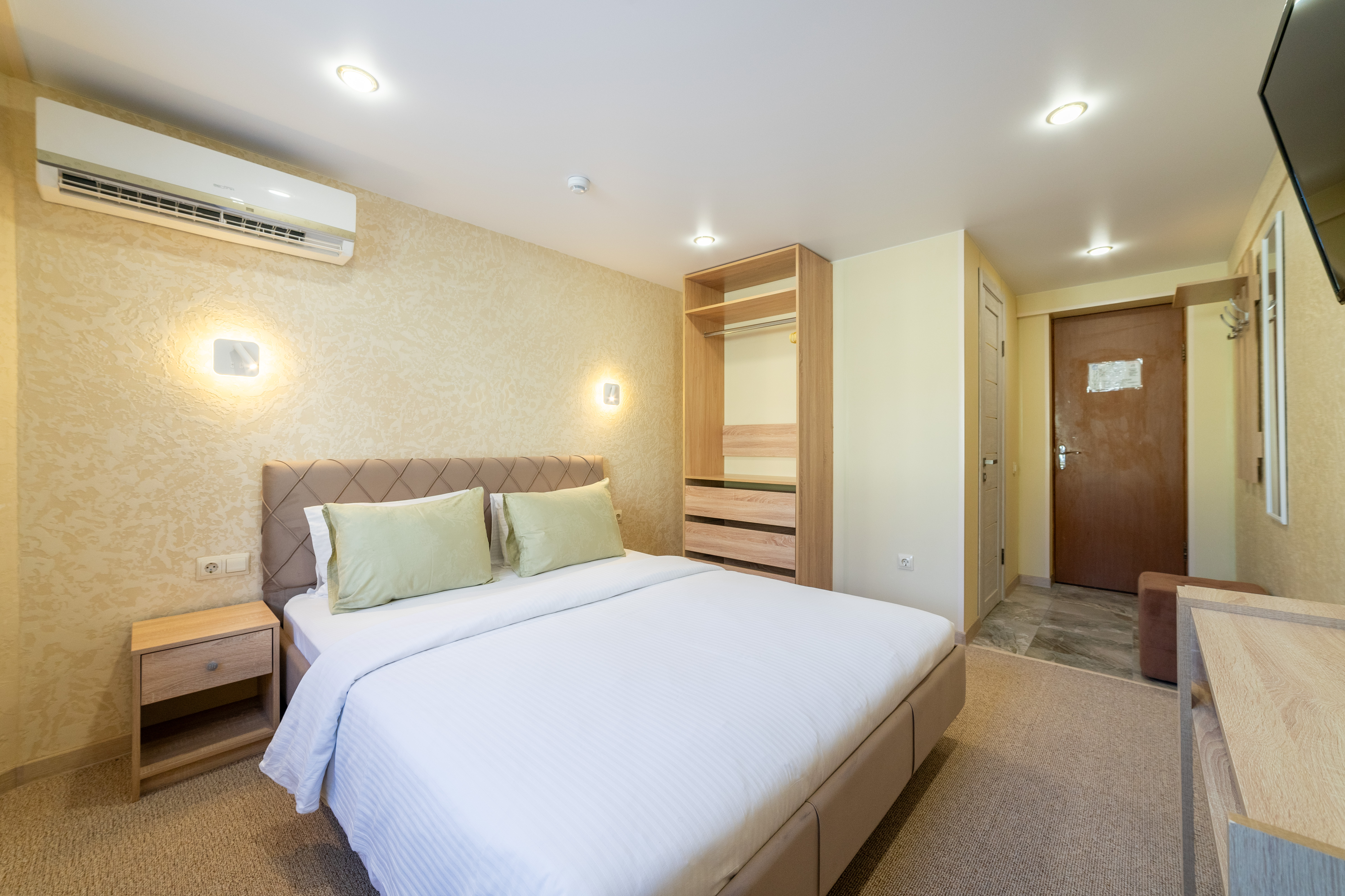 В номере: вешалка, диван раскладной, зеркало, кровать двуспальная, прикроватные тумбочки, стол, стулья, шкаф, кондиционер, мини-холодильник, телевизор, чайник