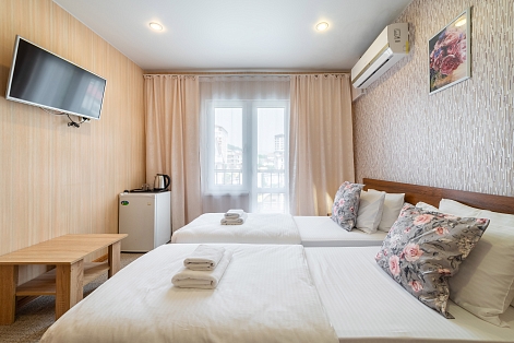 В номере: вешалка, зеркало, кровати односпальные, прикроватные тумбочки, стол, стулья, шкаф, кондиционер, мини-холодильник, пляжные полотенца, телевизор, электрочайник