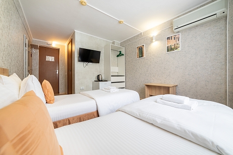 В номере: вешалка, зеркало, кресло-кровать, кровати односпальные, прикроватные тумбочки, стол, стул, шкаф, кондиционер, мини-холодильник, телевизор