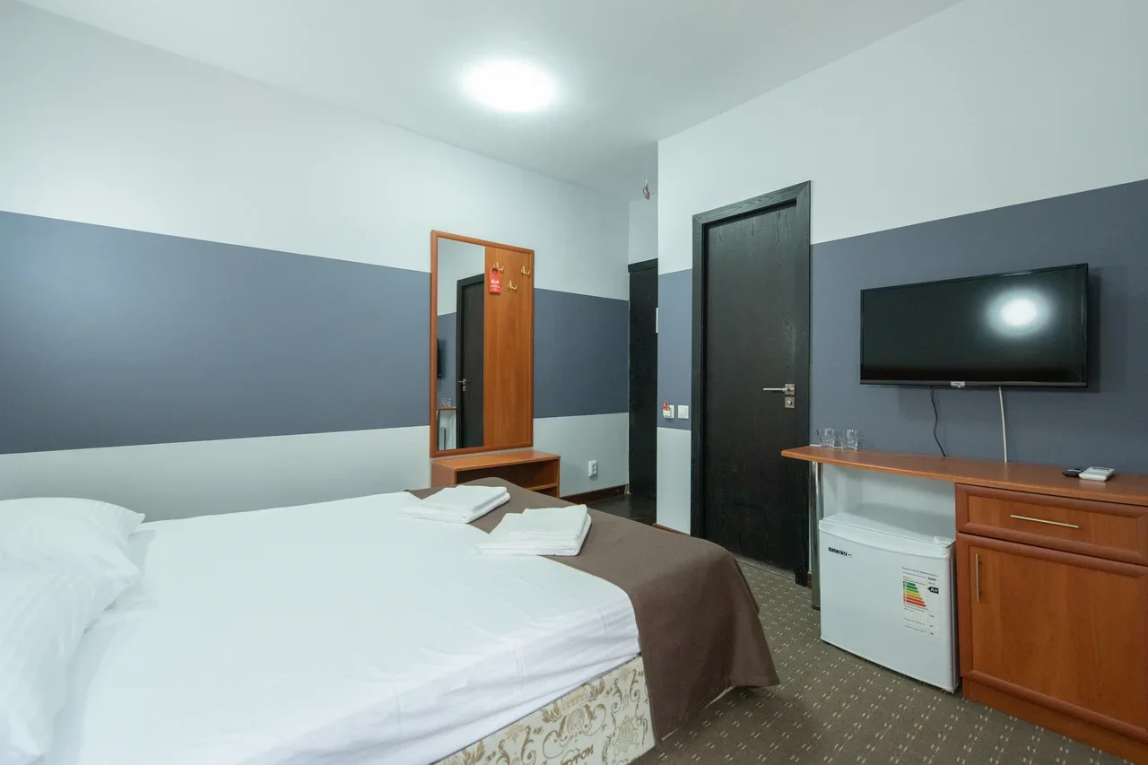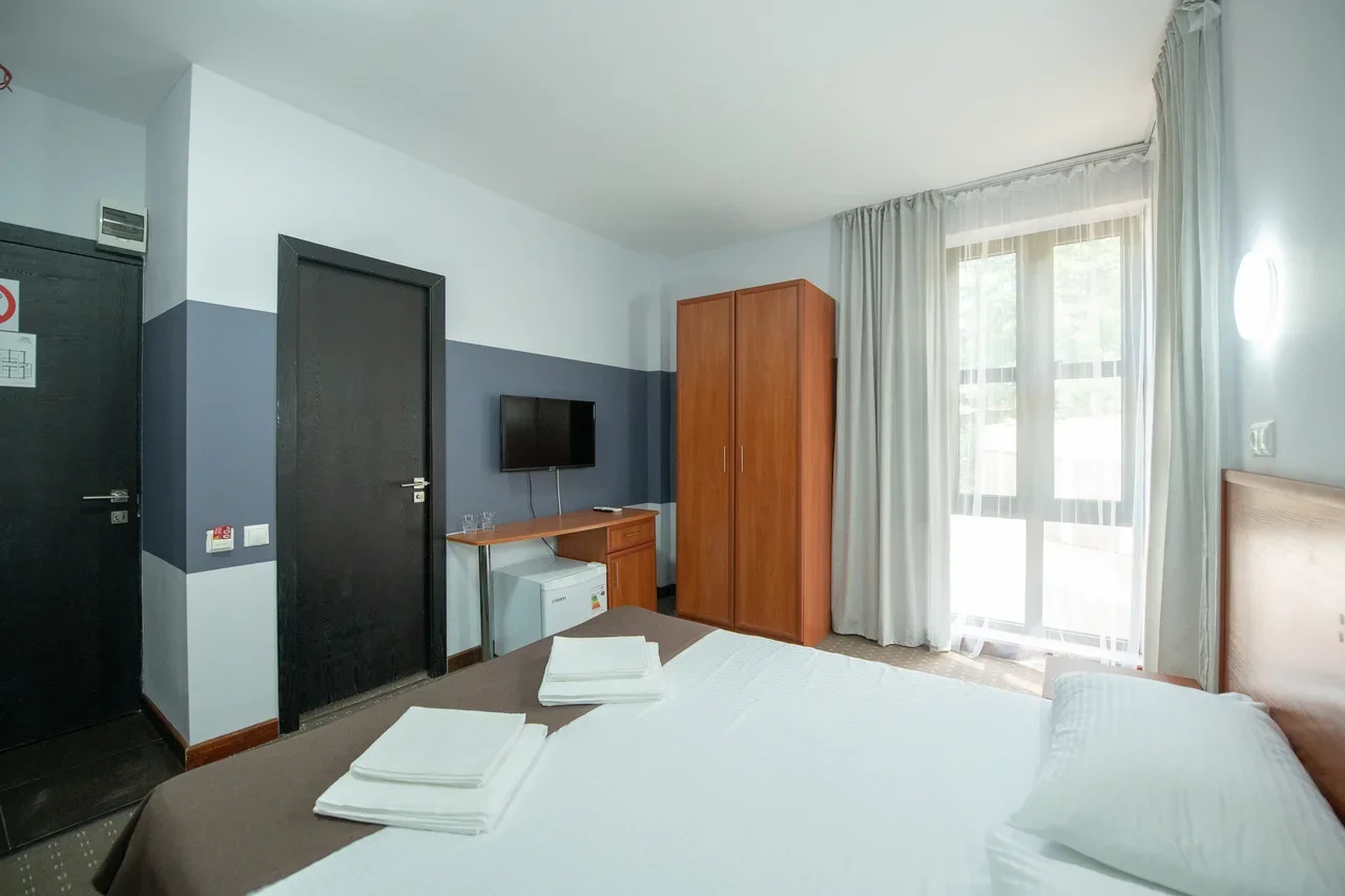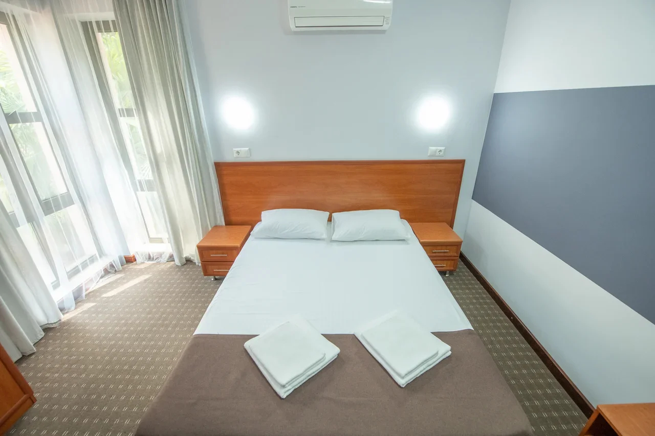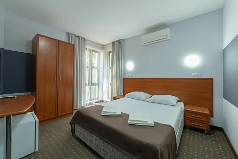 В номере: вешалка, зеркало, кровати односпальные /одна двуспальная кровать, прикроватные тумбочки, стол, стулья, шкаф, кондиционер, мини-холодильник, телевизор ЖК