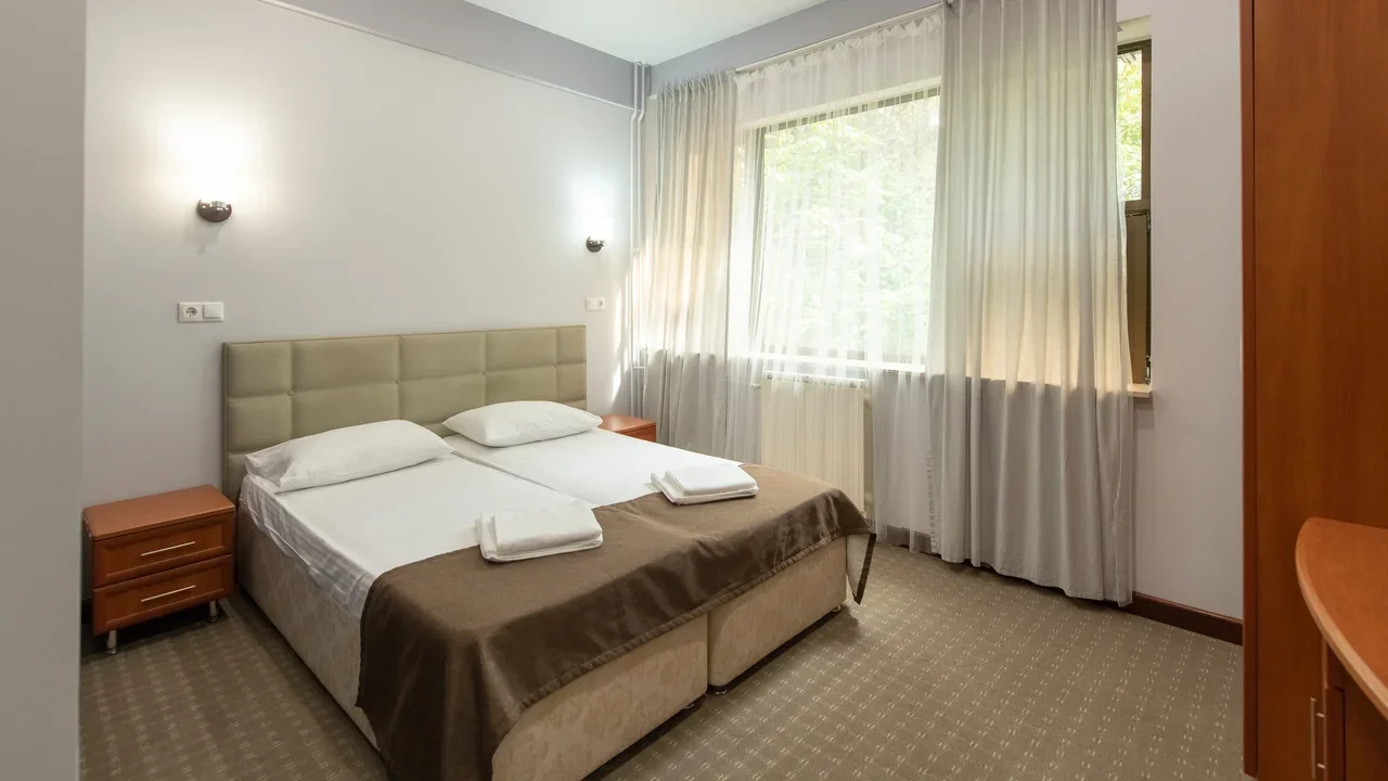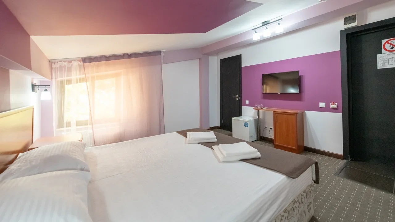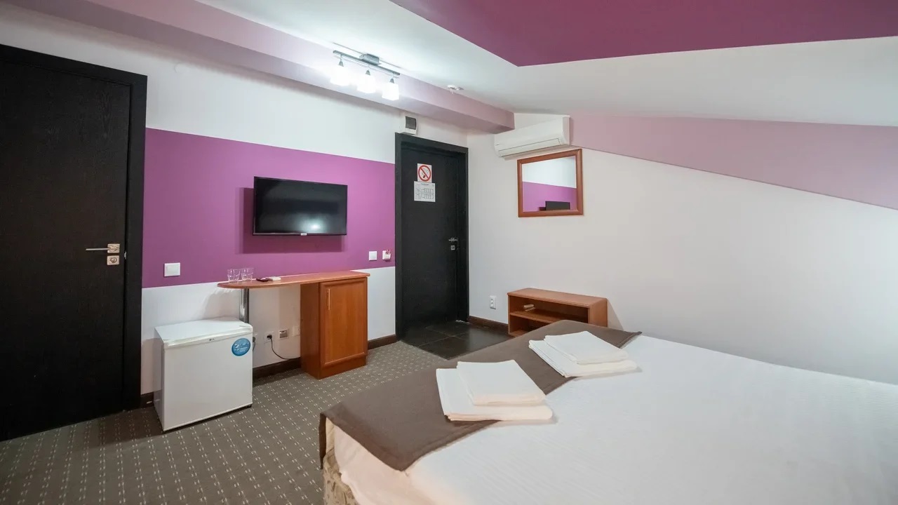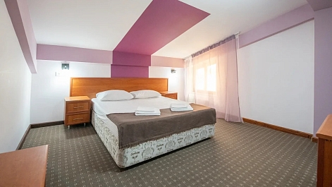 В номере: вешалка, зеркало, кровати односпальные /одна двуспальная кровать, прикроватные тумбочки, стол, стулья, шкаф, кондиционер, мини-холодильник, телевизор ЖК