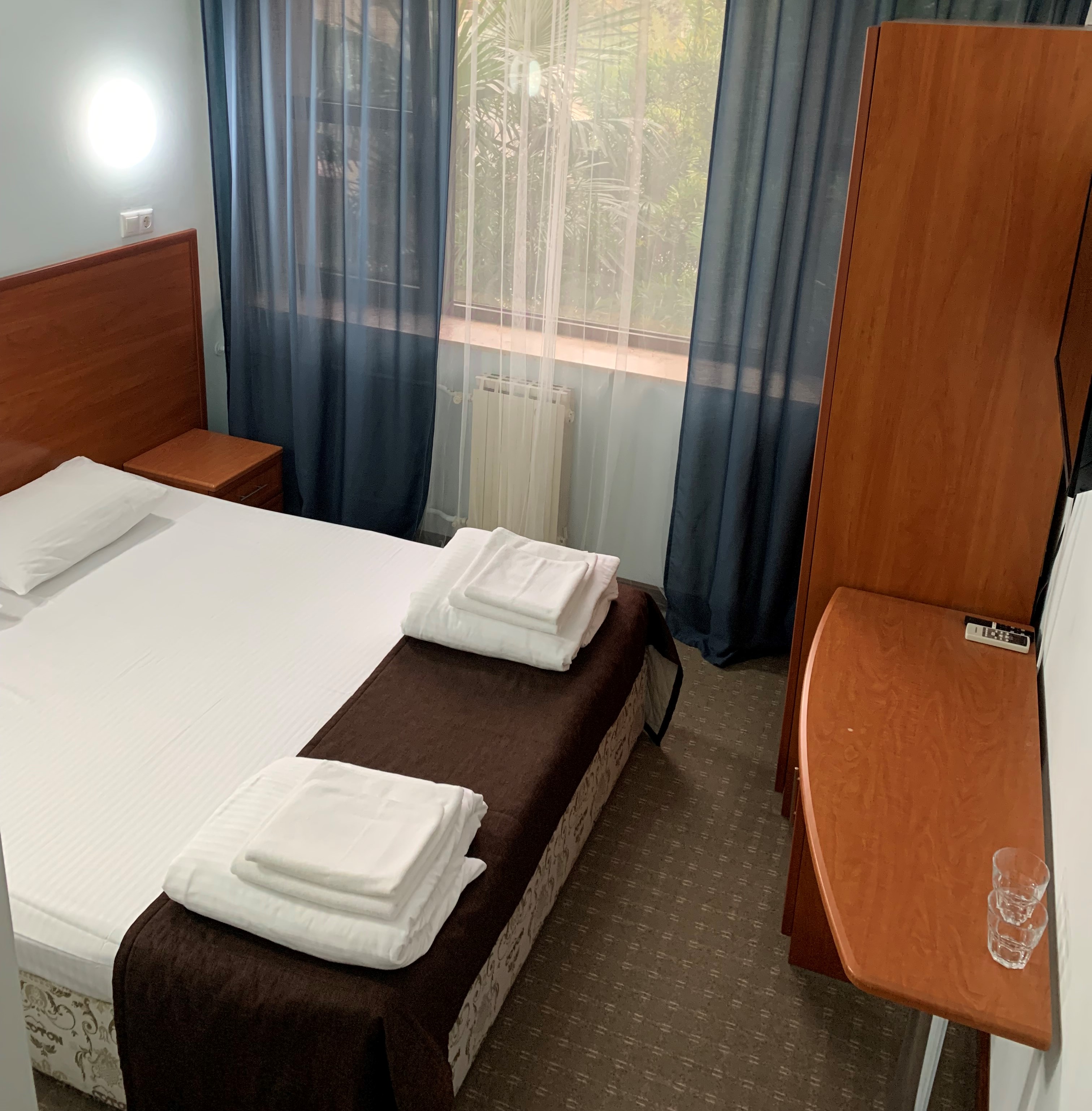 В номере: вешалка, зеркало, кровати односпальные /одна двуспальная кровать, прикроватные тумбочки, стол, шкаф, кондиционер, мини-холодильник, телевизор ЖК