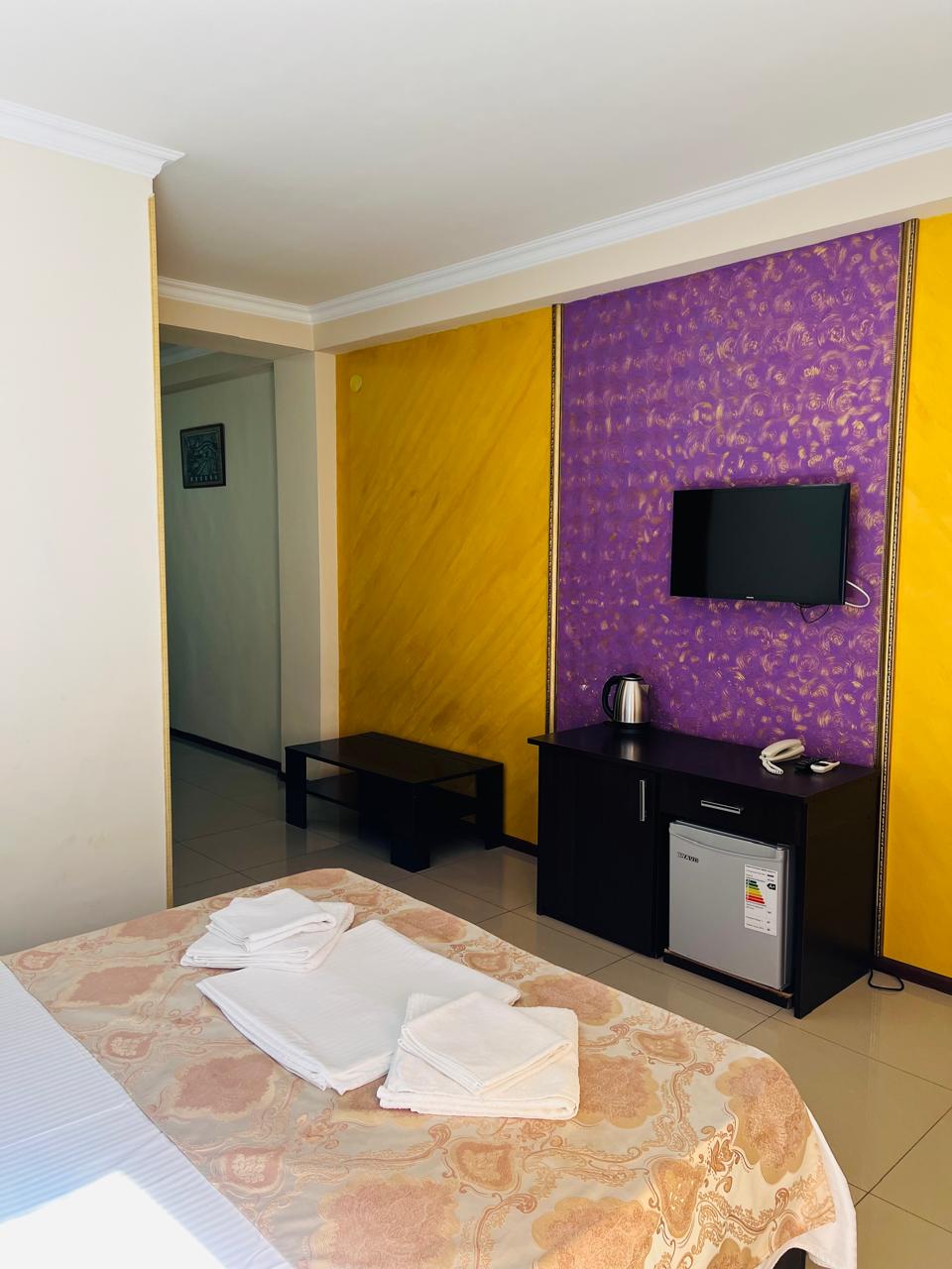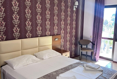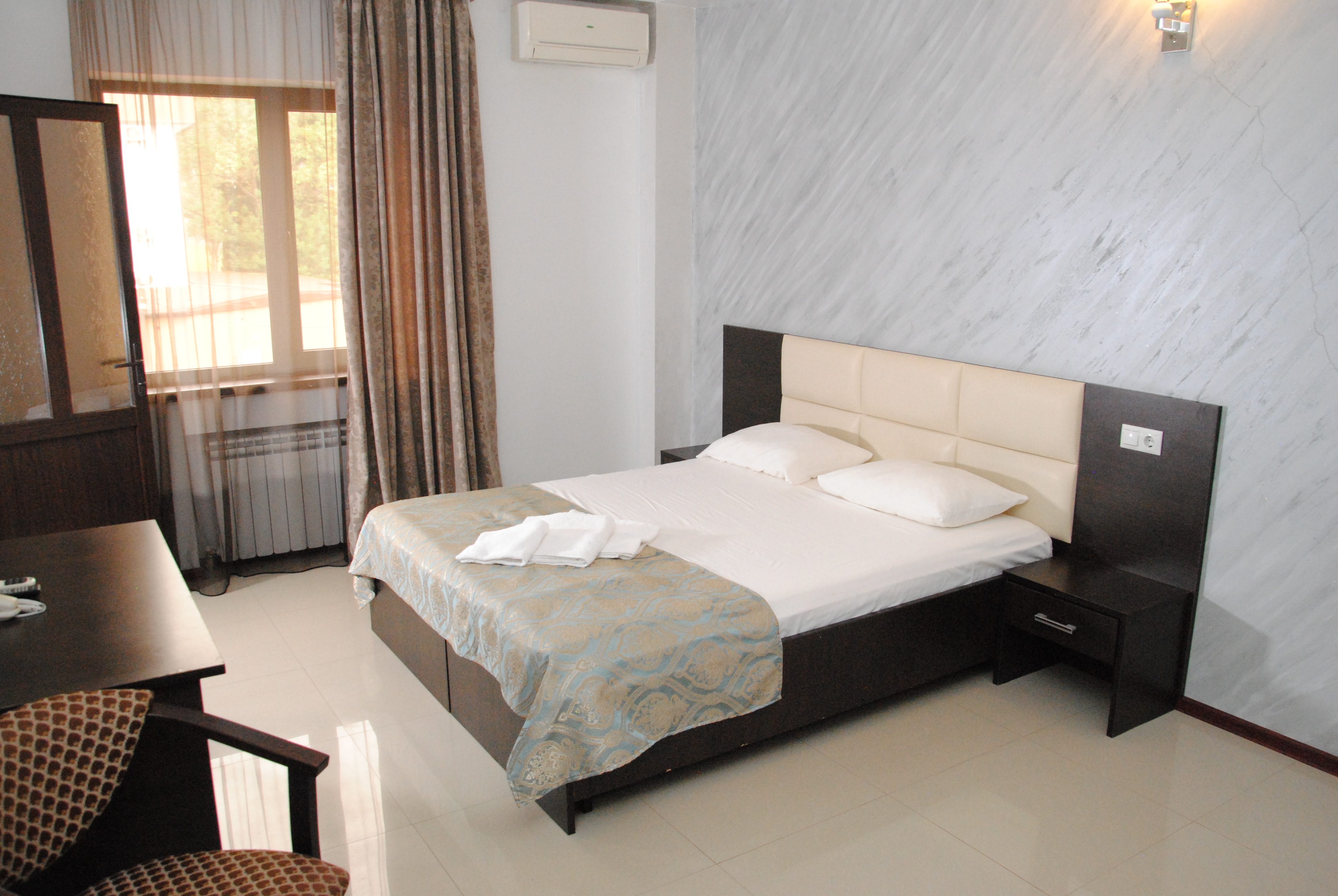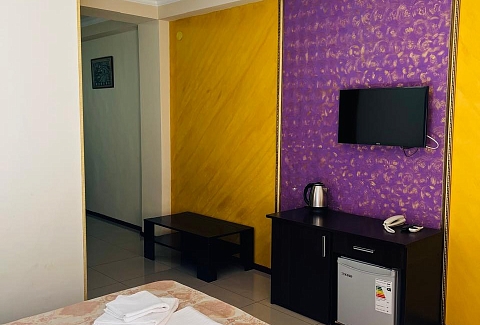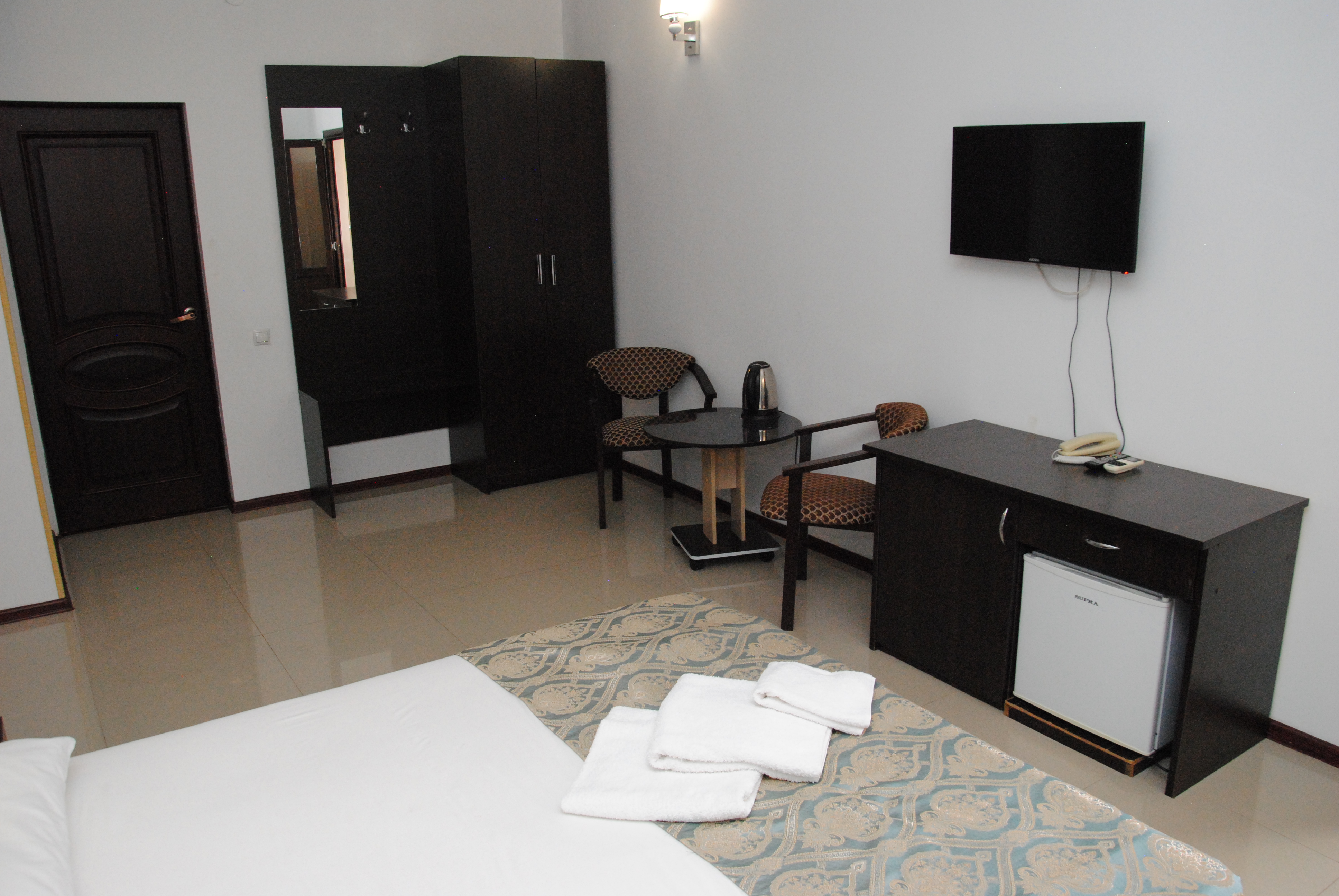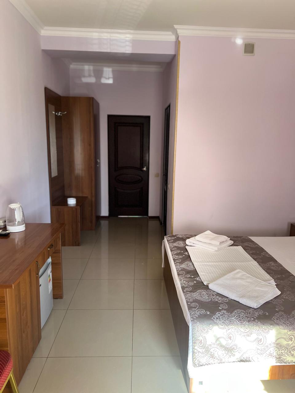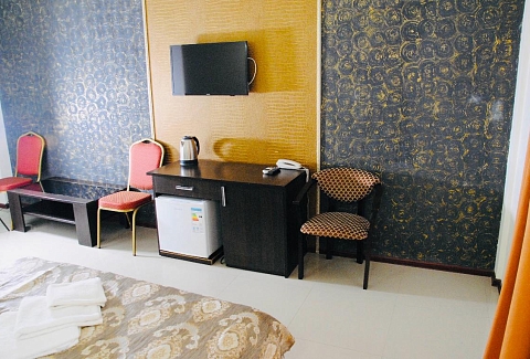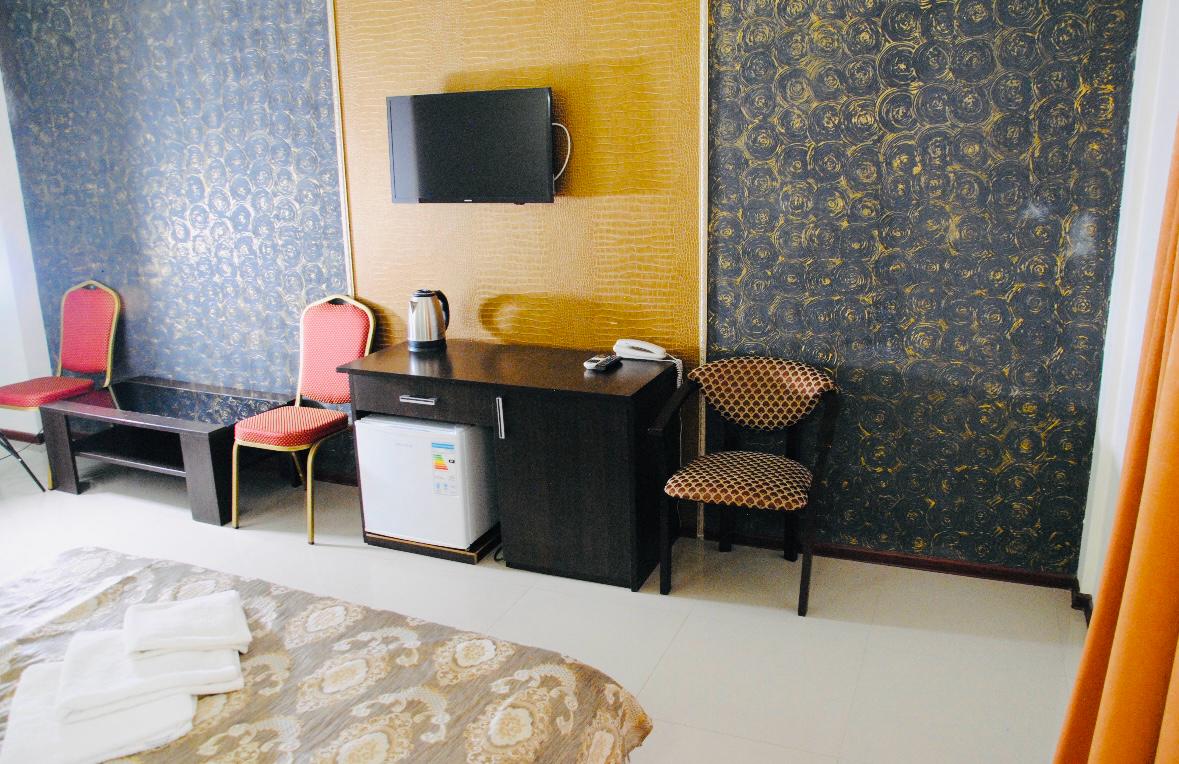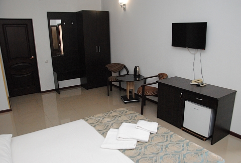 В номере: вешалка, зеркало, кровать двуспальная, стол, стулья, шкаф, кондиционер, мини-холодильник, телевизор ЖК, телефон, электрочайник