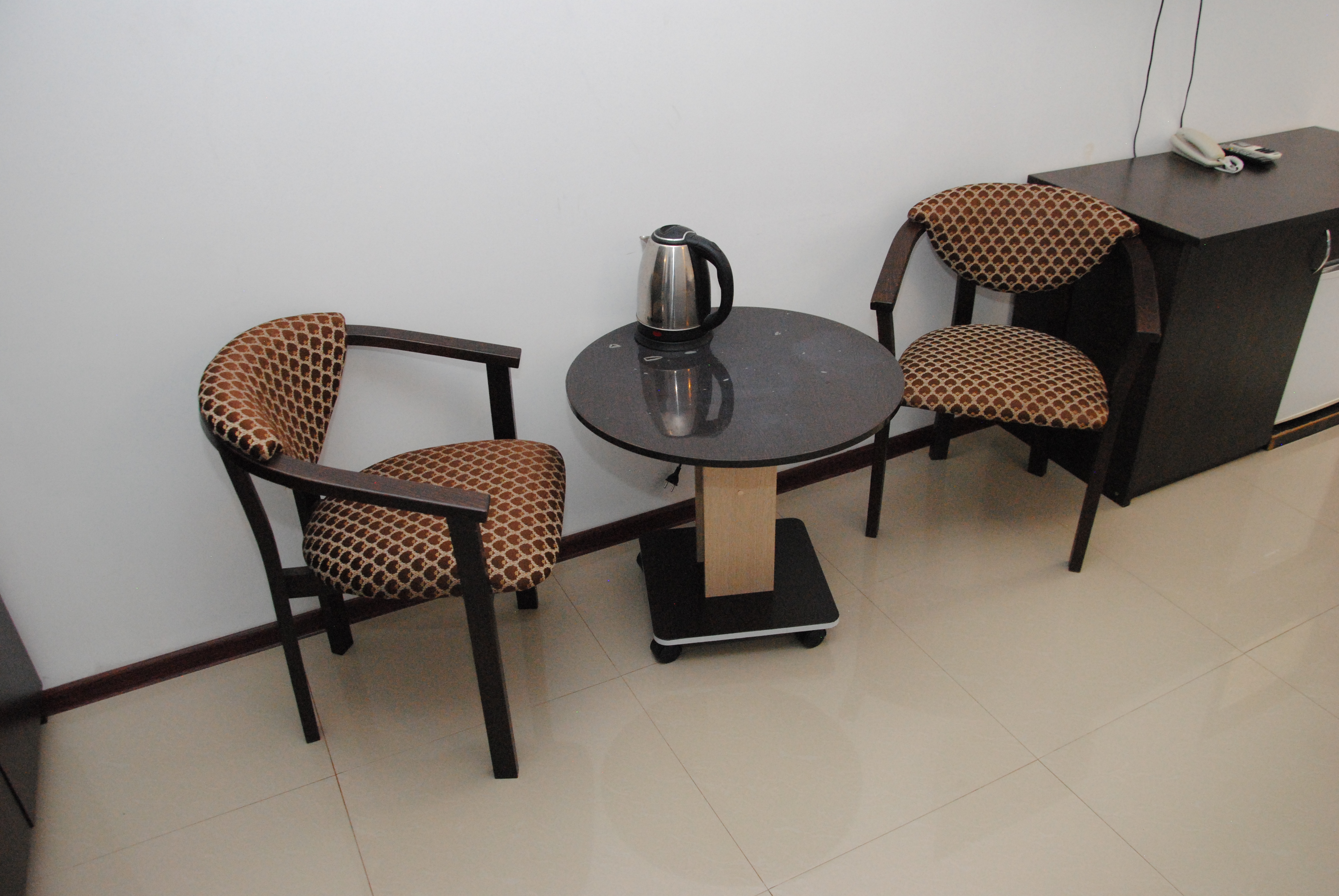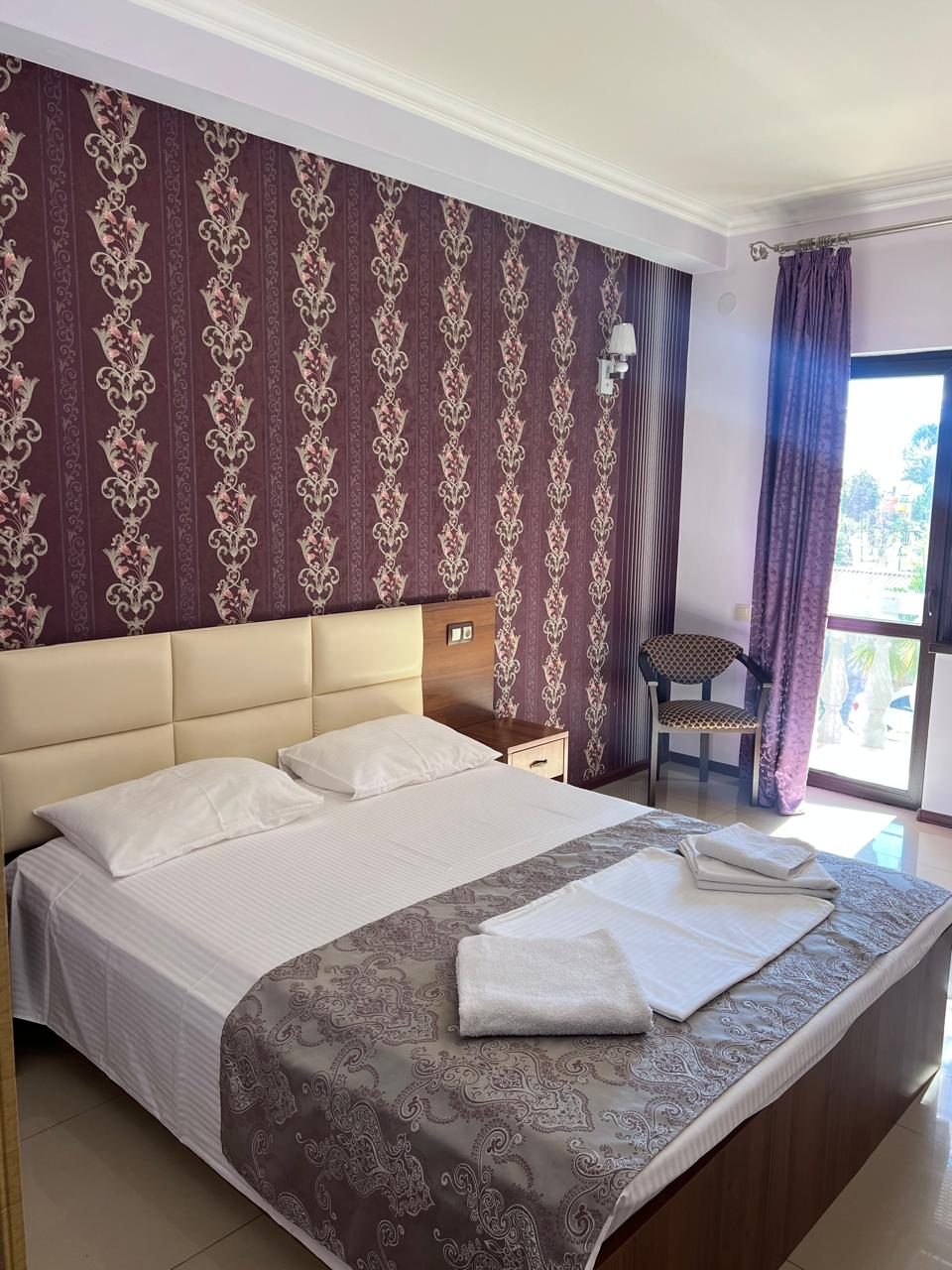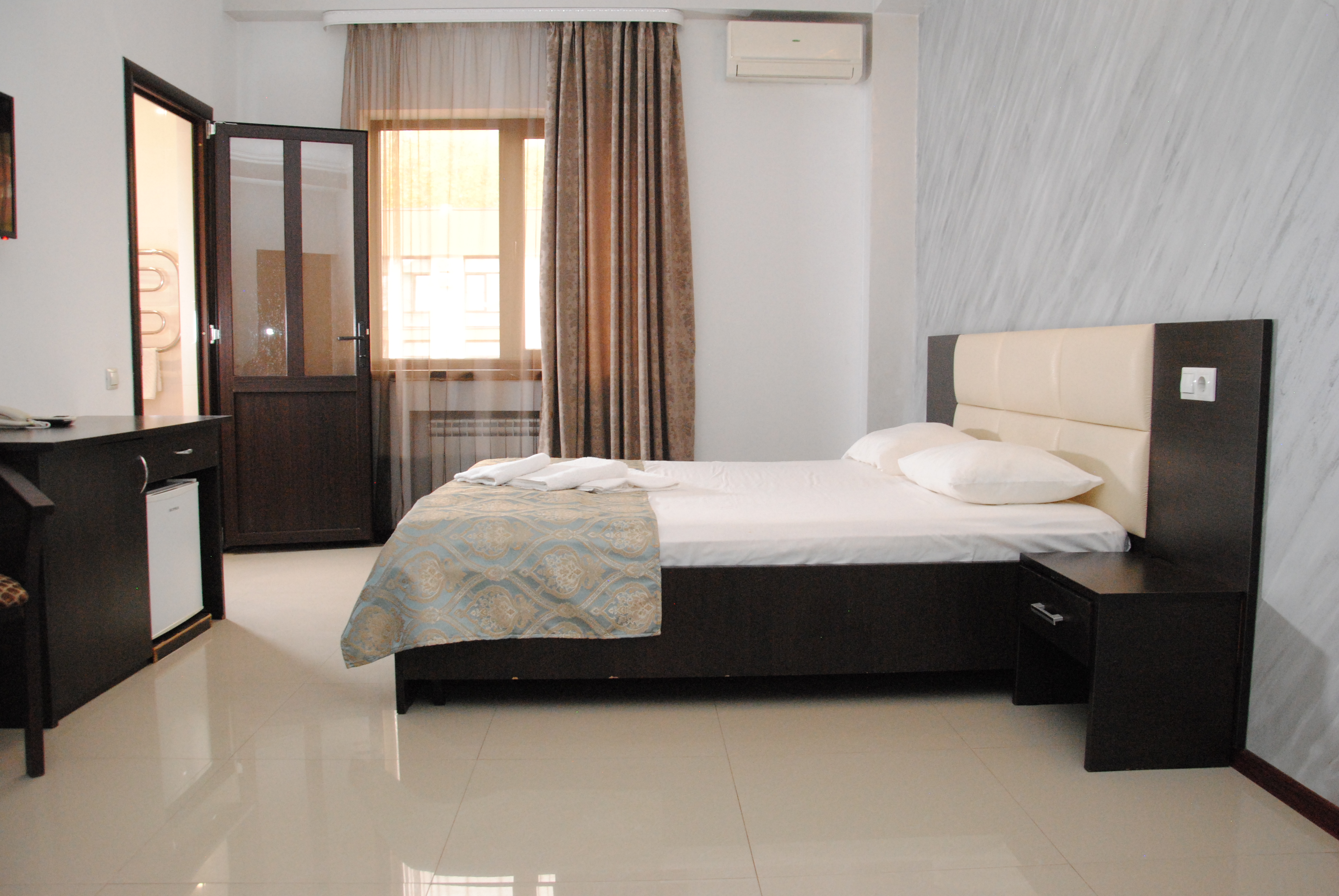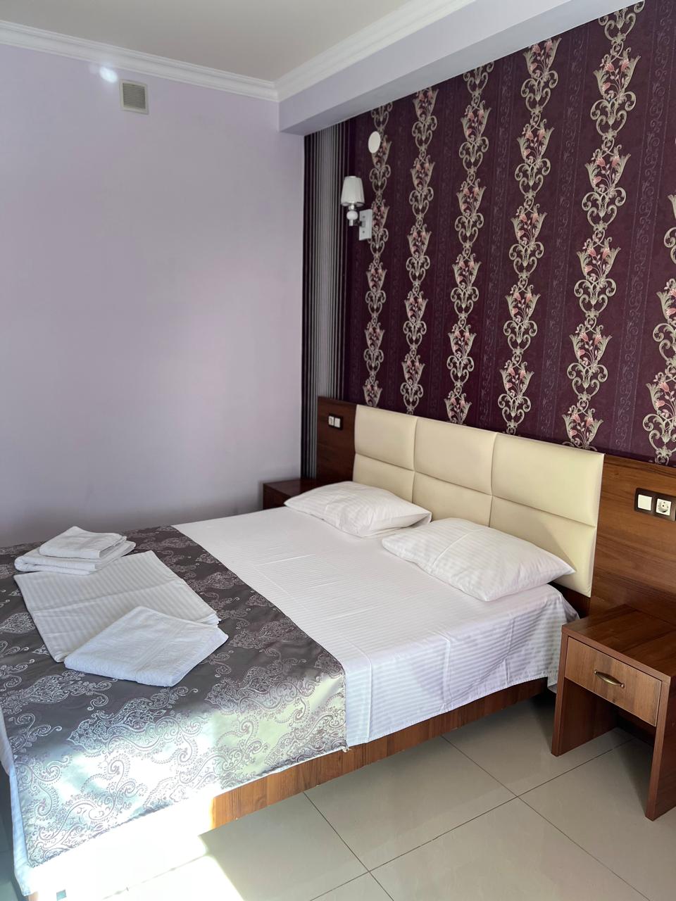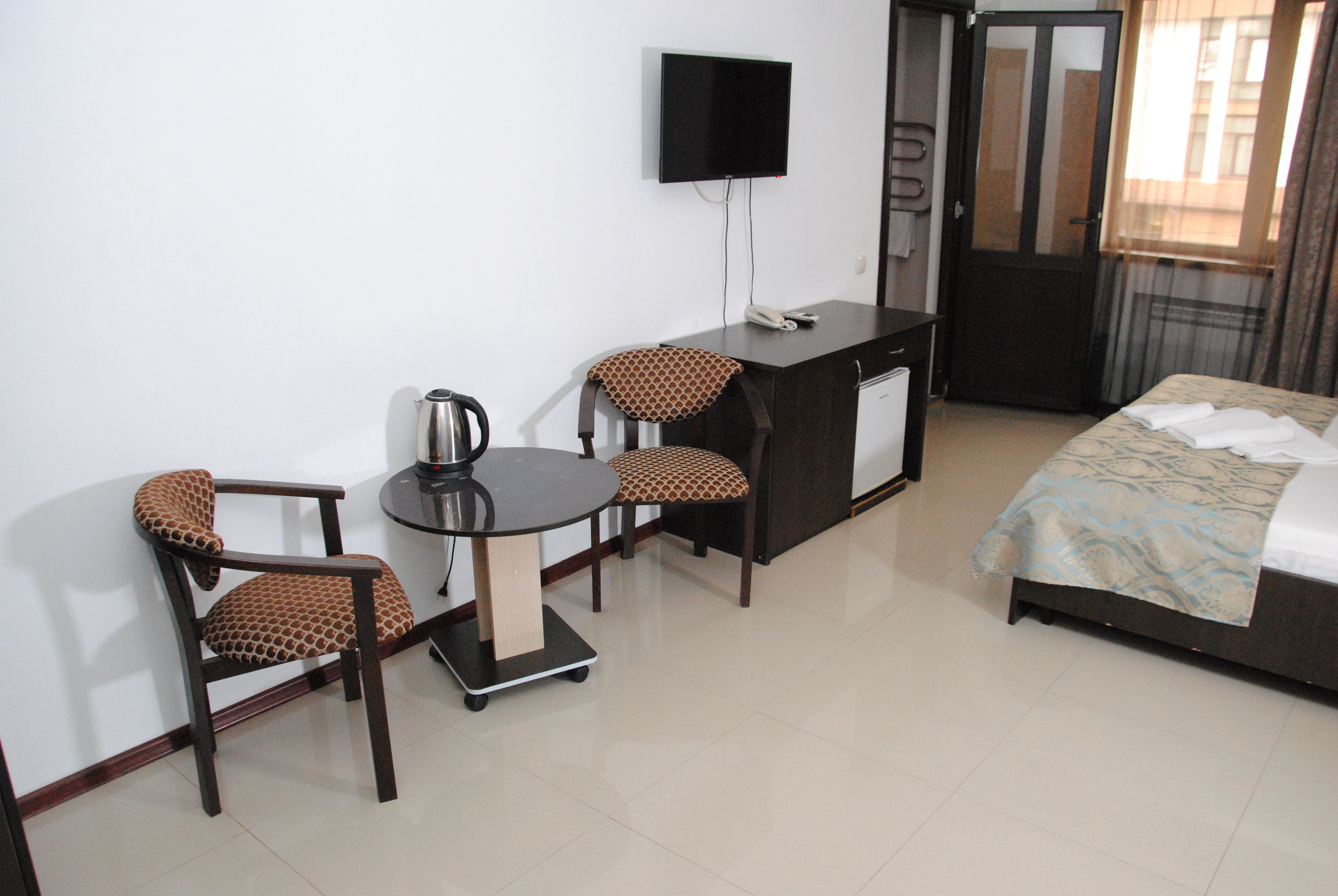В номере: вешалка, зеркало, кровать двуспальная, стол, стулья, шкаф, кондиционер, мини-холодильник, телевизор ЖК, телефон, электрочайник
