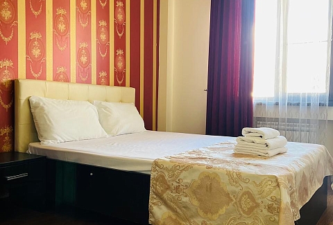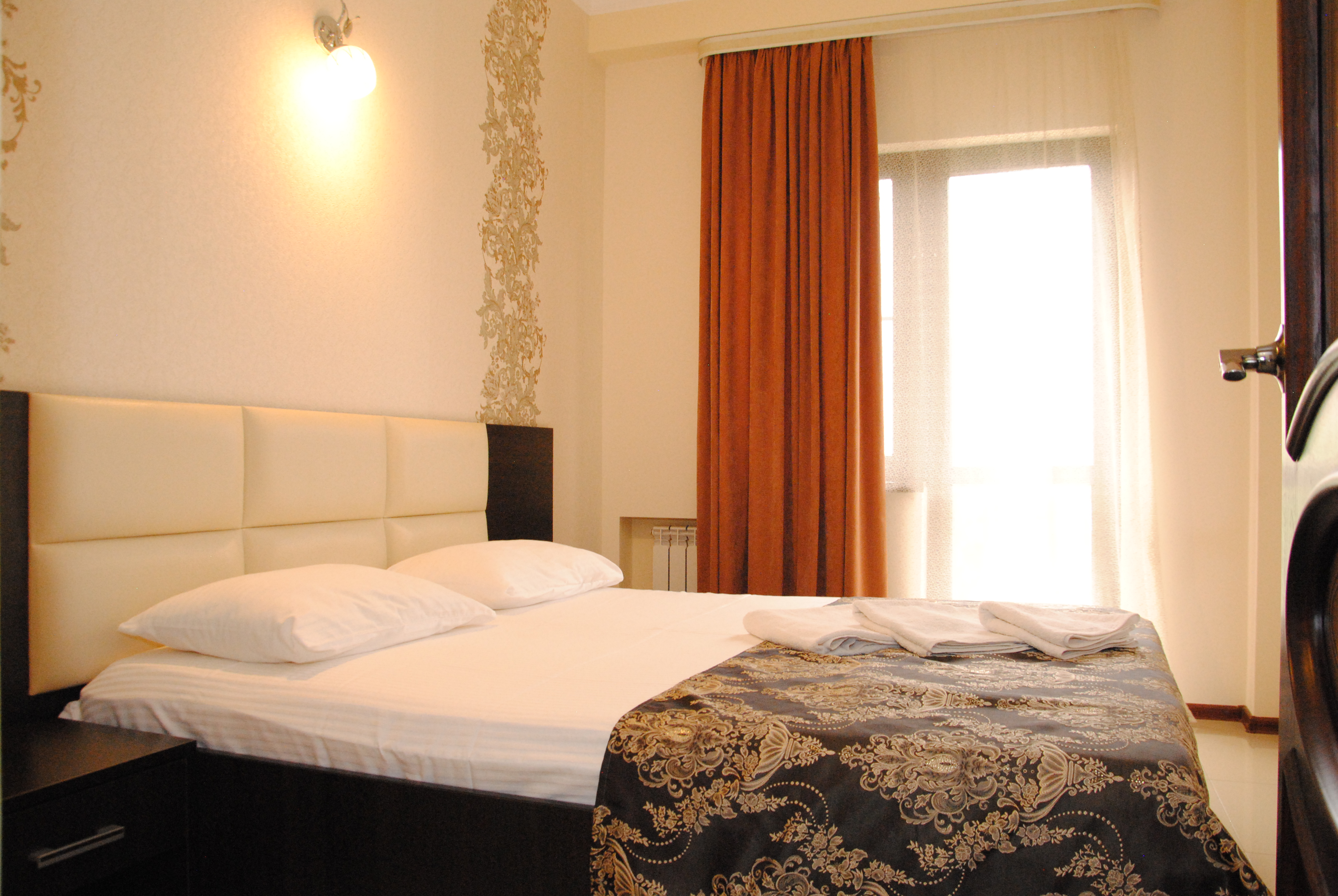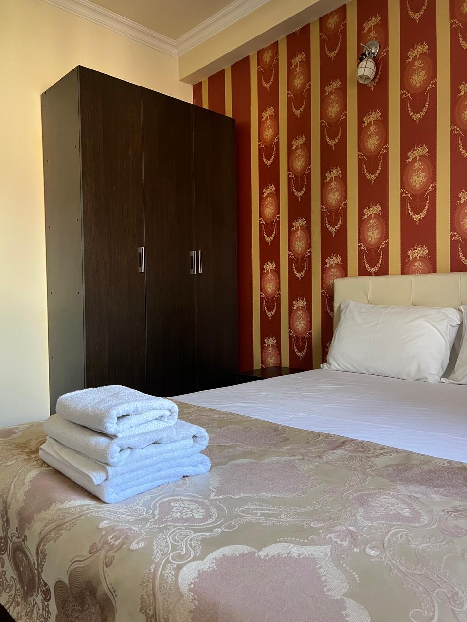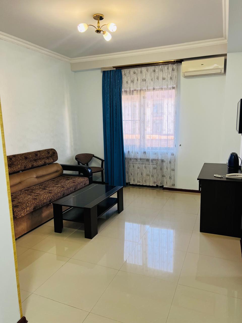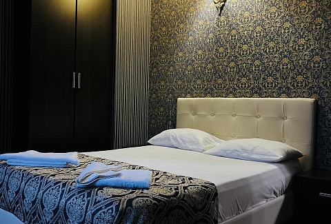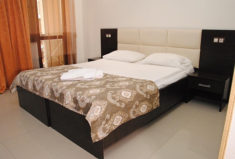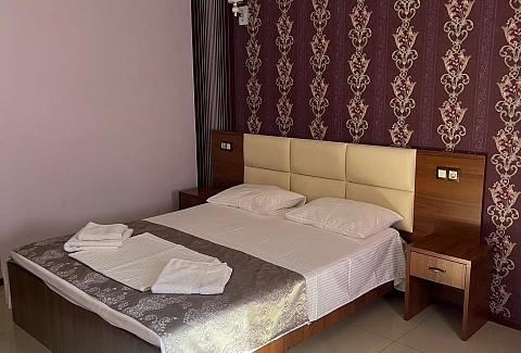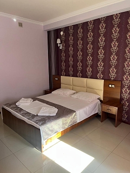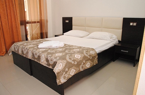 В номере: вешалка, диван раскладной, зеркало, кровать двуспальная, прикроватные тумбочки, шкаф, кондиционер, мини-холодильник, телевизор ЖК, телефон, электрочайник