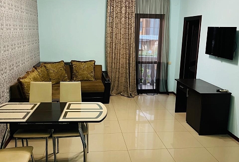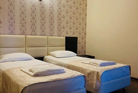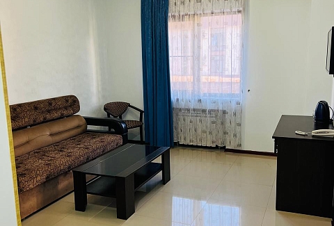 В номере: диван раскладной, кровати односпальные, кровать двуспальная, прикроватные тумбочки, стол, столик журнальный, стулья, шкаф, кондиционер, мини-холодильник, телевизор ЖК, телефон, электрочайник