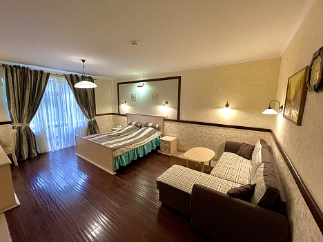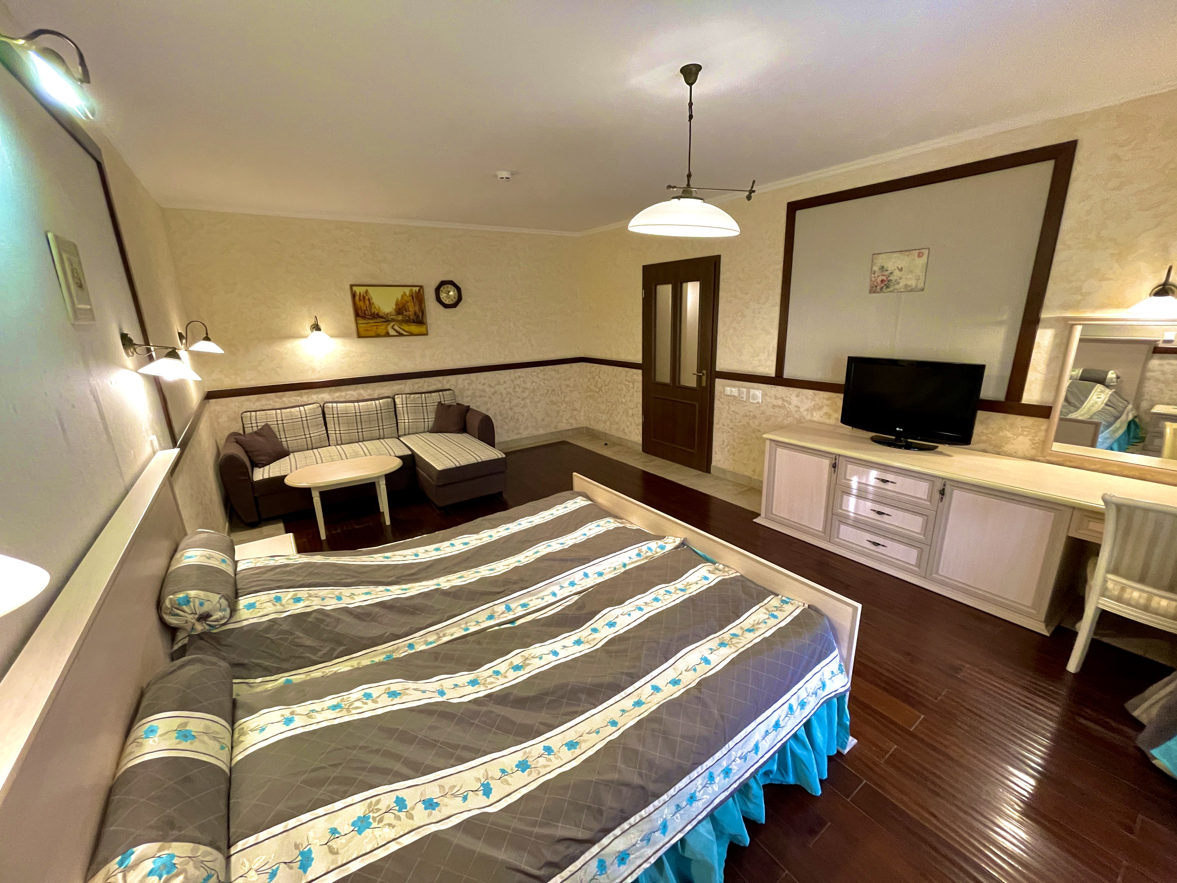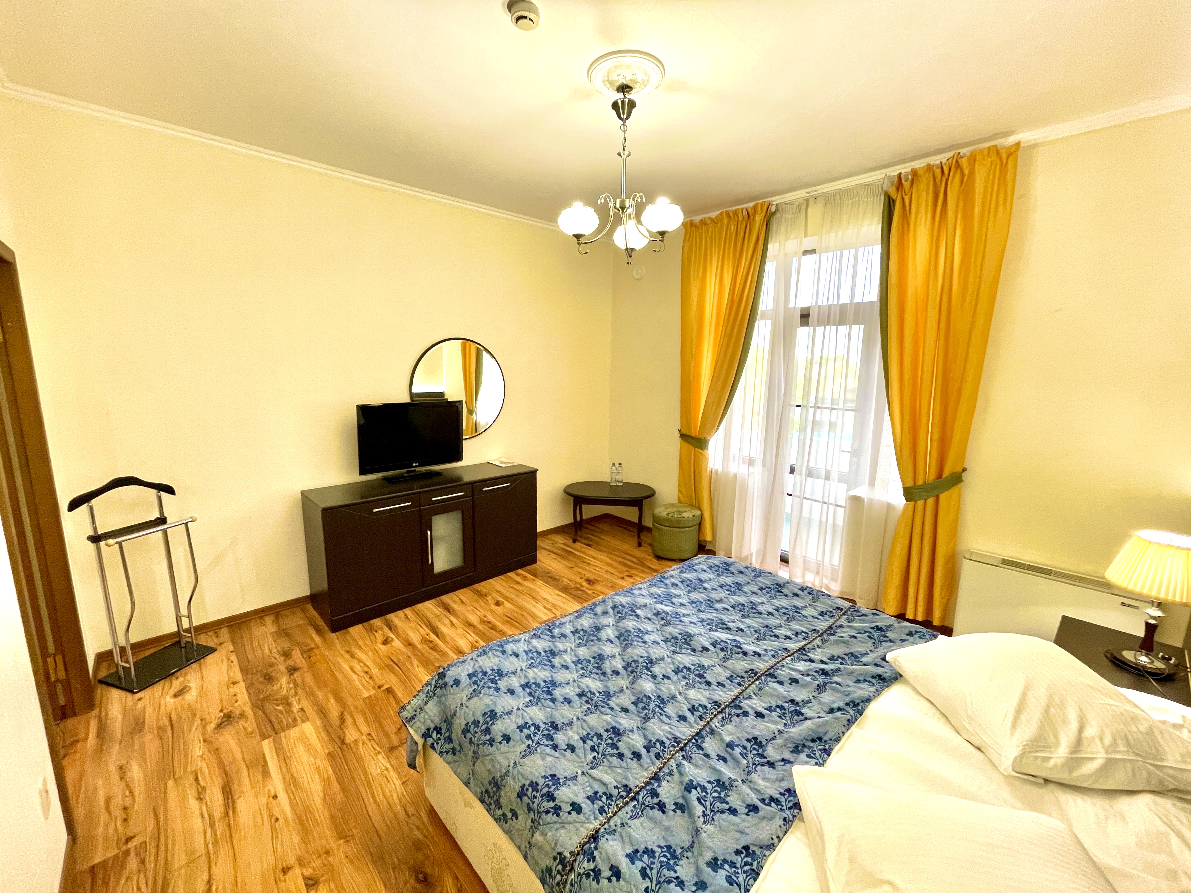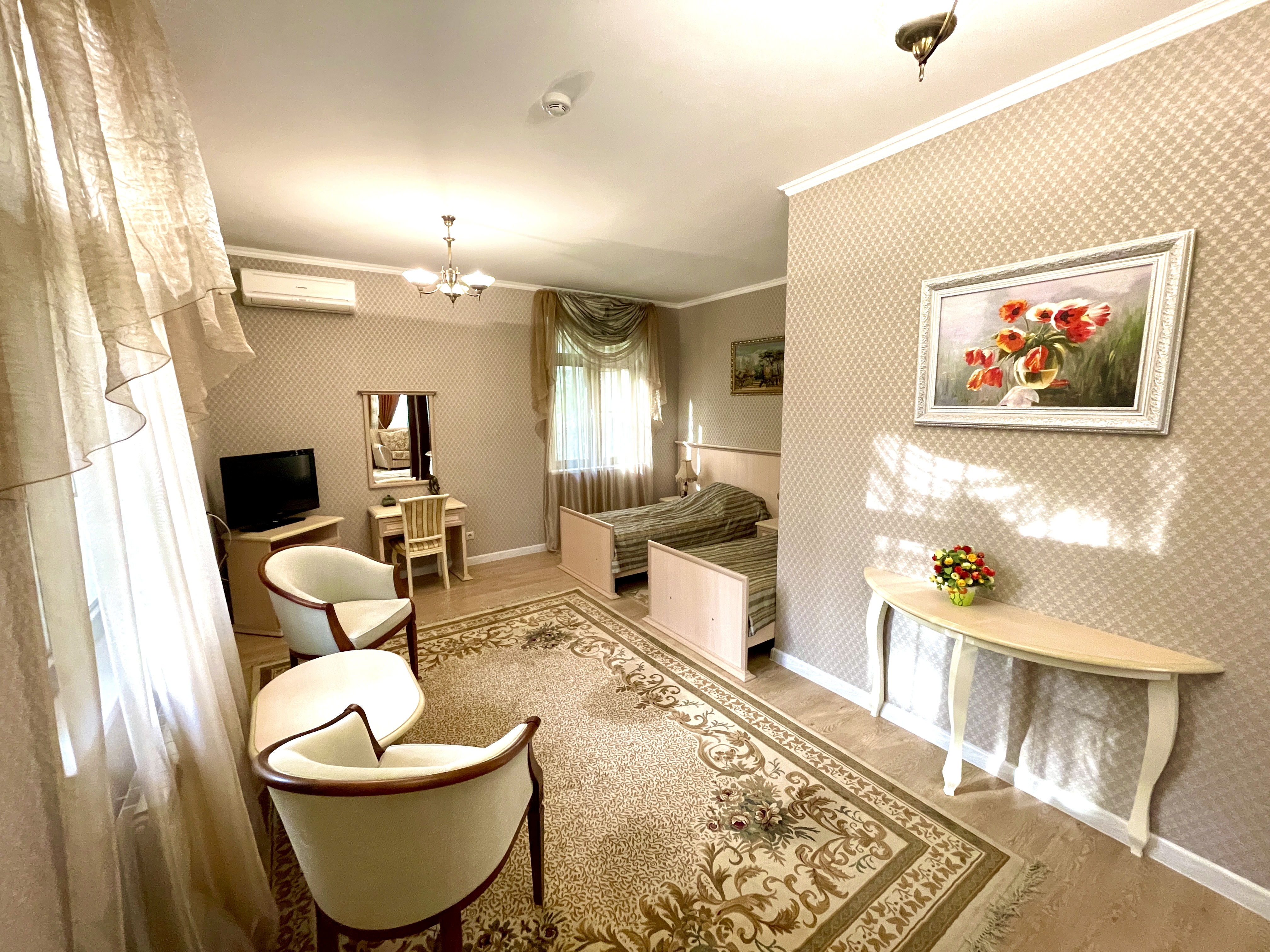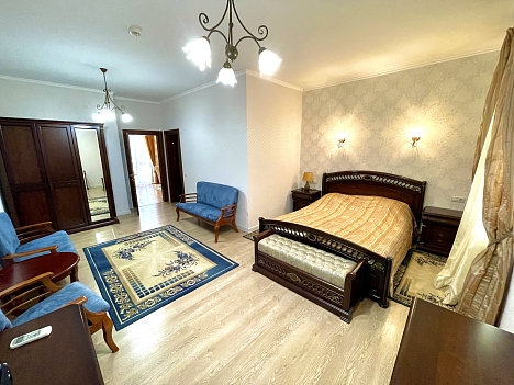В номере: диван раскладной, зеркало, комод, кресла, кровати односпальные, кровать двуспальная, прикроватные тумбочки, стол, столик журнальный, стул, шкаф встроенный, сейф, сплит-система, телевизор, телефон, утюг, холодильник, электрочайник