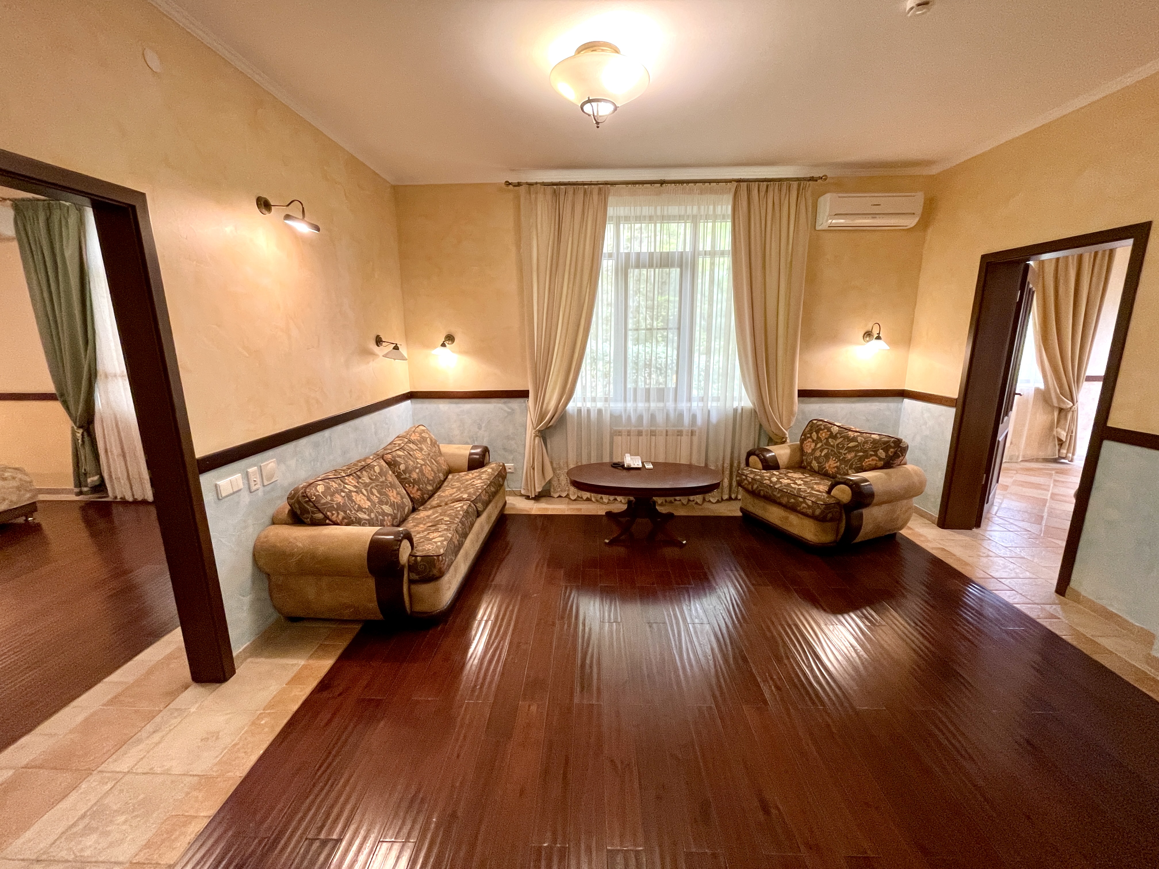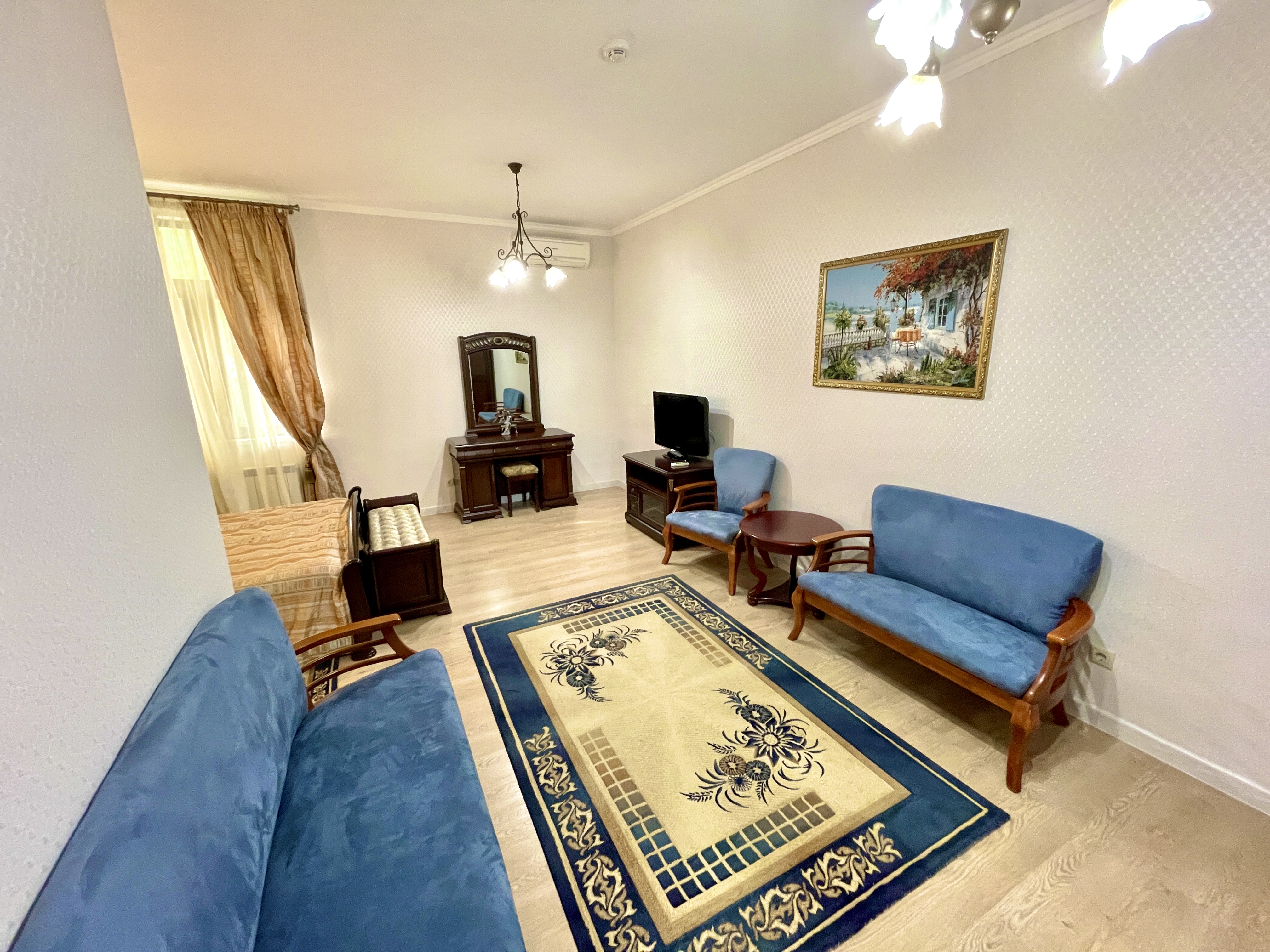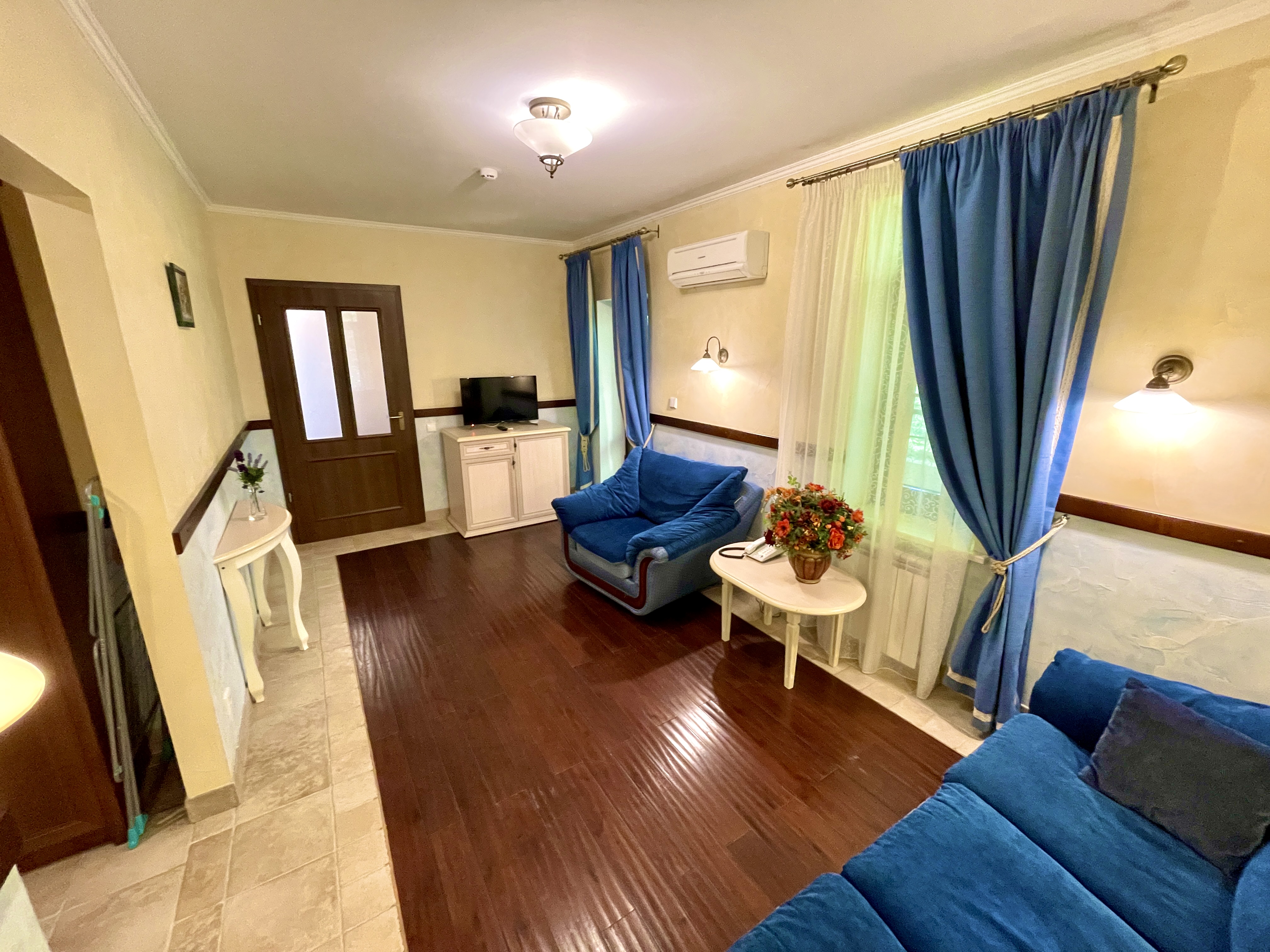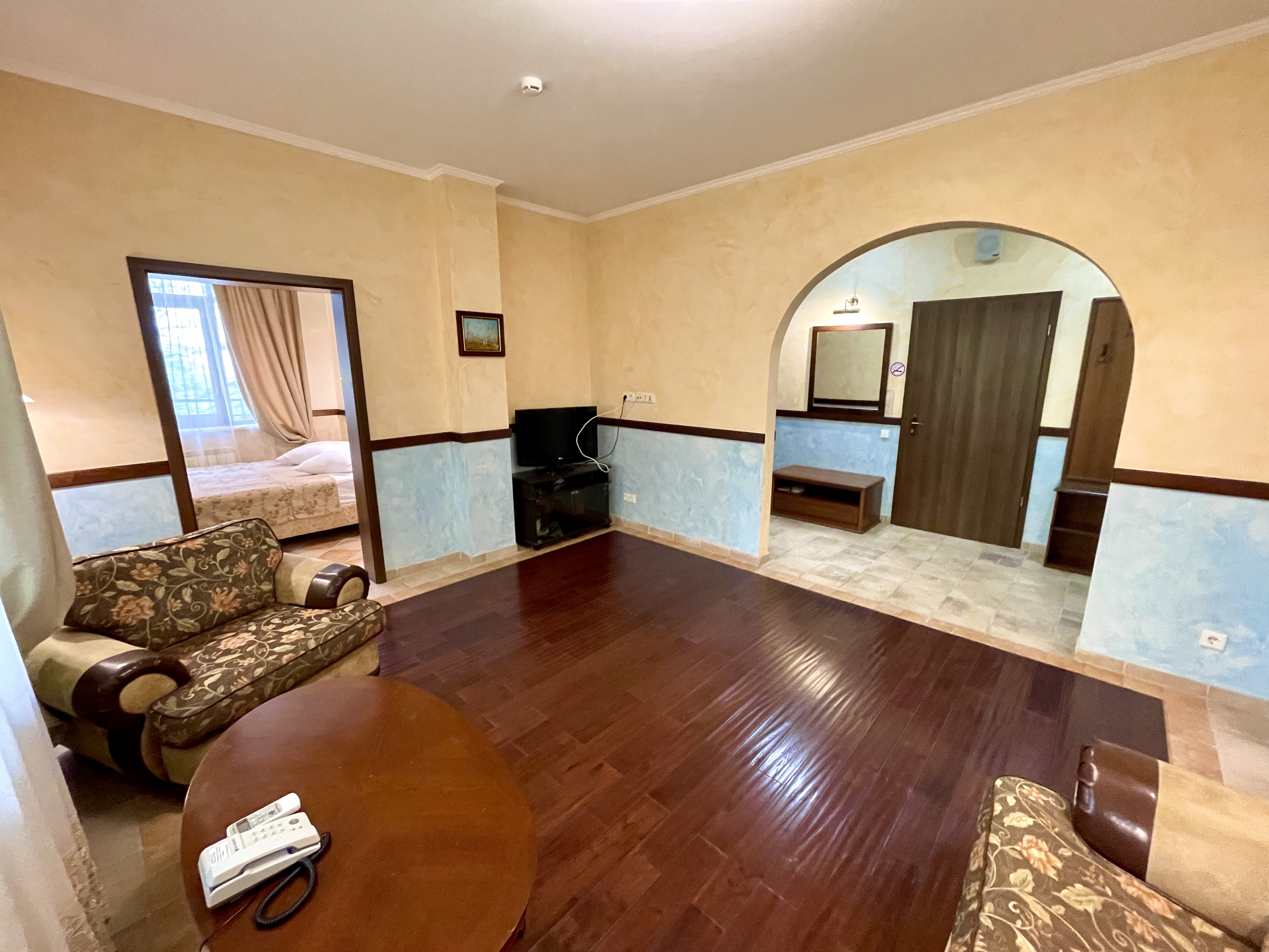 В номере: диван раскладной, зеркало, комод, кресла, кровати односпальные, кровать двуспальная, прикроватные тумбочки, стол, столик журнальный, стул, шкаф встроенный, сейф, сплит-система, телевизор, телефон, утюг, холодильник, электрочайник