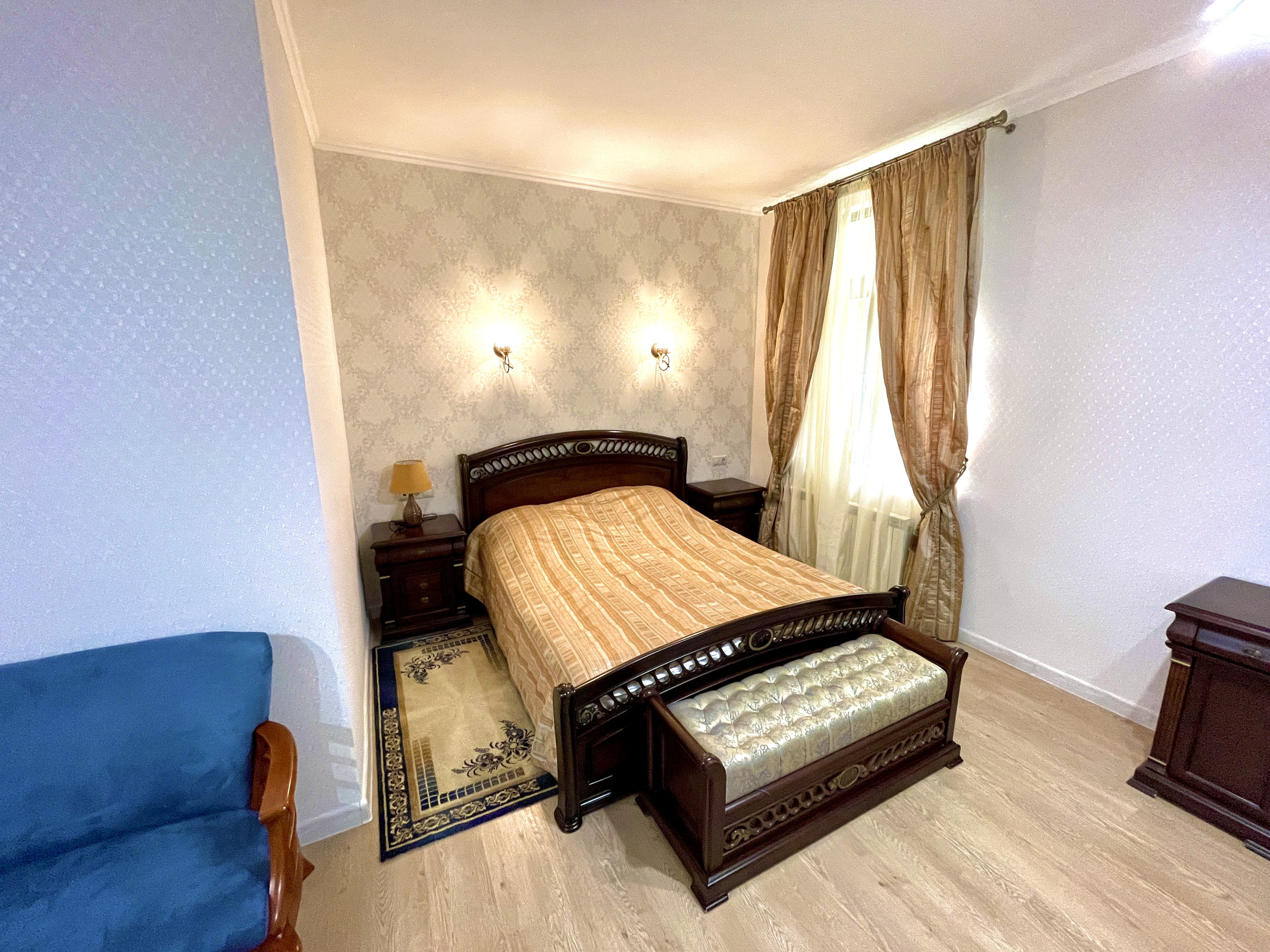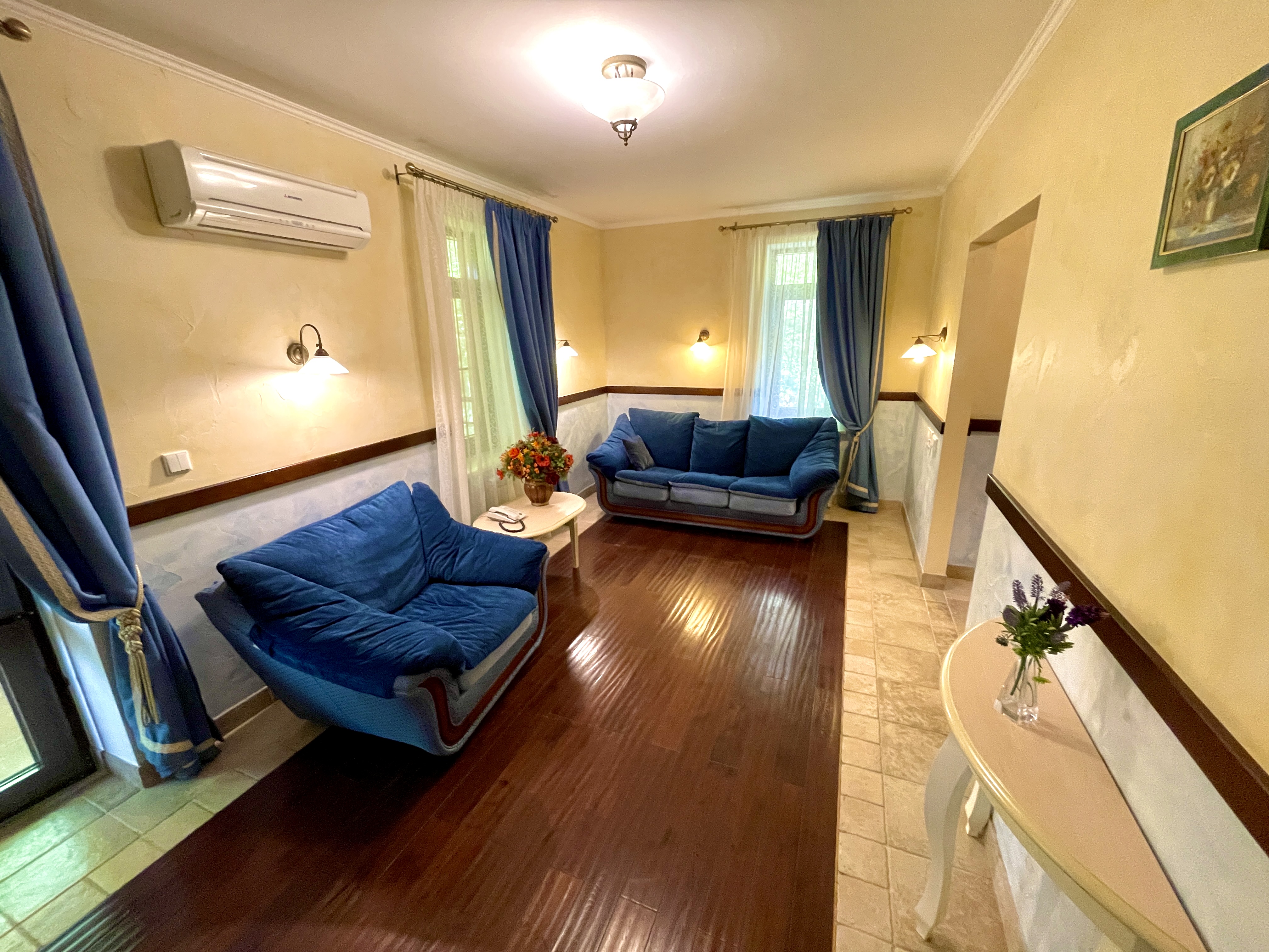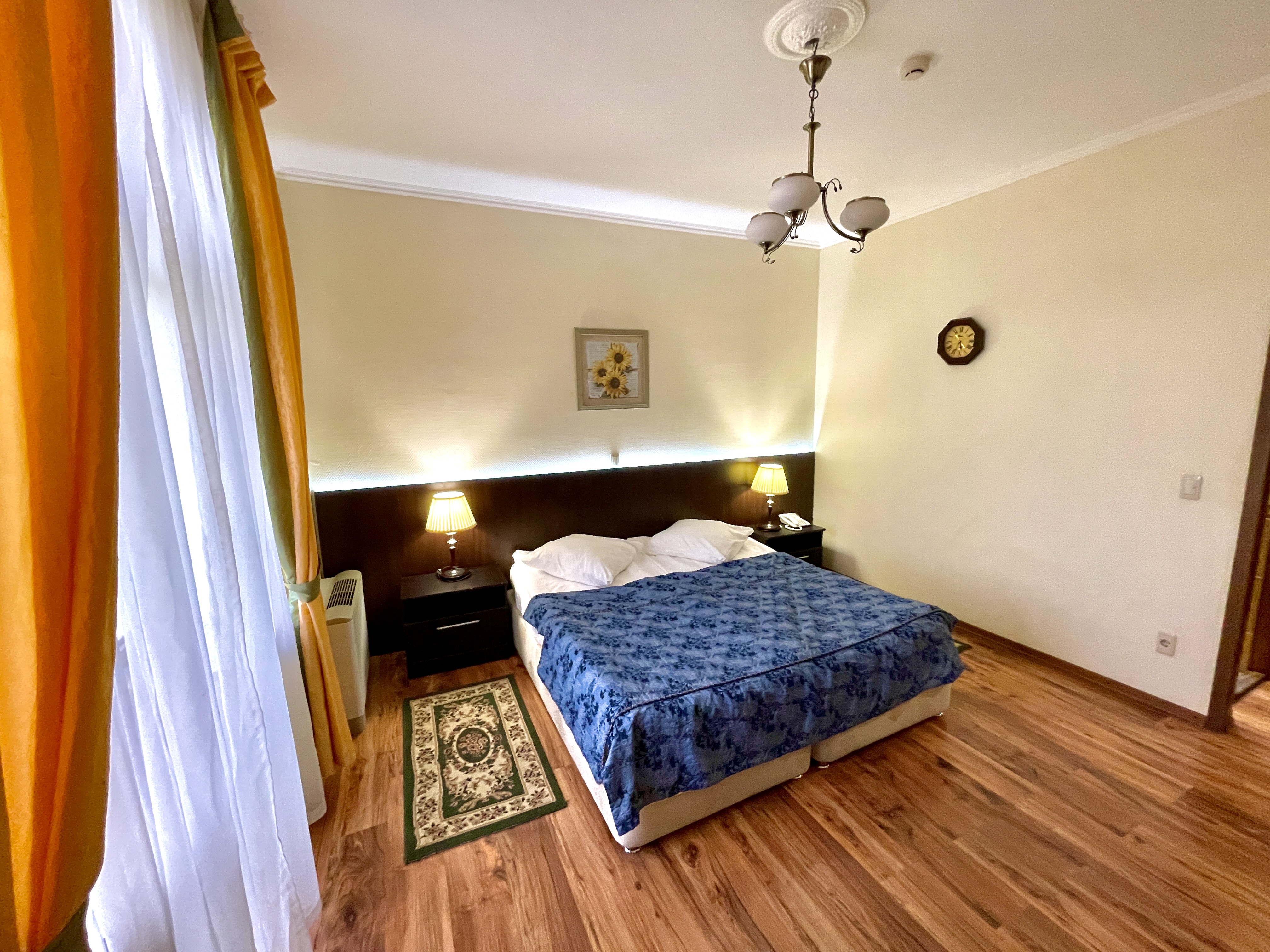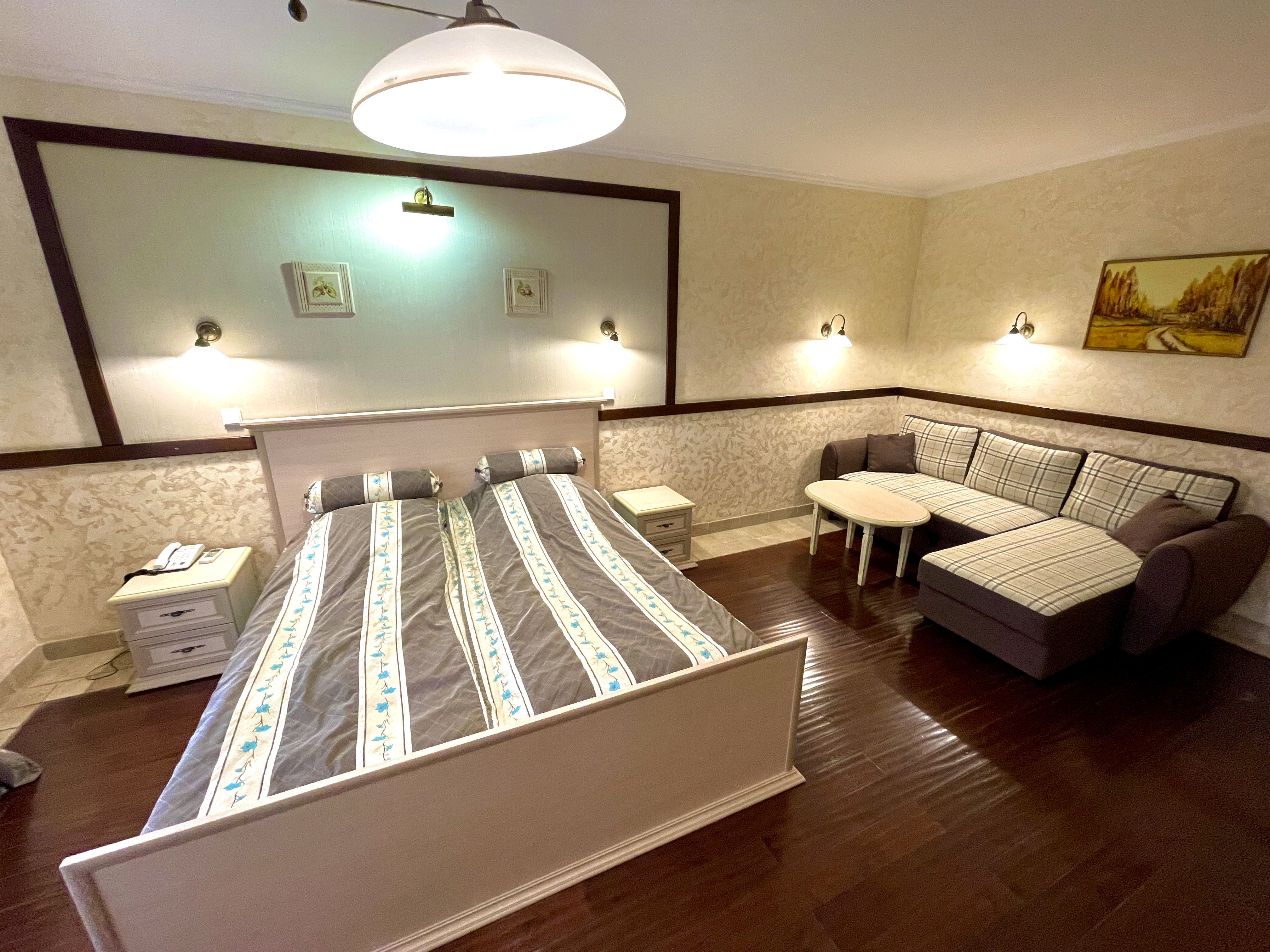 В номере: диван раскладной, зеркало, комод, кресла, кровати односпальные, кровать двуспальная, прикроватные тумбочки, стол, столик журнальный, стул, шкаф встроенный, сейф, сплит-система, телевизор, телефон, утюг, холодильник, электрочайник