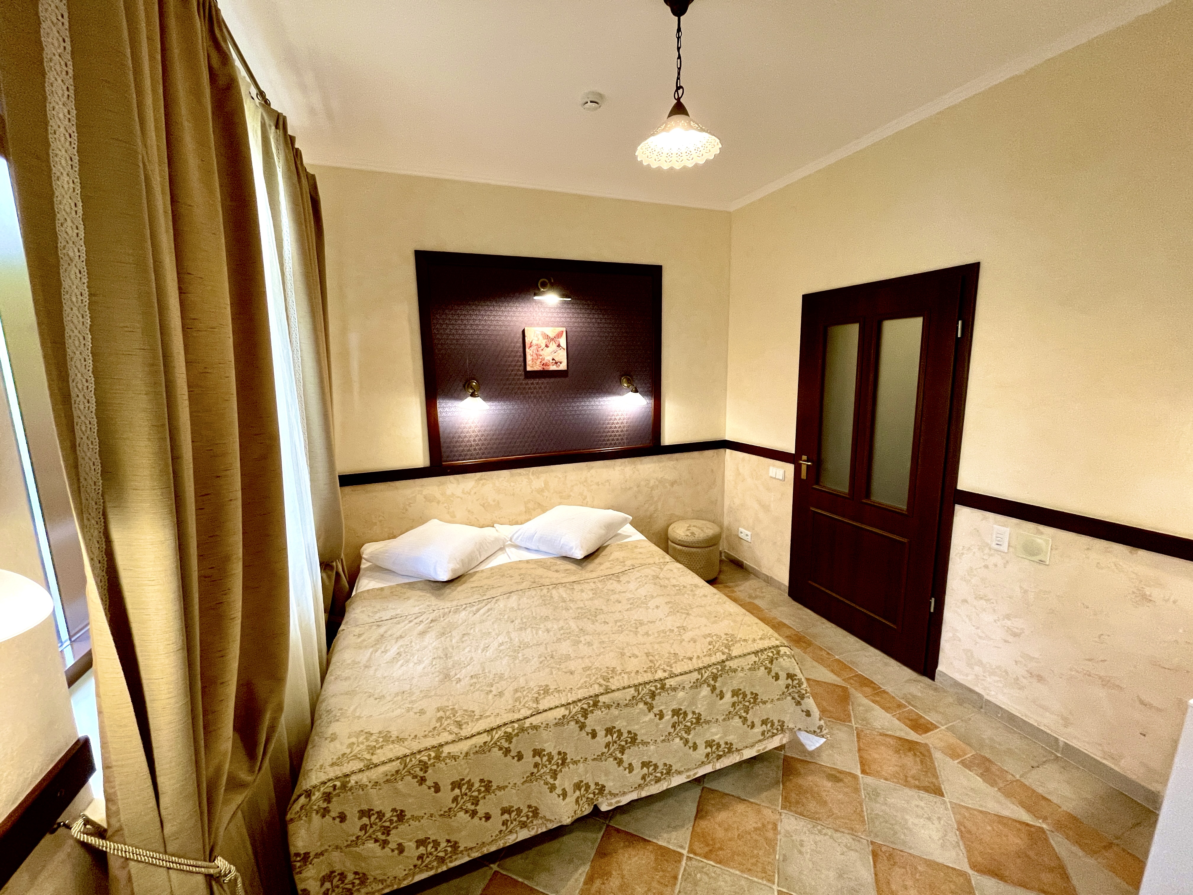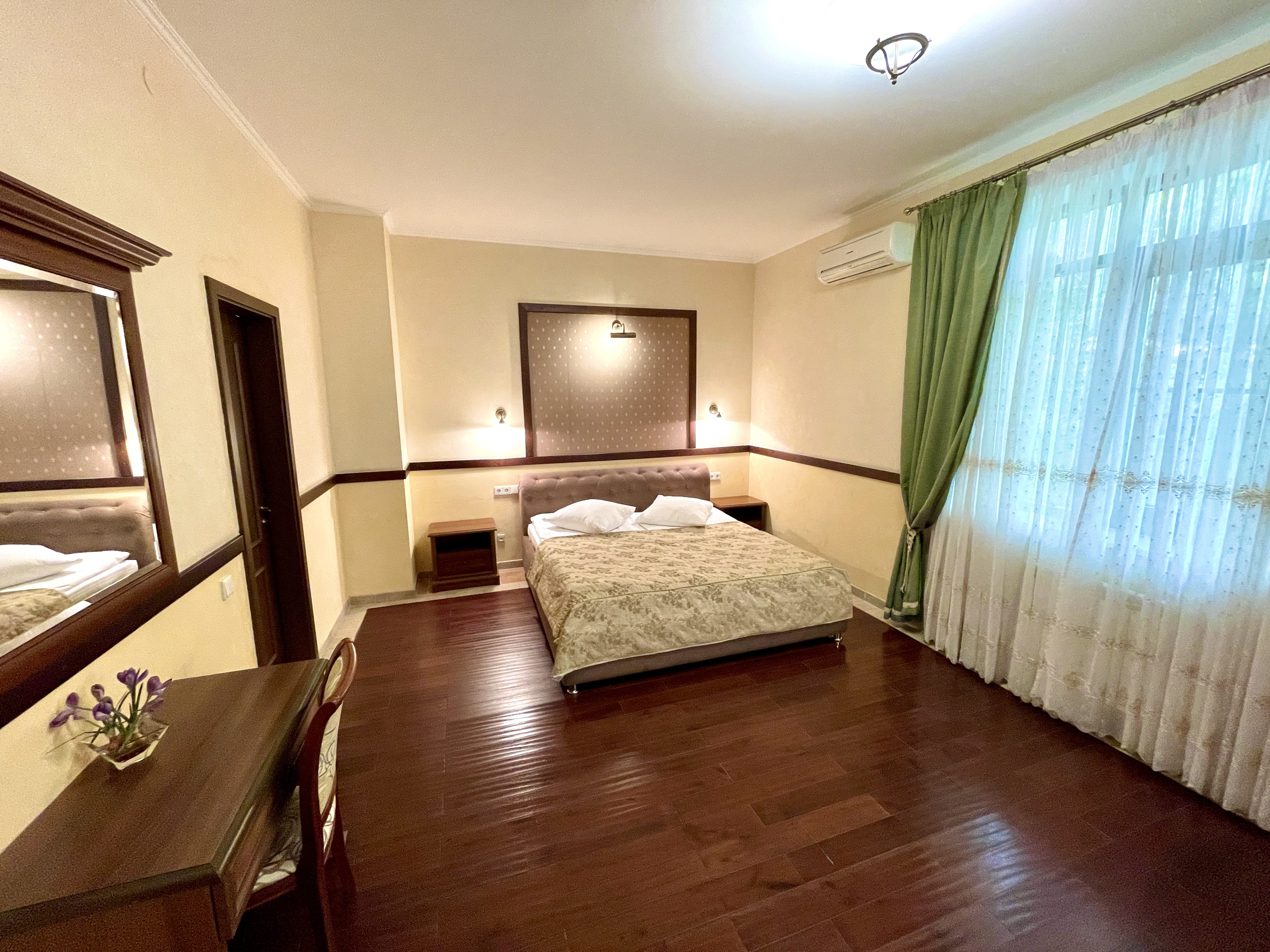 В номере: зеркало, кровать двуспальная, прикроватные тумбочки, стол, стул, шкаф встроенный, сейф, телевизор, телефон, утюг, холодильник, электрочайник