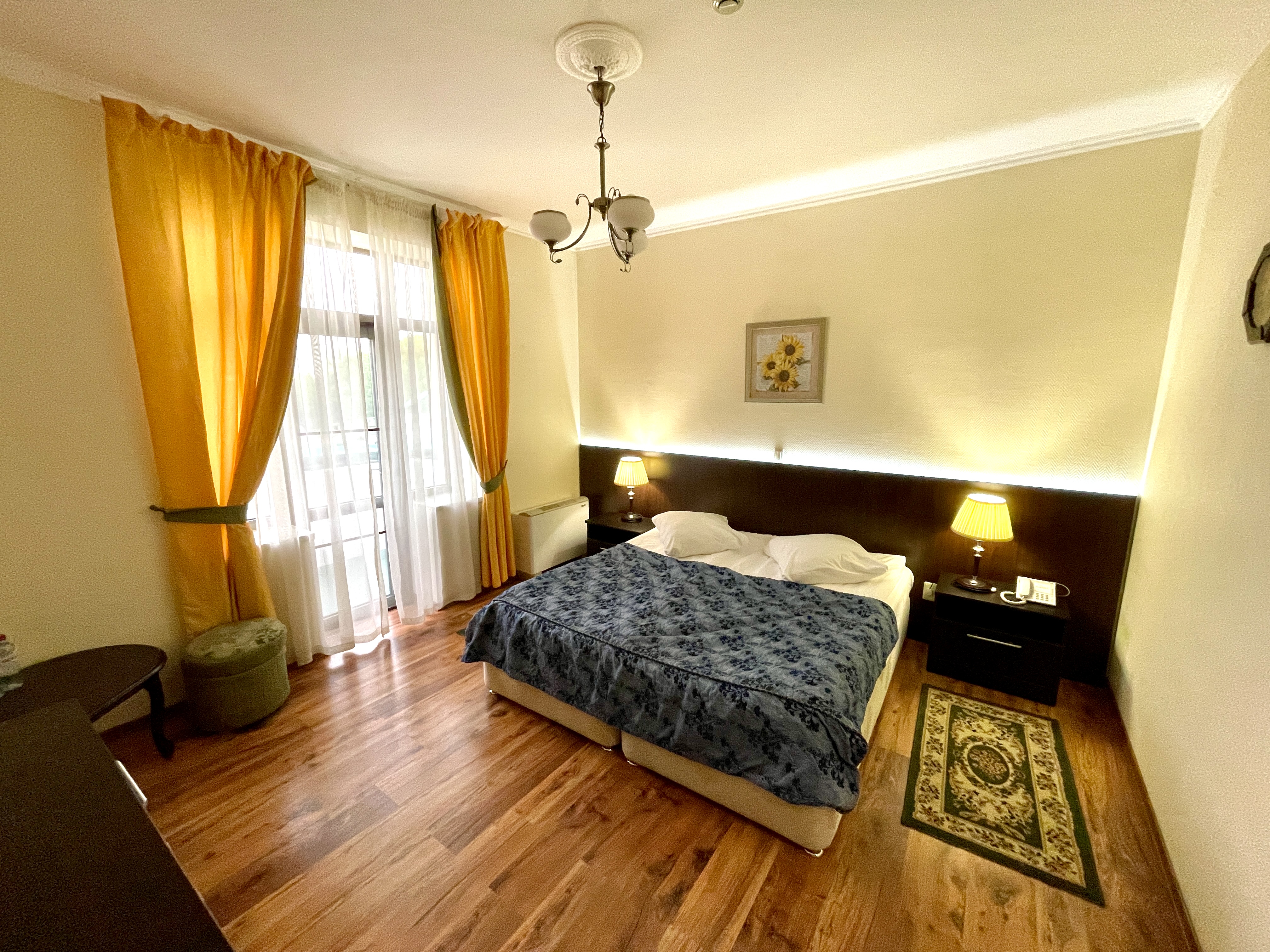 В номере: диван, зеркало, кровать двуспальная, прикроватные тумбочки, стол, стул, шкаф встроенный, сейф, телевизор, телефон, утюг, холодильник, электрочайник