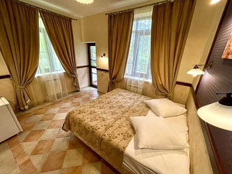 Немного дальше – Мацестинский источник и другие интересные достопримечательности. До центра Сочи – 8 км и столько же до Адлерского курортного городка. Аэропорт находится в 20 км от пансионата, а железнодорожный вокзал – в 10 км. Всего 2-3 км до прославленных Агурских водопадов и горы Ахун. До бальнеологического комплекса «Мацеста» чуть более 5 минут езды. Море – в 800 м от пансионата и это расстояние преодолевается неспешным прогулочным шагом за 10 минут.Наиболее желательным местом поселения отель считается у тех, кто хочет безмятежного отдыха, прогулок по аллеям парка, оздоровительных процедур, уюта и тишины. Он одинаково удобен для семей с детьми, молодёжи и пожилых людей, романтических пар, дружеских компаний. К услугам бизнесменов, сочетающих отдых с работой – комната для переговоров и другие конгрессные возможности. На собственной территории комплекса пансионата площадью в 2 га, состоящего из двух корпусов, много мест для активного и релакс-отдыха, масса зелёных субтропических растений, полянки, беседки, столики и скамейки, прогулочные аллеи, места для пикника и барбекю, терраса-солярий и другие удобства. С возвышенности, на которой он расположен, и из окон корпусов открываются великолепные виды побережья, горных отрогов, дендрапарка.Все номера гостиницы просторны и отличаются оформлением и меблировкой в классическом стиле. В каждом есть собственный санузел с душем или ванной, кондиционер, телевизор, холодильник и wi-fi, другие бытовые приборы, посуда, гигиеническая косметика.На территории пансионата немало оздоровительных комплексов, среди которых: банный, с финской сауной, массажный и косметологический кабинеты и фитнес-центр.Любители спорта имеют возможность пользоваться тренажёрным залом, оборудованием для игры в настольный теннис, сыграть в бильярд, принять участие в пешей прогулке. Работает экскурсионное бюро.В пансионате работает основной ресторан «Дольче Вита», специализирующийся на европейской, средиземноморской и итальянской кухнях. Кроме этого в окрестностях имеется масса самых разных пунктов питания на любой вкус.Дети, отдыхающие в пансионате с родителями, имеют право на льготы и скидки, зависящие от их возраста. Для них бесплатна аренда колясок и кроваток, есть игровая комната и детская площадка – городок не улице, практикуются услуги няни. На пляж пансионата можно добраться пешком, на бесплатном микроавтобусе, совершающим регулярный рейсы на берег в течение дня, или на специальном «сталинском» лифте, устроенном в горном тоннеле. Благоустроенный охраняемый пляж имеет галечное покрытие и оборудован душевыми, кабинками для переодевания и туалетом, а также шезлонгами, лежаками, навесами, зонтами и пляжными полотенцами.