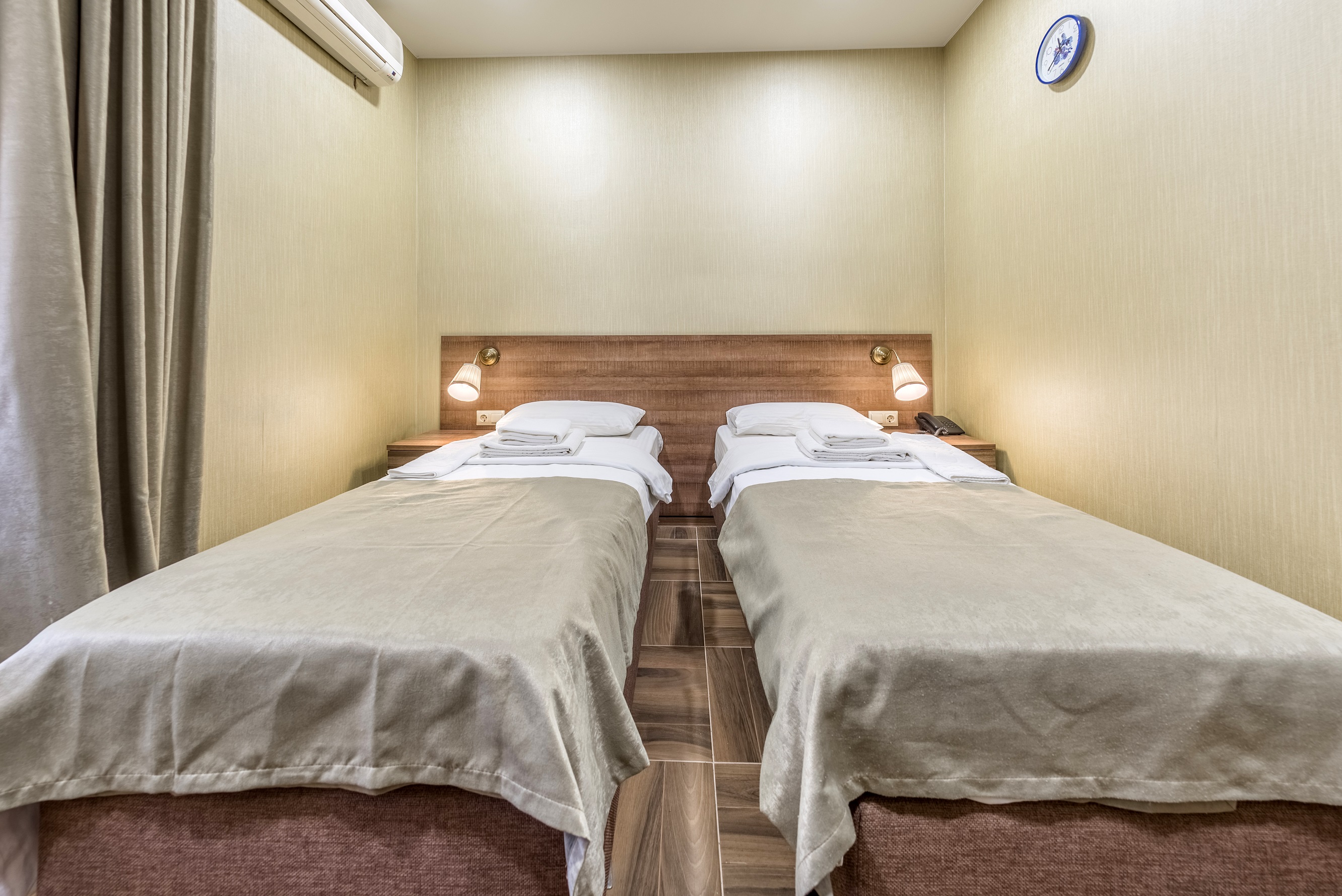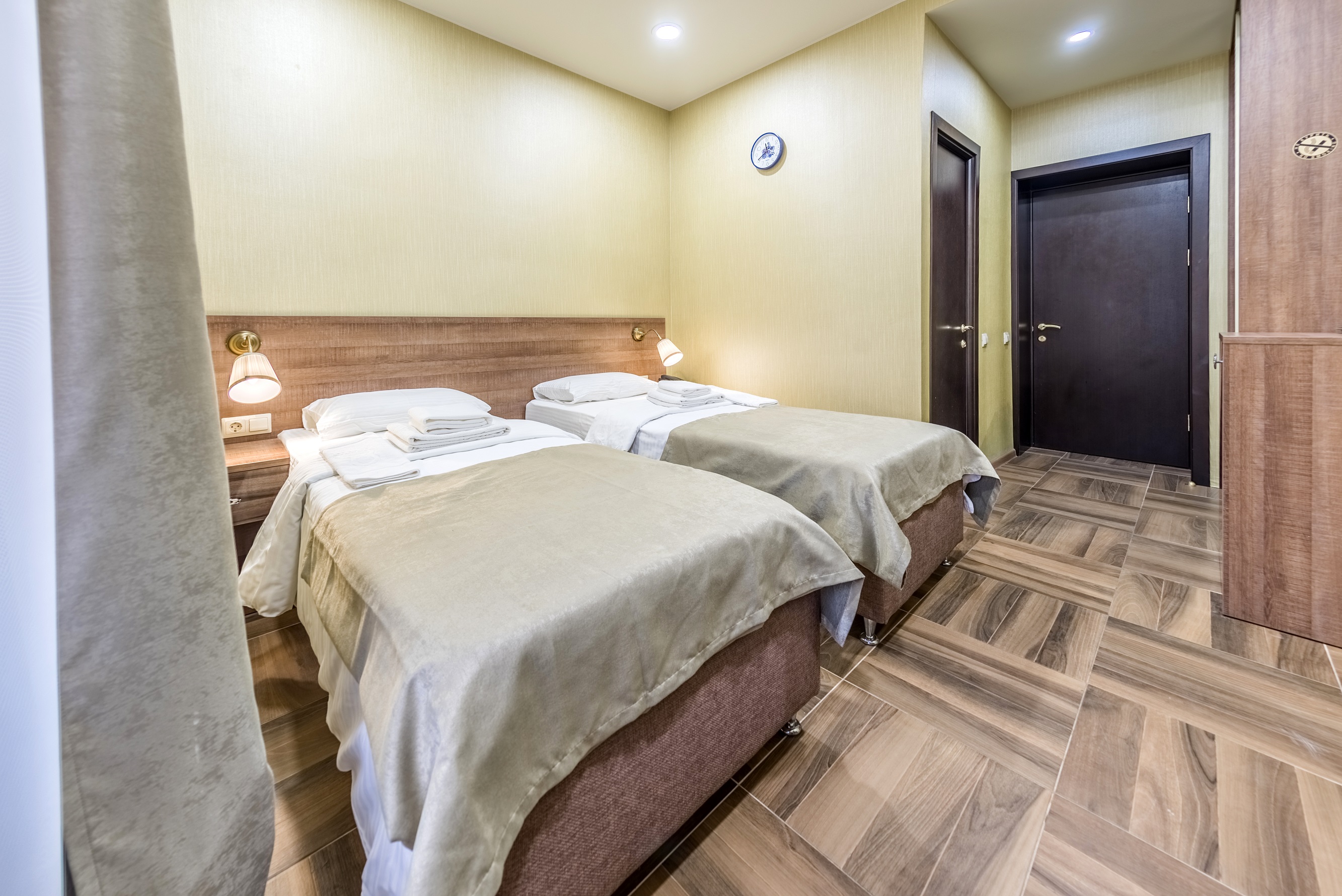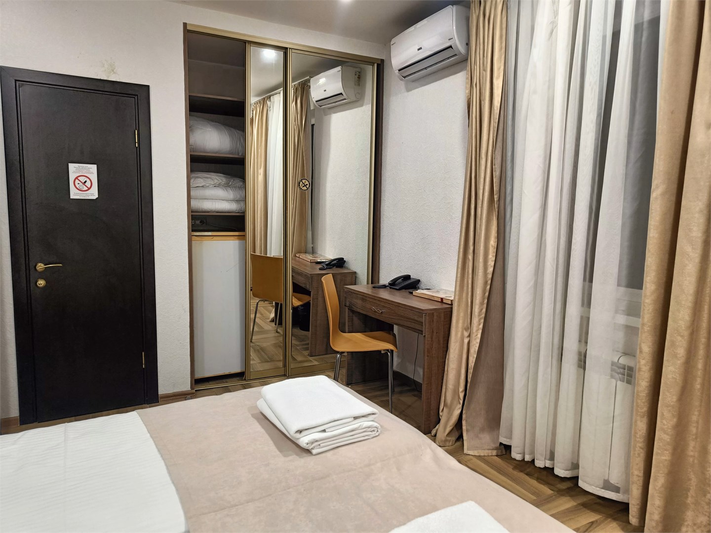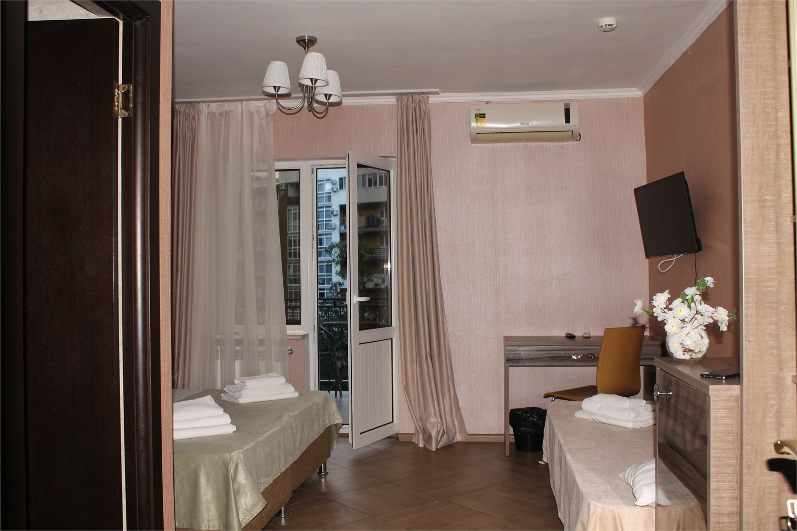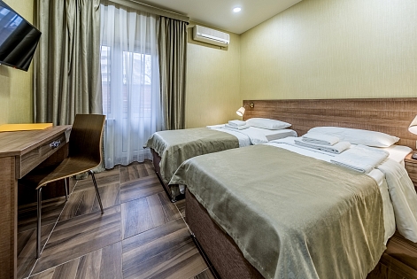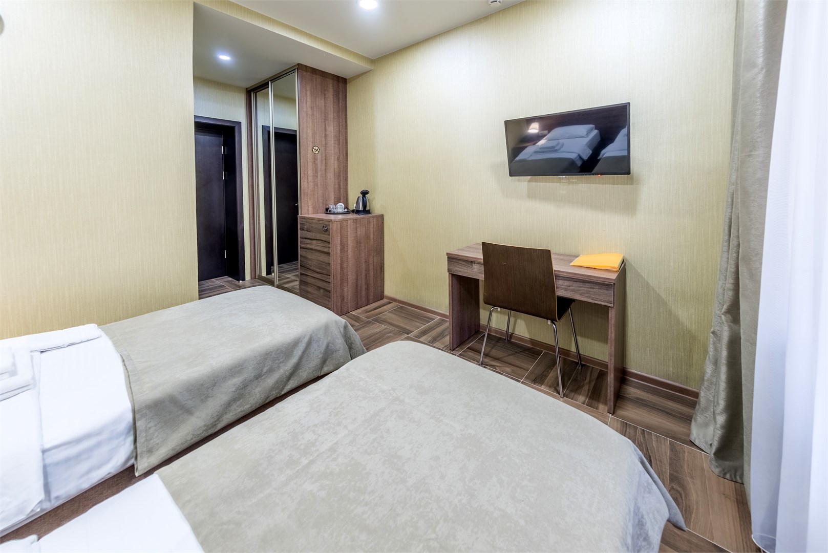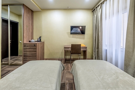 В номере: вешалка, зеркало, кровати односпальные /одна двуспальная кровать, прикроватные тумбочки, стол, стул, тумба, шкаф-купе, кондиционер, мини-холодильник, телевизор, чайный набор посуды, электрочайник