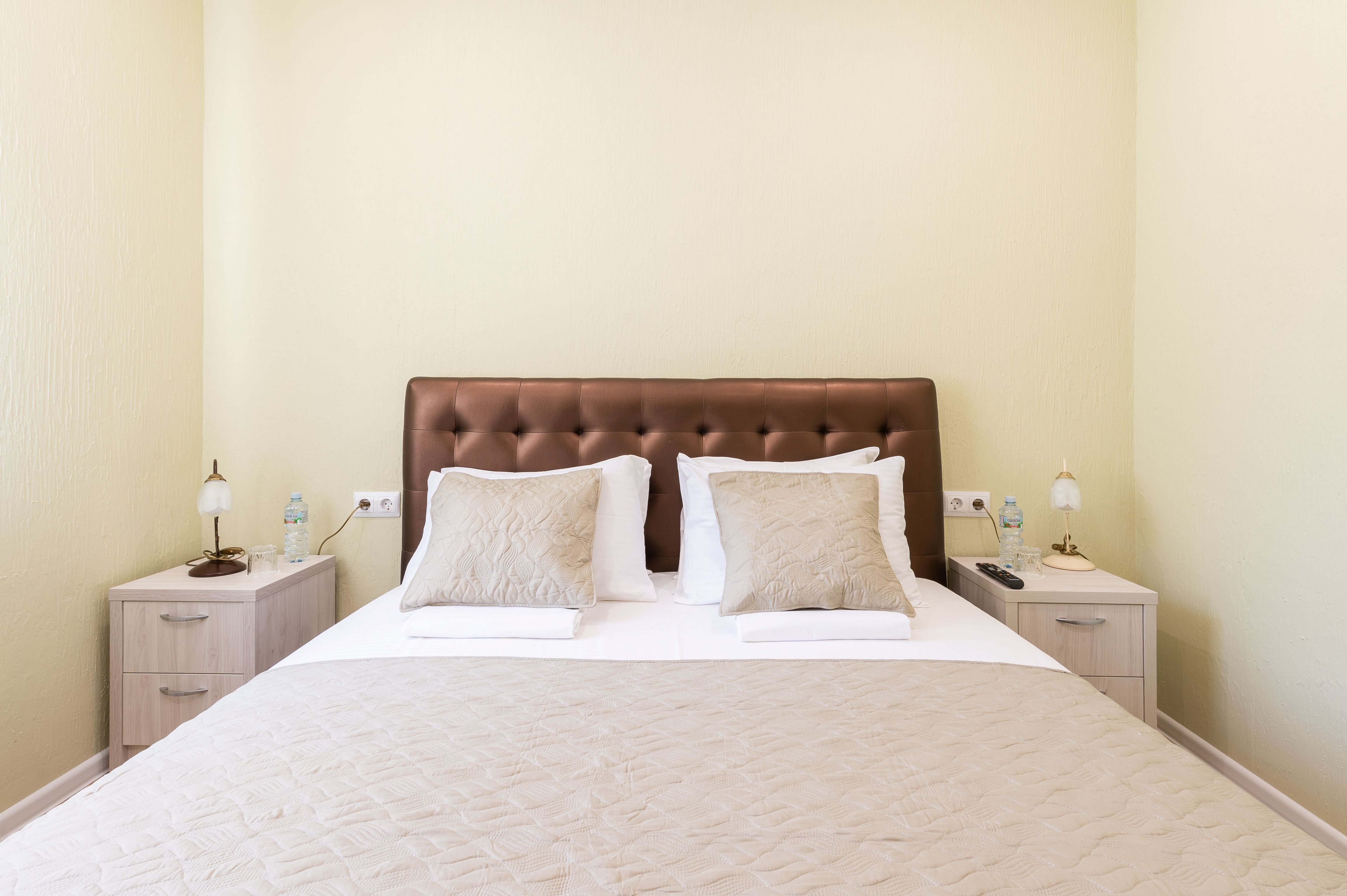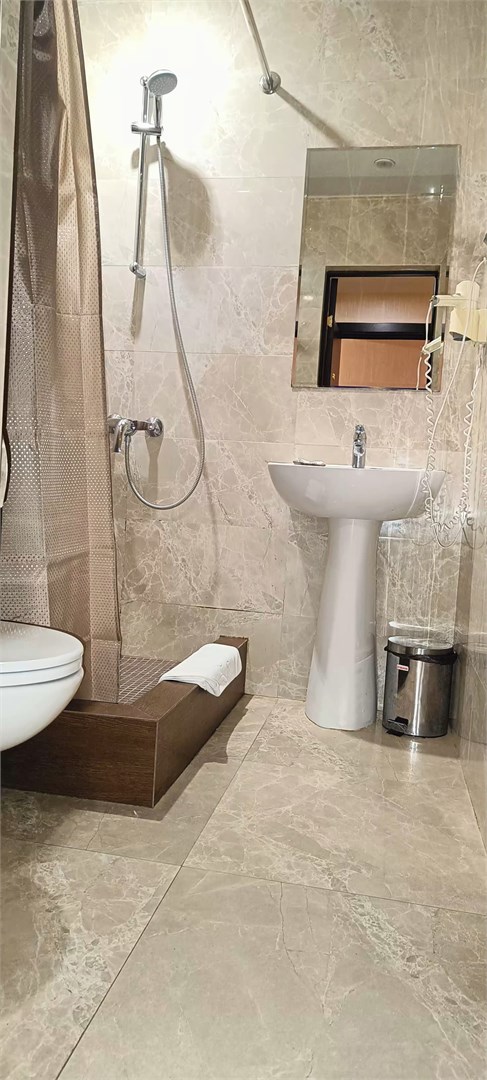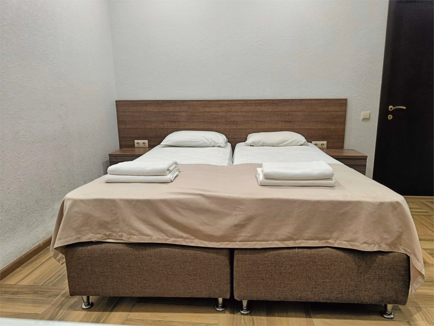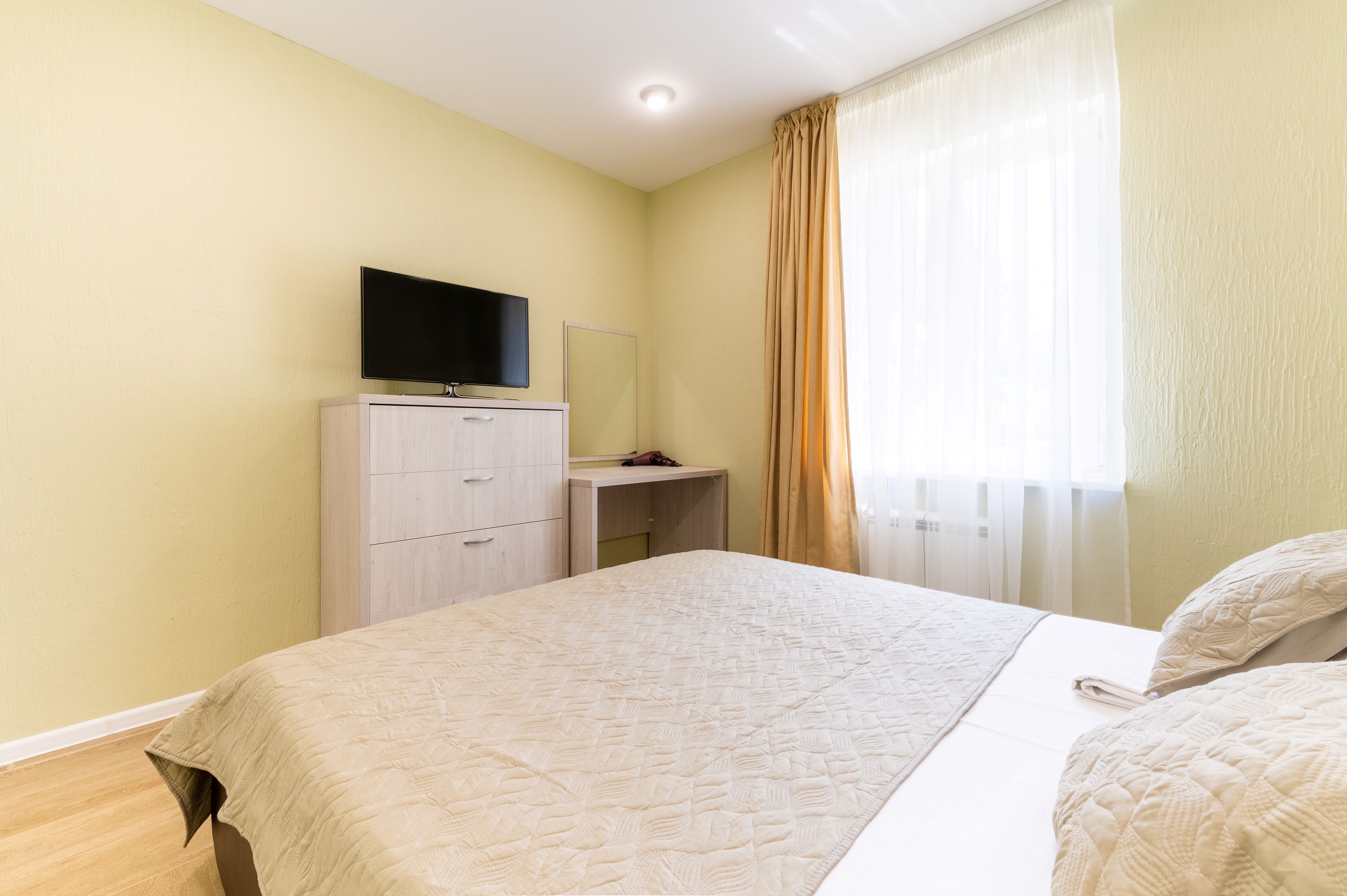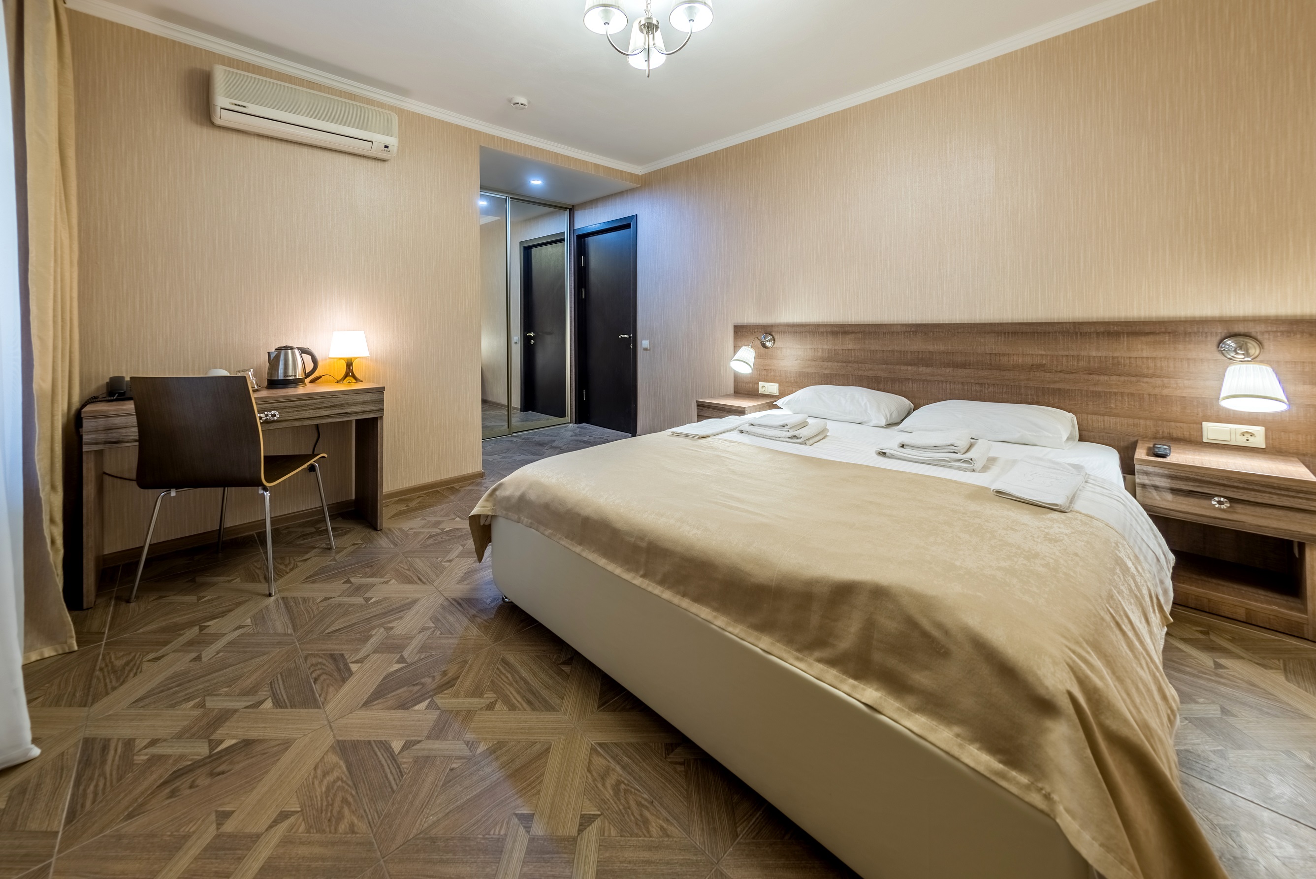 В номере: вешалка, зеркало, кровати односпальные /одна двуспальная кровать, прикроватные тумбочки, стол, стул, тумба, шкаф-купе, кондиционер, мини-холодильник, телевизор, чайный набор посуды, электрочайник