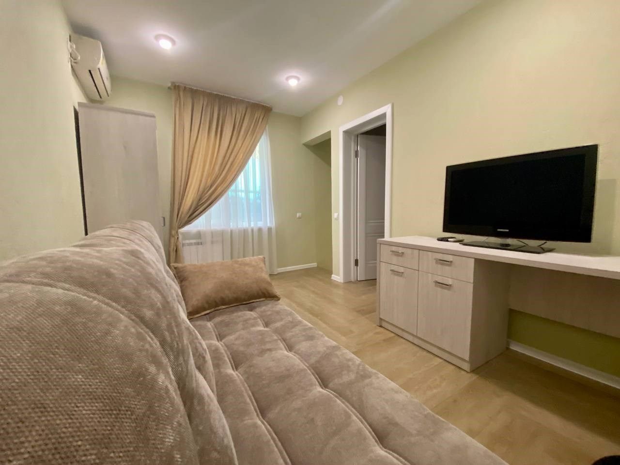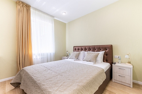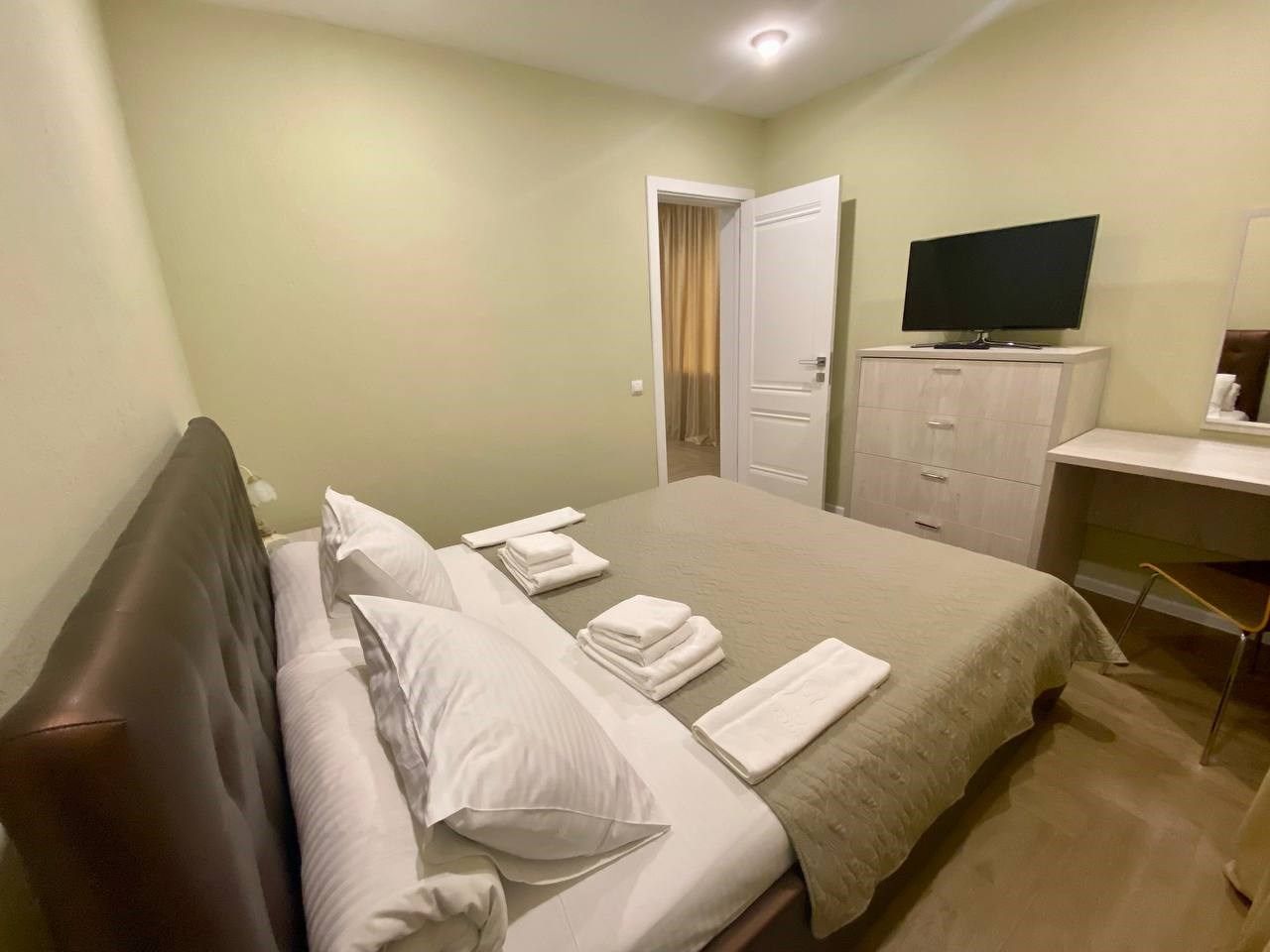 В номере: вешалка, диван раскладной, зеркало, комод, кровать двуспальная, кухонная мебель, прикроватные тумбочки, стол, стол обеденный, стулья, тумба, шкаф, гладильная доска, кондиционер, микроволновая печь, набор посуды, плита индукционная, стиральная машина, телевизор ЖК, утюг, холодильник, чайный набор посуды, электрочайник