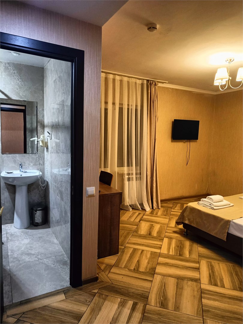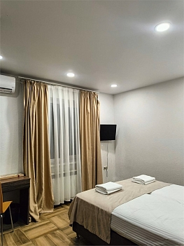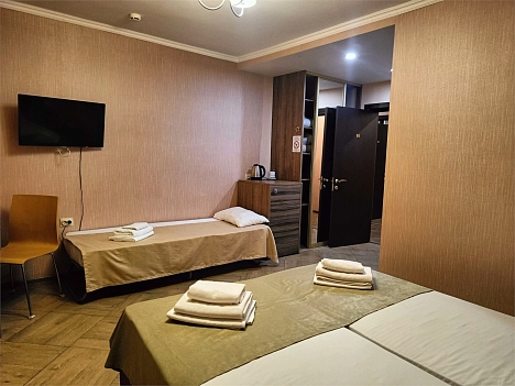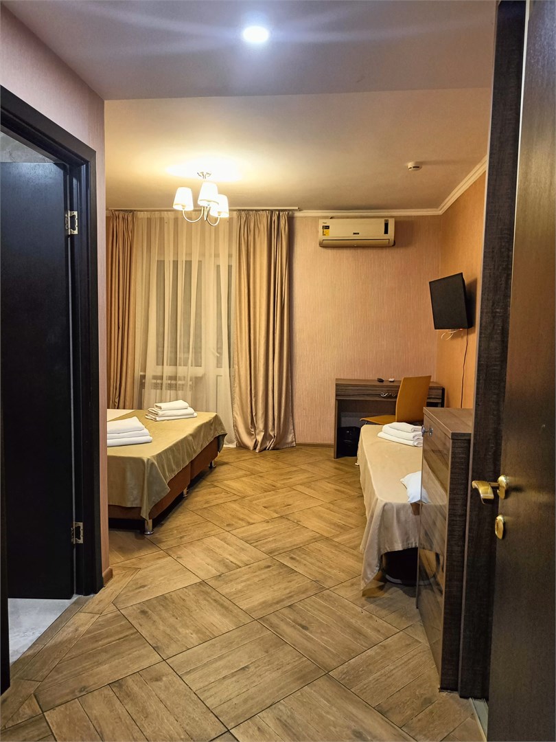 В номере: вешалка, зеркало, кровати односпальные /одна двуспальная кровать, стол, стулья, шкаф, кондиционер, мини-холодильник, телевизор