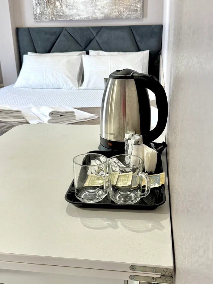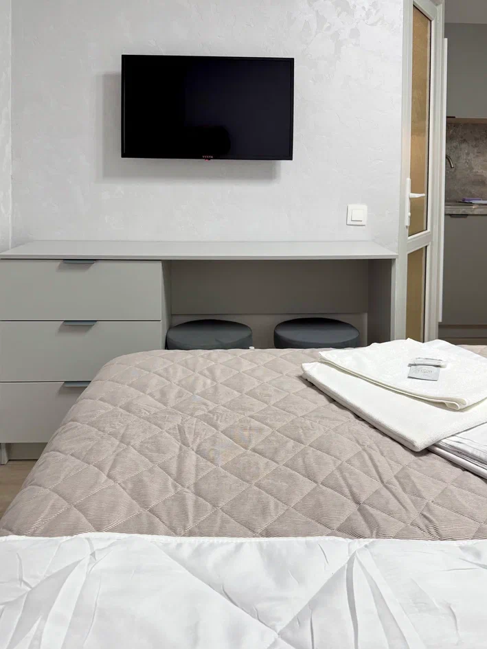 Трехэтажное здание, выполненное в современном стиле, предлагает для размещения 35 светлых студий с собственной кухней. Каждый номер оборудован всем необходимым для полноценного отдыха: телевизором, кондиционером, холодильником и уютной кухонной зоной с микроволновой печью, электрочайником и посудой. Для комфорта гостей на территории обустроены просторная терраса и мангальная зона, доступна общая кухня самообслуживания. Отель предоставляет услуги прачечной и гладильной, а на всей территории работает бесплатный Wi-Fi. Всего семь-десять минут неспешной прогулки по ровной дороге можно дойти до моря и собственного мелкогалечного пляжа с полным набором удобств: лежаками, зонтами, душевыми, кафе и баром.