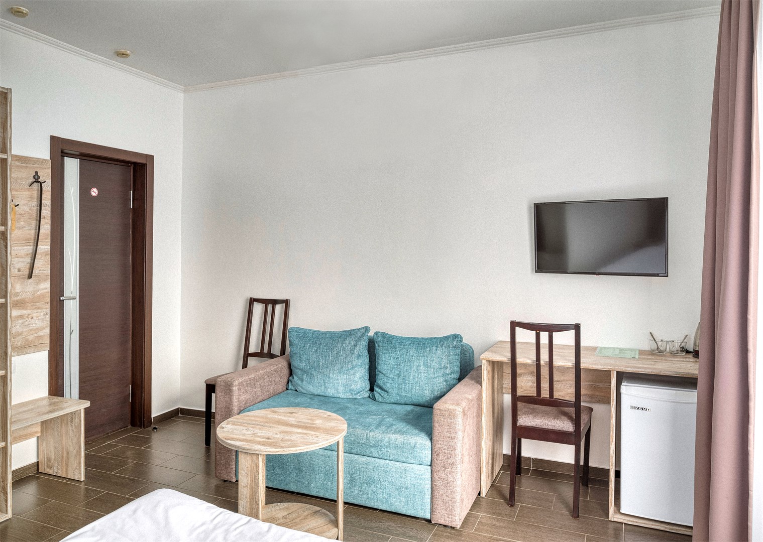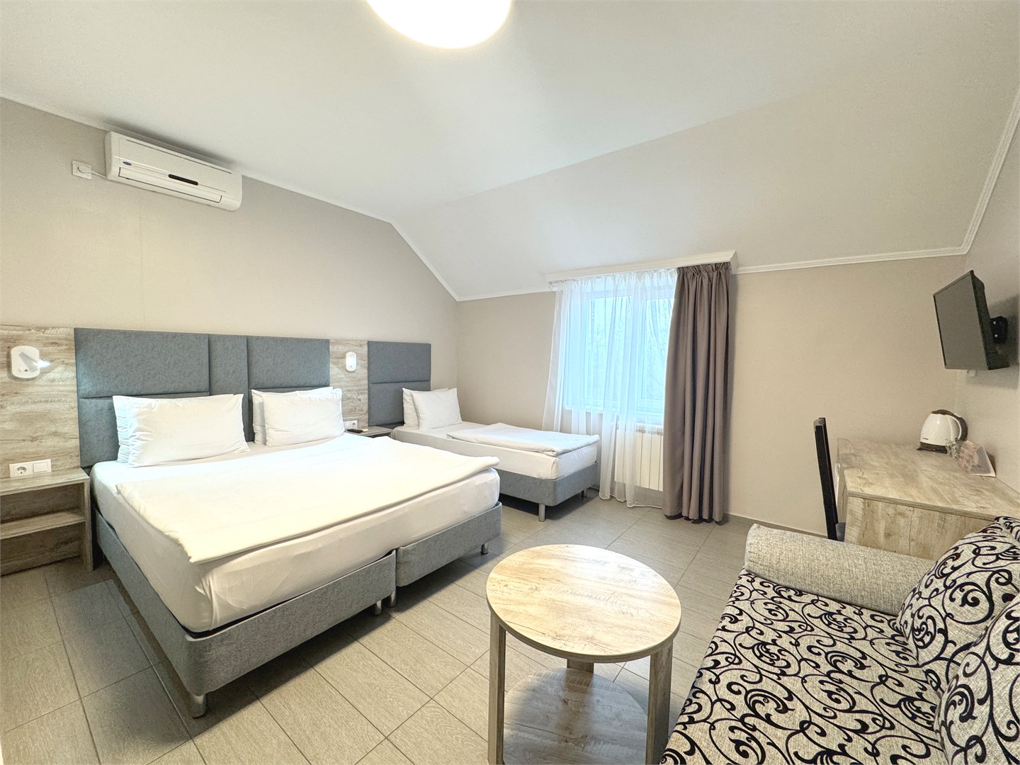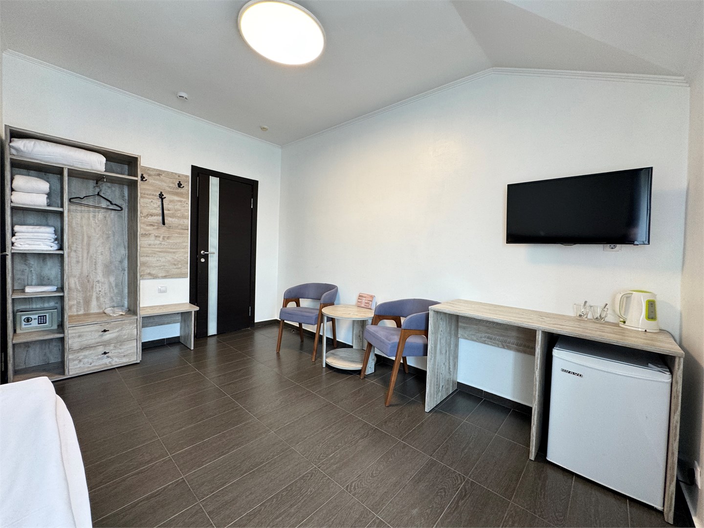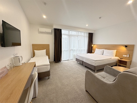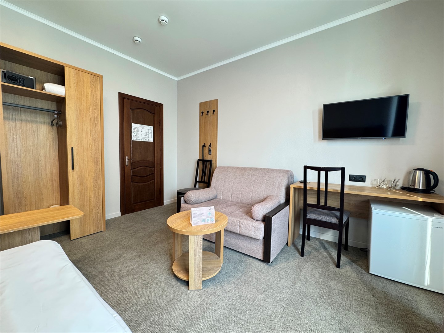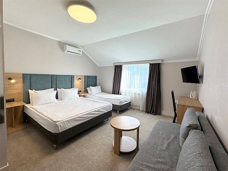В номере: вешалка, диван, зеркало, кровать двуспальная, кровать односпальная, прикроватные тумбочки, стол, столик журнальный, стулья, тумба багажная, шкаф, мини-холодильник, сейф, сплит-система, телевизор, чайный набор посуды, электрочайник