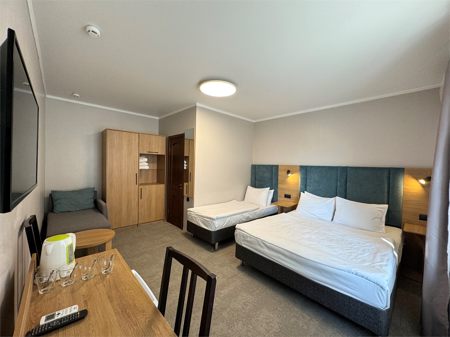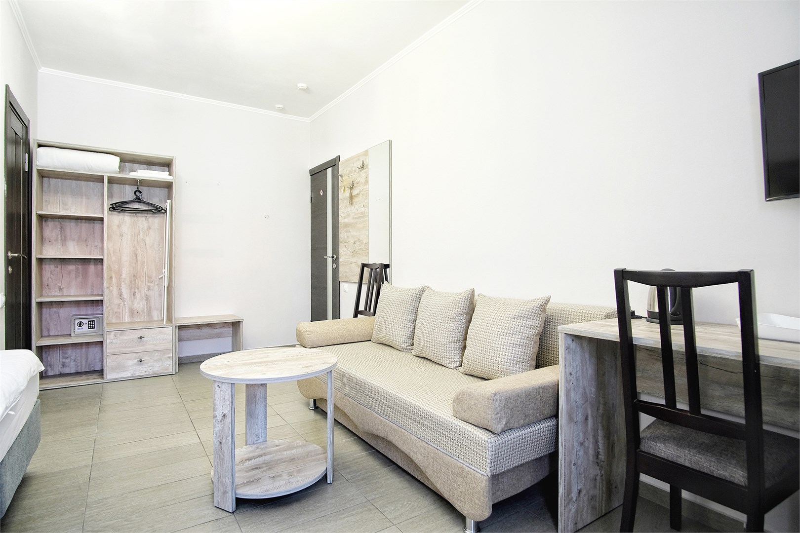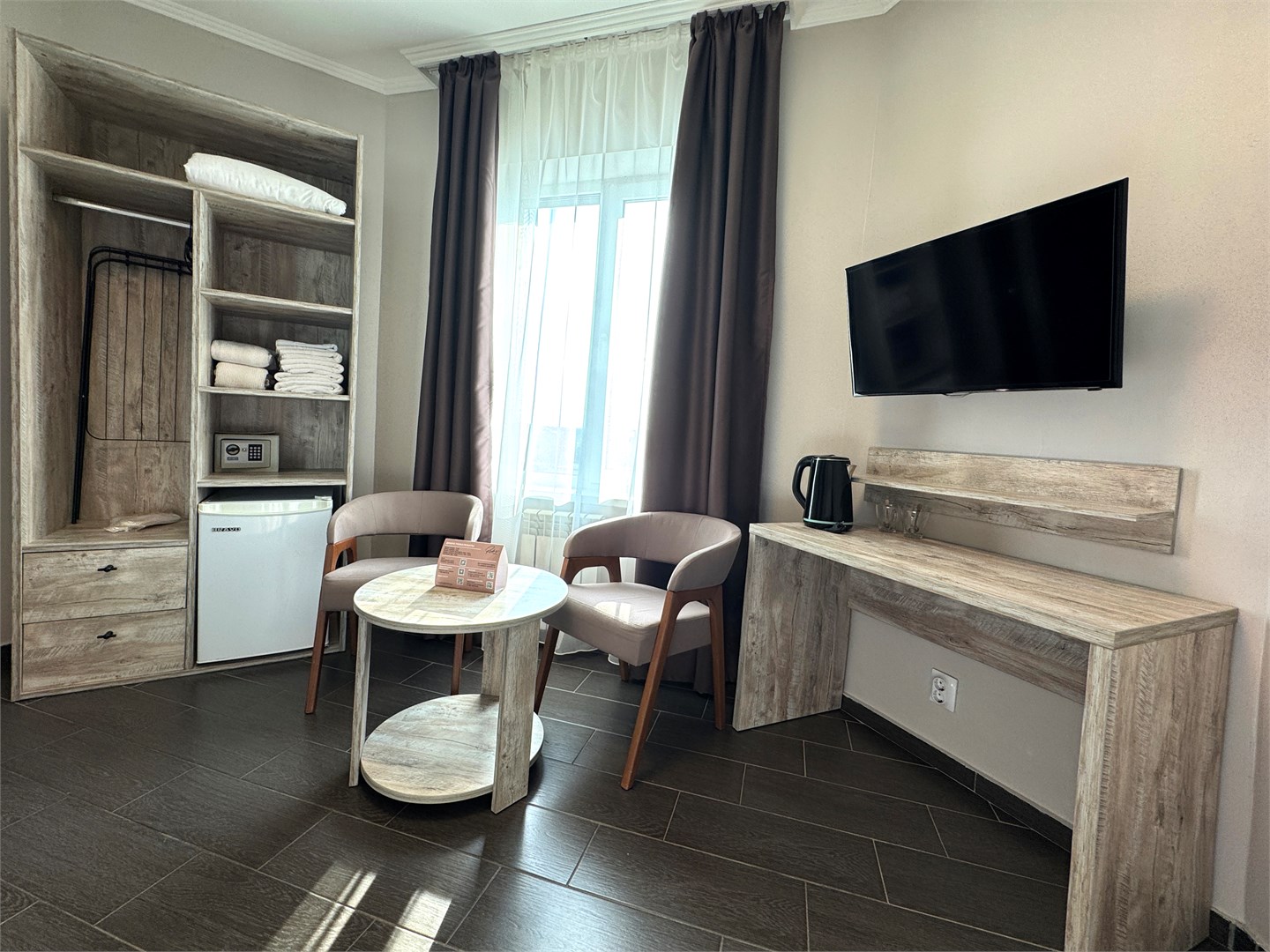 В номере: вешалка, диван, зеркало, кровать двуспальная, кровать односпальная, прикроватные тумбочки, стол, столик журнальный, стулья, тумба багажная, шкаф, мини-холодильник, сейф, сплит-система, телевизор, чайный набор посуды, электрочайник