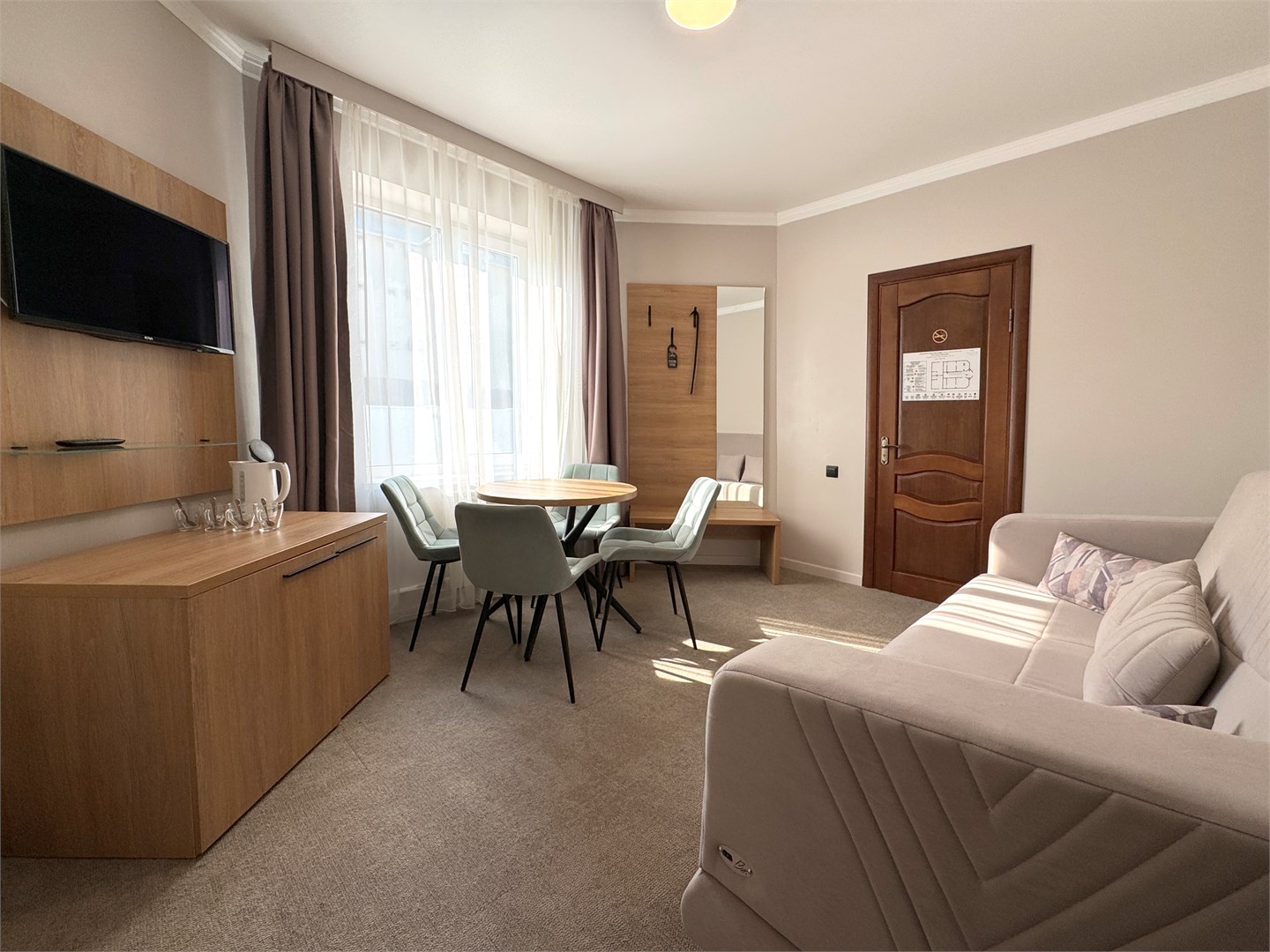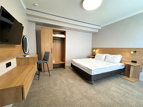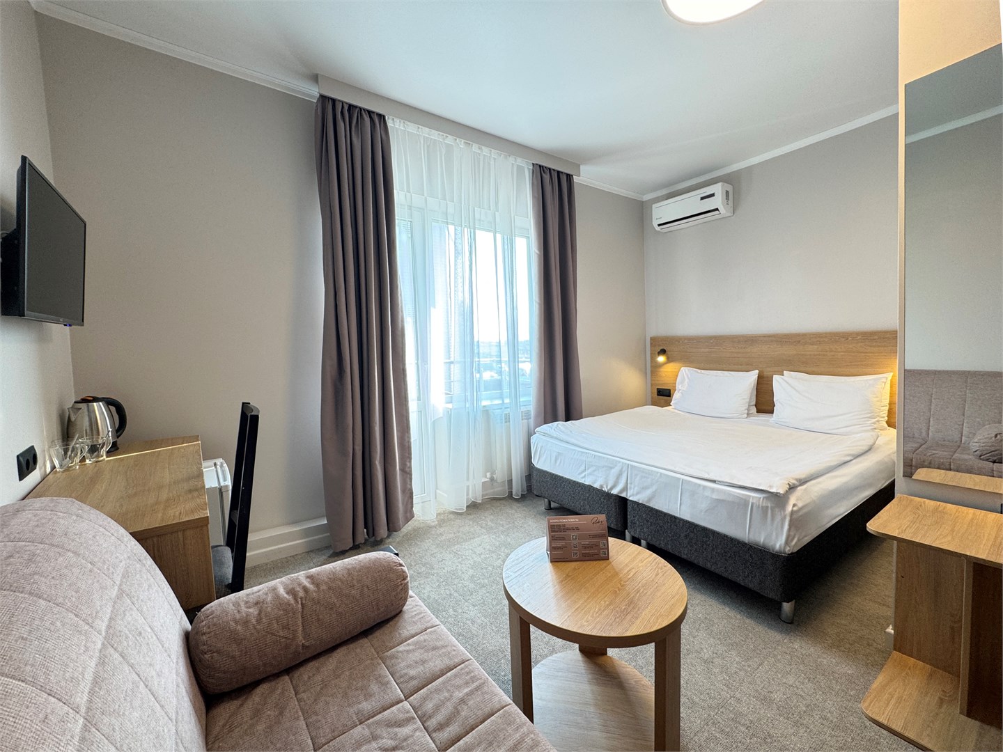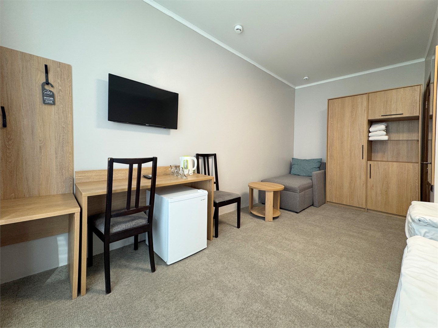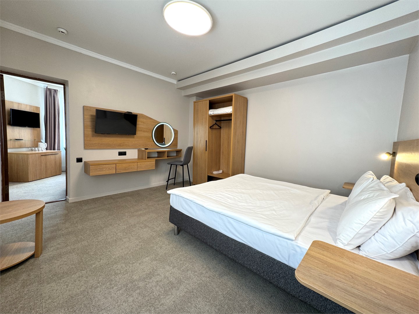 В номере: вешалка, диван, зеркало, кровать двуспальная, кровать односпальная, прикроватные тумбочки, стол, столик журнальный, стулья, тумба багажная, шкаф, мини-холодильник, сейф, сплит-система, телевизор, чайный набор посуды, электрочайник