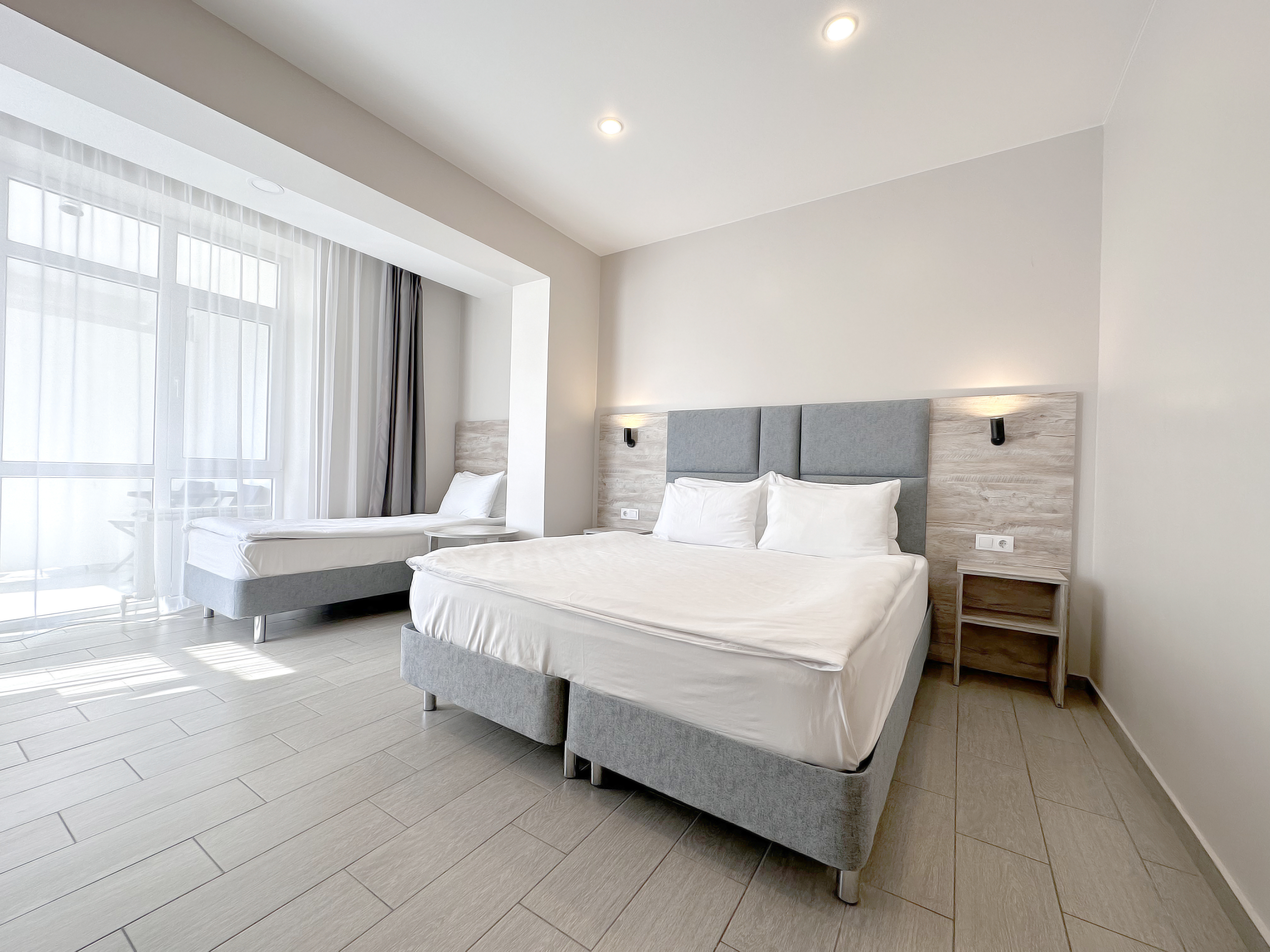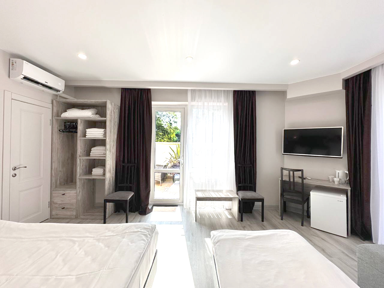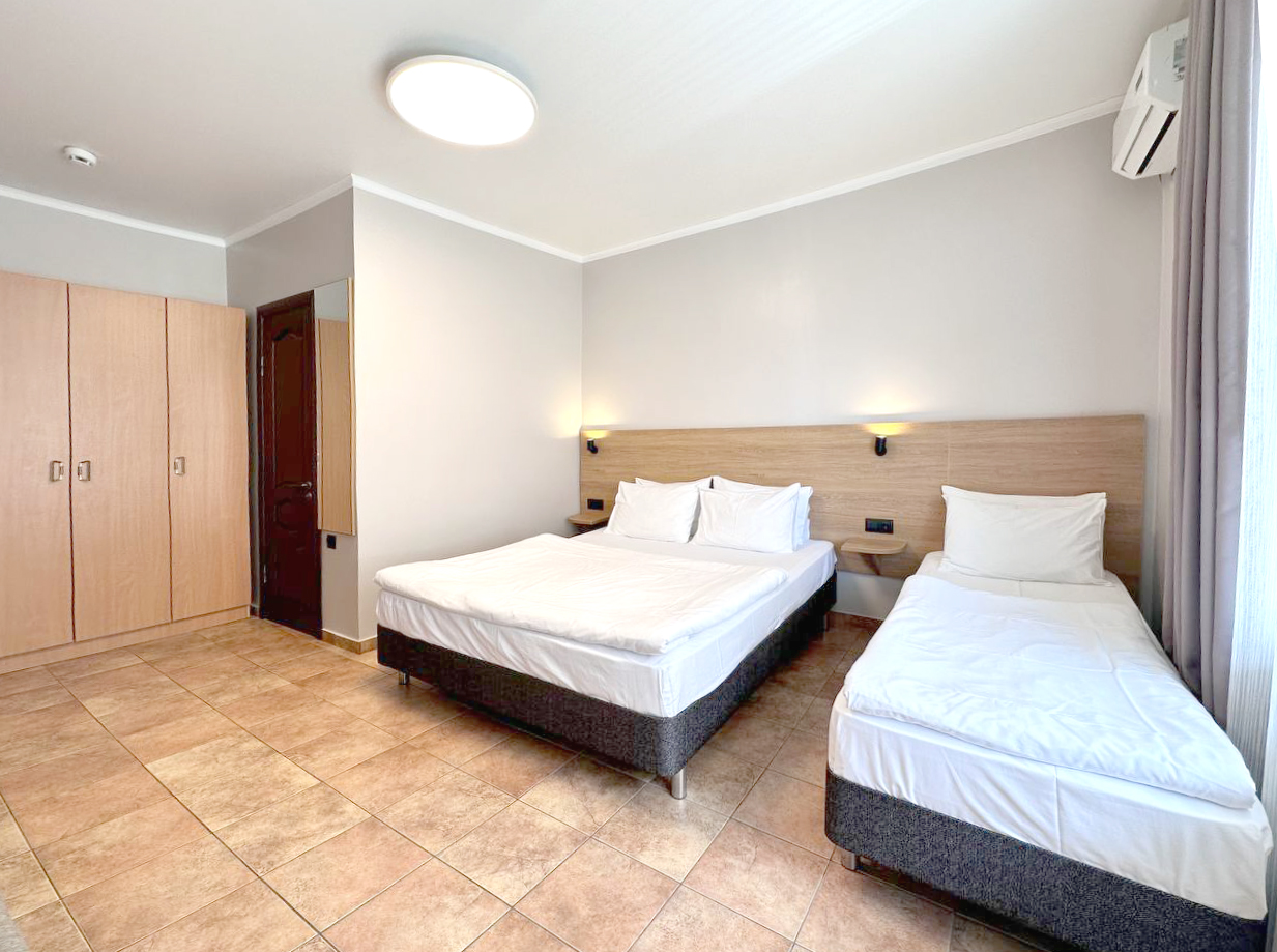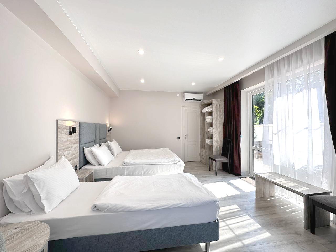 Гостей ожидают двух- и трехместные номера разной категории. В комнатах светлый современный интерьер и есть все необходимое для комфортного проживания — индивидуальный санузел, телевизор, мини-холодильник, электрочайник, везде установлена сплит-система, а в некоторых номерах предусмотрены балконы.При отеле работает ресторан, где отдыхающие могут заказать себе трехразовое питание. В распоряжении отдыхающих открытый бассейн с подогревом и зона отдыха рядом. Среди услуг — парковка для гостей с машинами, беспроводной интернет и прачечная. Для малышей администрация отеля предоставляет детские кроватки, стульчики для кормления, а также велосипеды.В 5 минутах ходьбы от отеля находятся сразу несколько черноморских пляжей. Все они покрыты мелкой галькой и хорошо оборудованы. На побережье установлены раздевалки, навесы, лежаки, работает прокат шезлонгов, доступны водные развлечения для детей и взрослых.