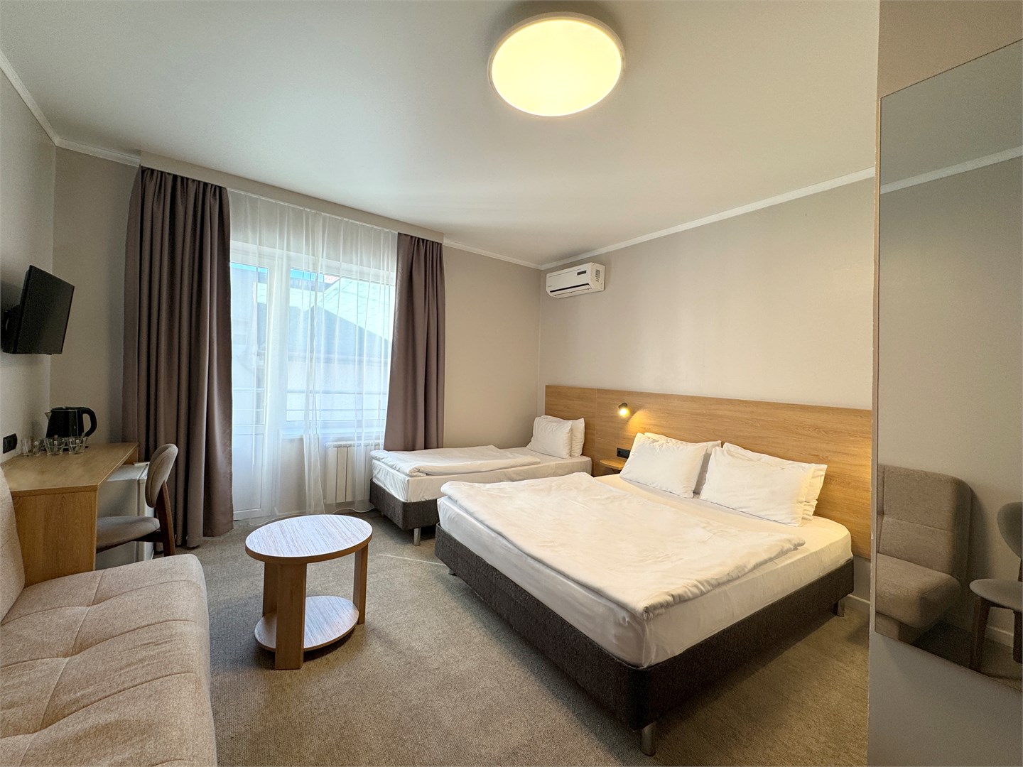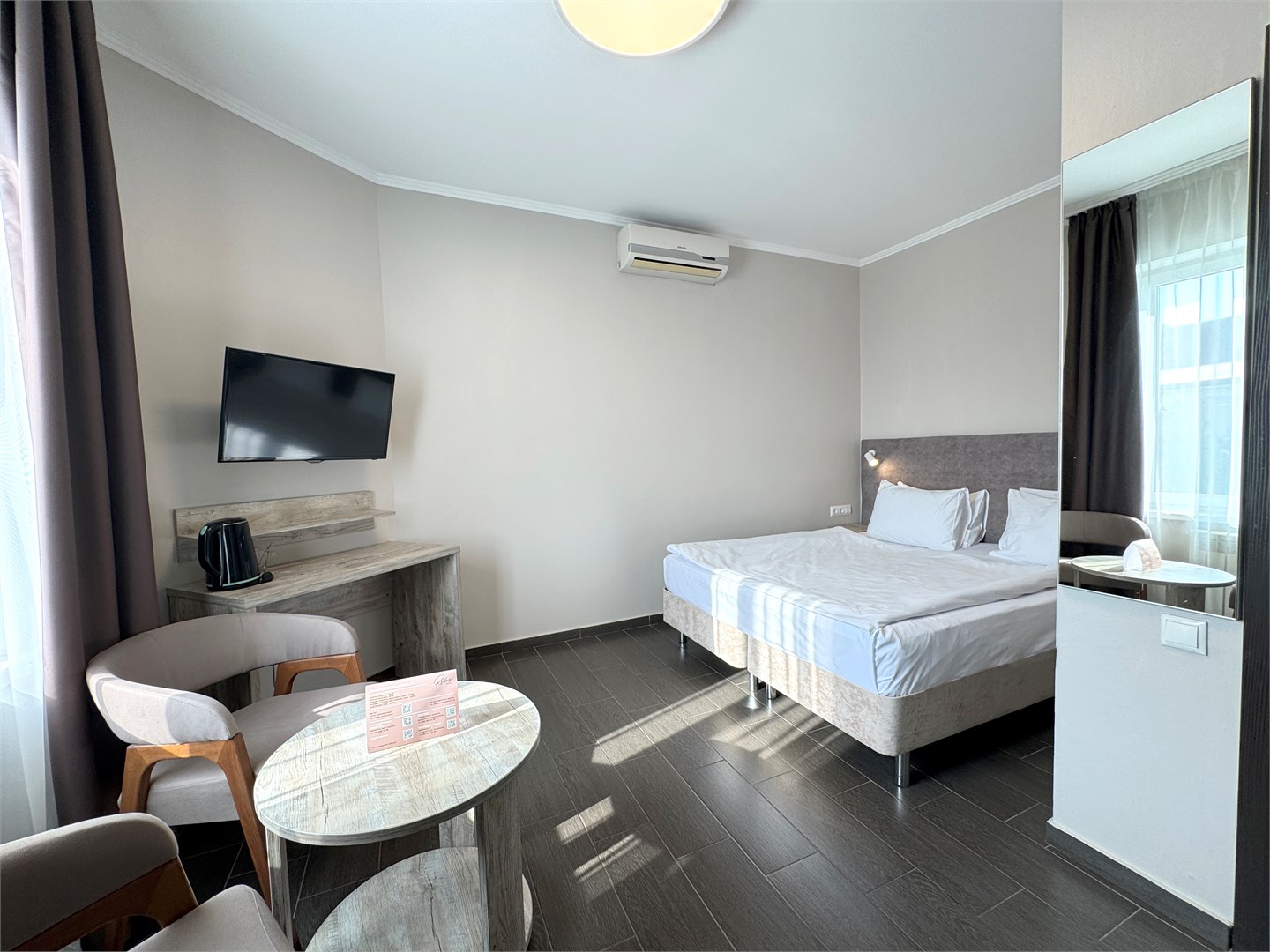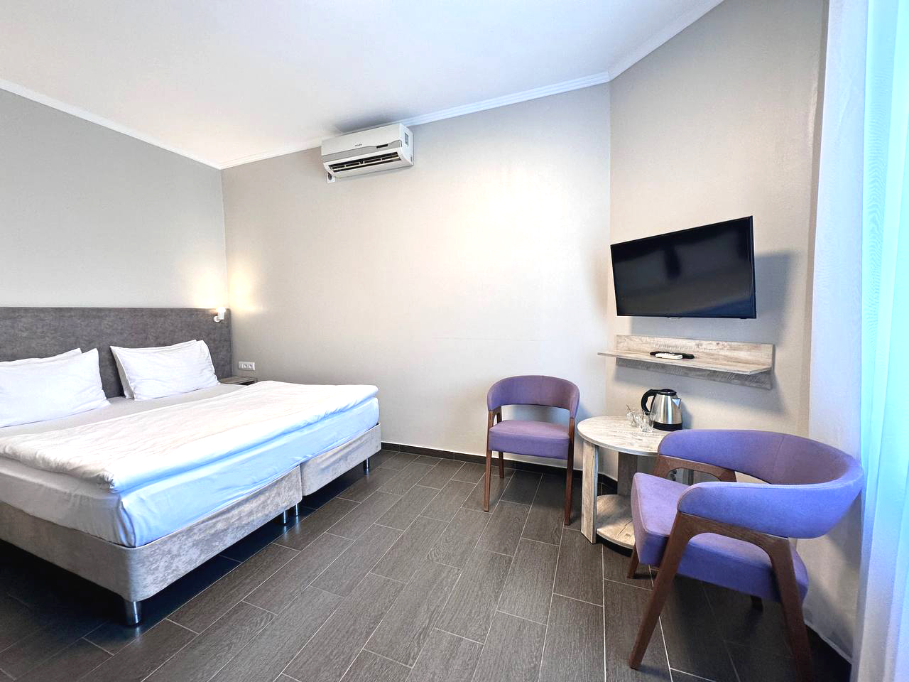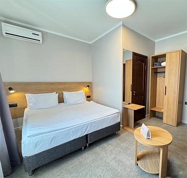 Гостей ожидают двух- и трехместные номера разной категории. В комнатах светлый современный интерьер и есть все необходимое для комфортного проживания — индивидуальный санузел, телевизор, мини-холодильник, электрочайник, везде установлена сплит-система, а в некоторых номерах предусмотрены балконы.При отеле работает ресторан, где отдыхающие могут заказать себе трехразовое питание. В распоряжении отдыхающих открытый бассейн с подогревом и зона отдыха рядом. Среди услуг — парковка для гостей с машинами, беспроводной интернет и прачечная. Для малышей администрация отеля предоставляет детские кроватки, стульчики для кормления, а также велосипеды.В 5 минутах ходьбы от отеля находятся сразу несколько черноморских пляжей. Все они покрыты мелкой галькой и хорошо оборудованы. На побережье установлены раздевалки, навесы, лежаки, работает прокат шезлонгов, доступны водные развлечения для детей и взрослых.