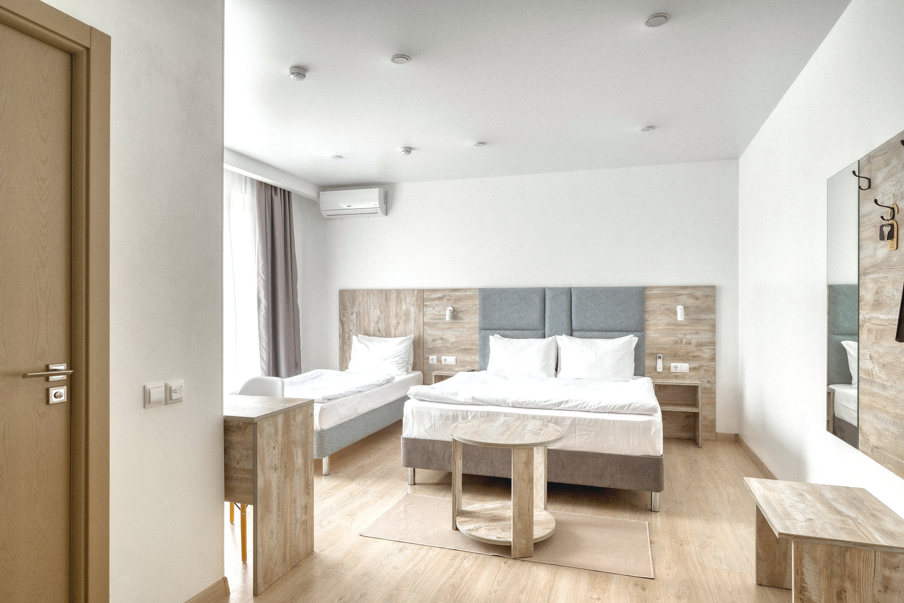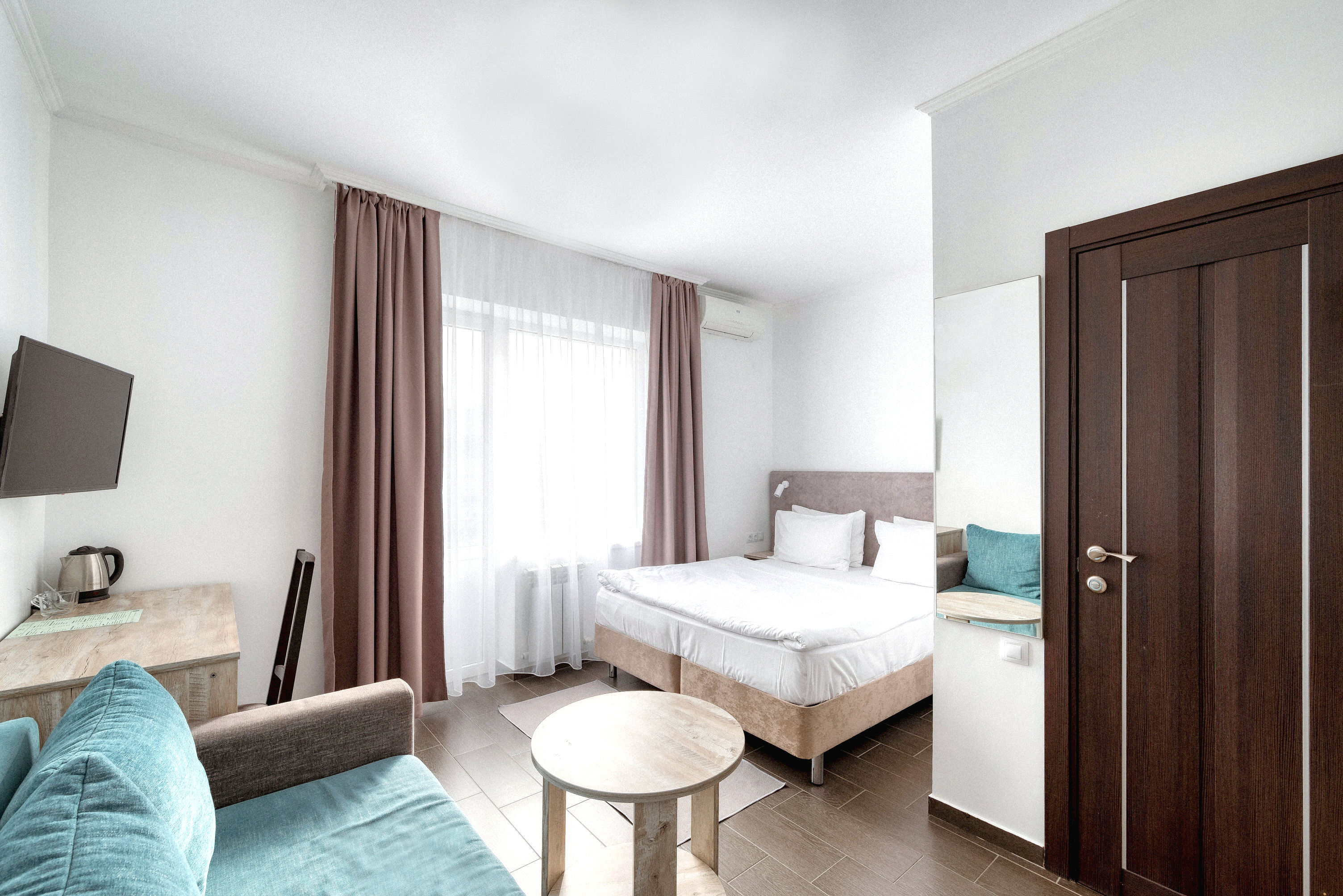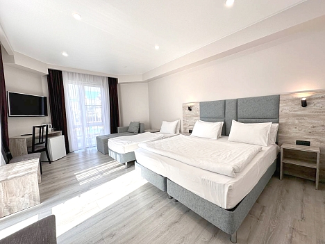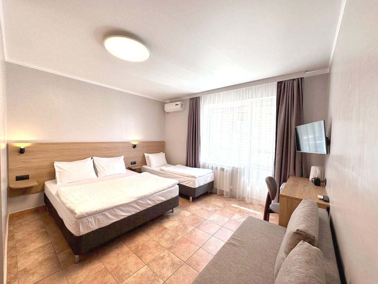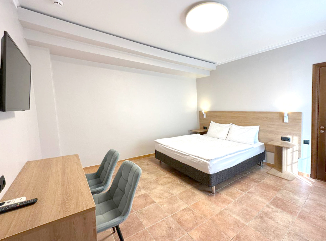 Гостей ожидают двух- и трехместные номера разной категории. В комнатах светлый современный интерьер и есть все необходимое для комфортного проживания — индивидуальный санузел, телевизор, мини-холодильник, электрочайник, везде установлена сплит-система, а в некоторых номерах предусмотрены балконы.При отеле работает ресторан, где отдыхающие могут заказать себе трехразовое питание. В распоряжении отдыхающих открытый бассейн с подогревом и зона отдыха рядом. Среди услуг — парковка для гостей с машинами, беспроводной интернет и прачечная. Для малышей администрация отеля предоставляет детские кроватки, стульчики для кормления, а также велосипеды.В 5 минутах ходьбы от отеля находятся сразу несколько черноморских пляжей. Все они покрыты мелкой галькой и хорошо оборудованы. На побережье установлены раздевалки, навесы, лежаки, работает прокат шезлонгов, доступны водные развлечения для детей и взрослых.