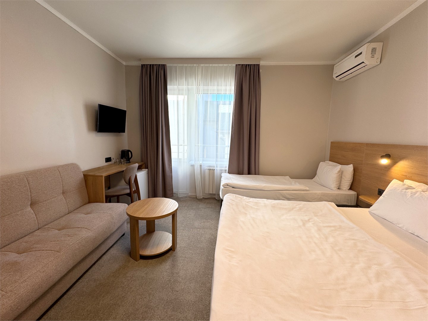 В номере: вешалка, диван, зеркало, кровати односпальные /одна двуспальная кровать, прикроватные тумбочки, стол, столик журнальный, стулья, тумба багажная, шкаф, мини-холодильник, сейф, сплит-система, телевизор, чайный набор посуды, электрочайник