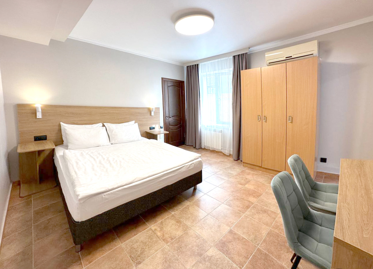 В номере: вешалка, диван, зеркало, кровать двуспальная, прикроватные тумбочки, столик журнальный, стулья, тумба багажная, шкаф, мини-холодильник, сейф, сплит-система, телевизор, чайный набор посуды, электрочайник