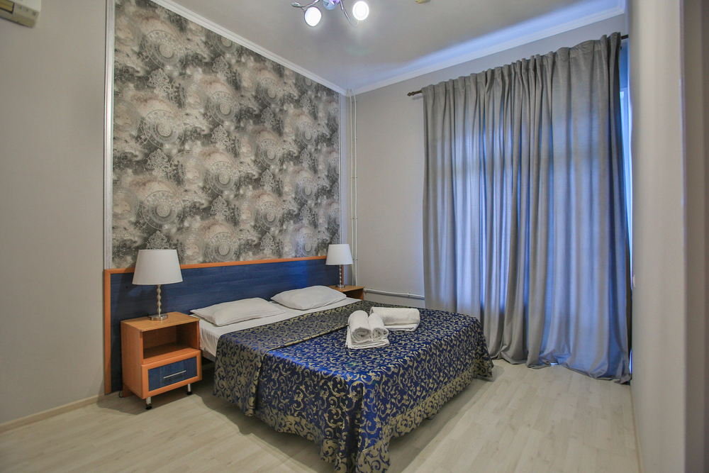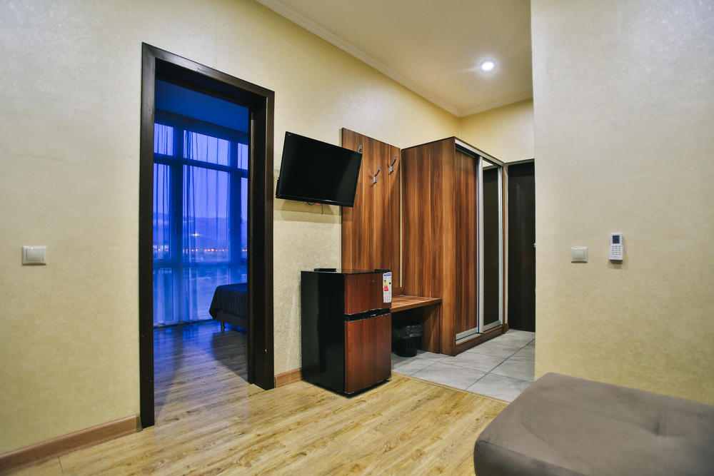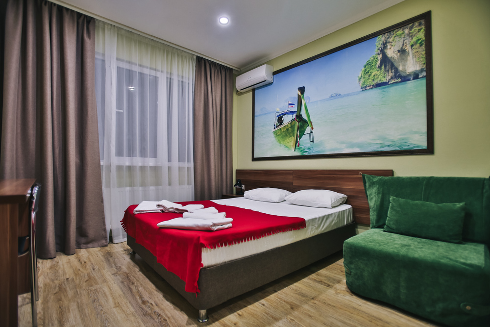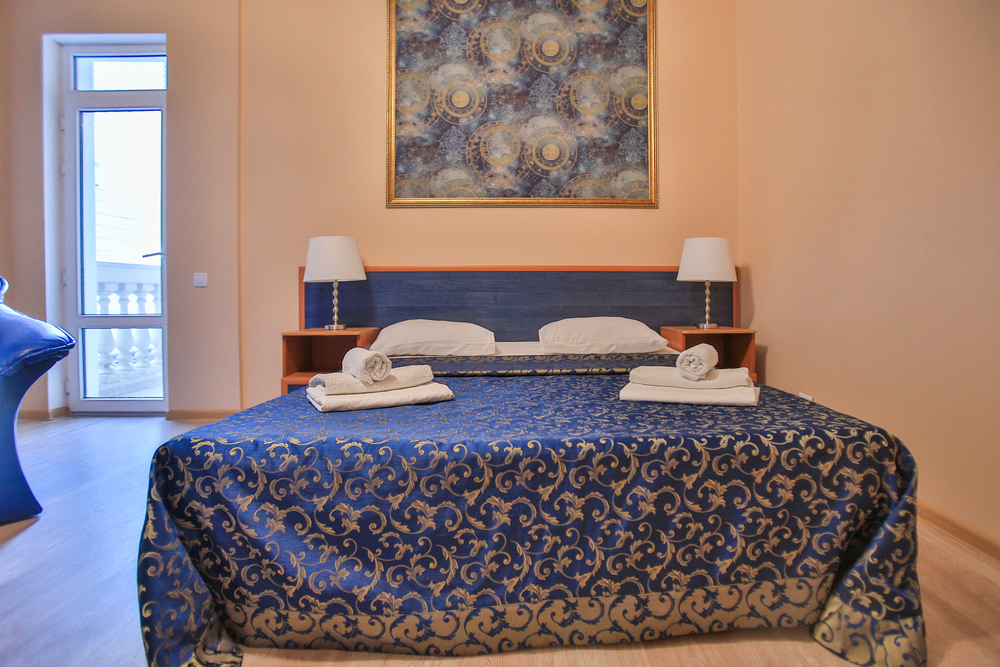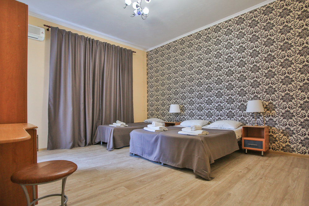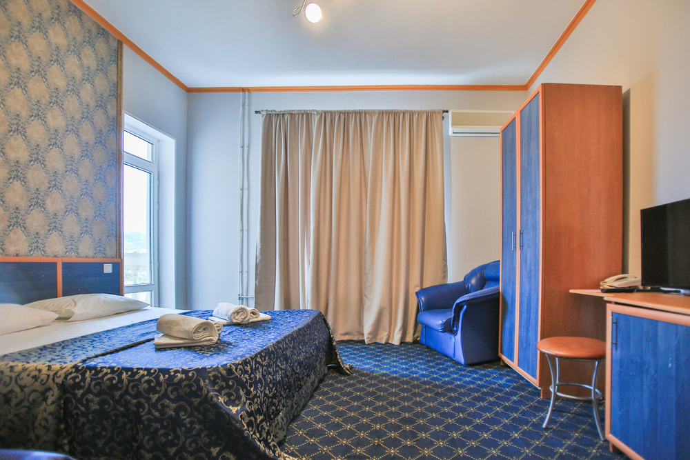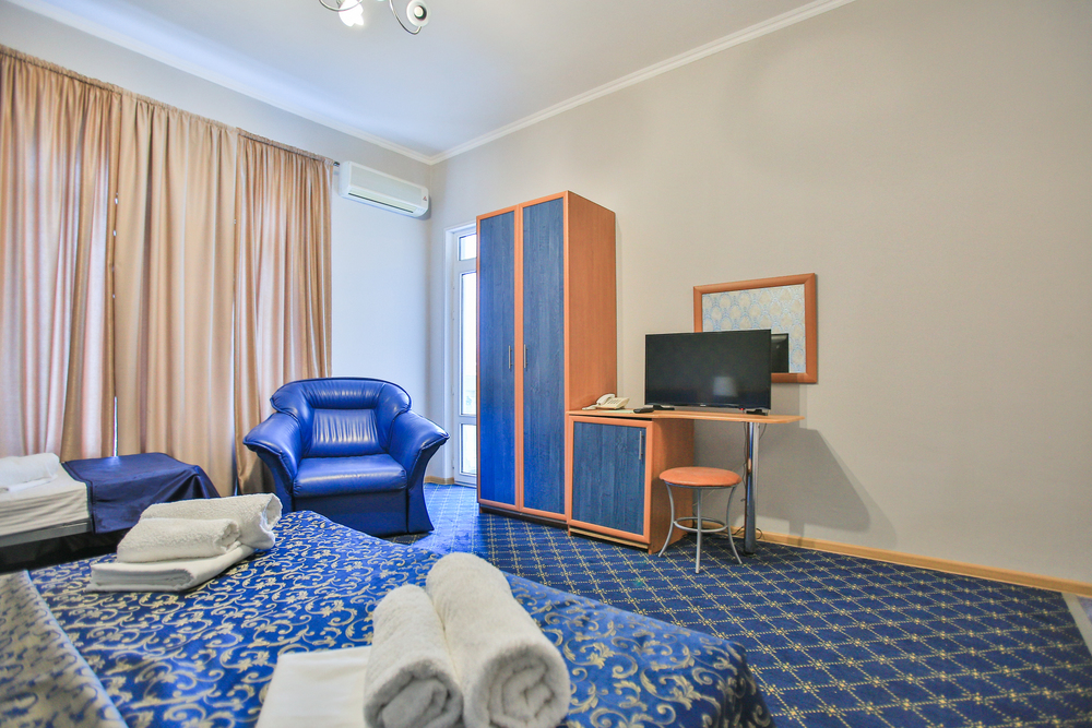 В номере: вешалка, диван раскладной, зеркало, кровать двуспальная, прикроватные тумбочки, стол, стулья, шкаф, кондиционер, телевизор, утюг