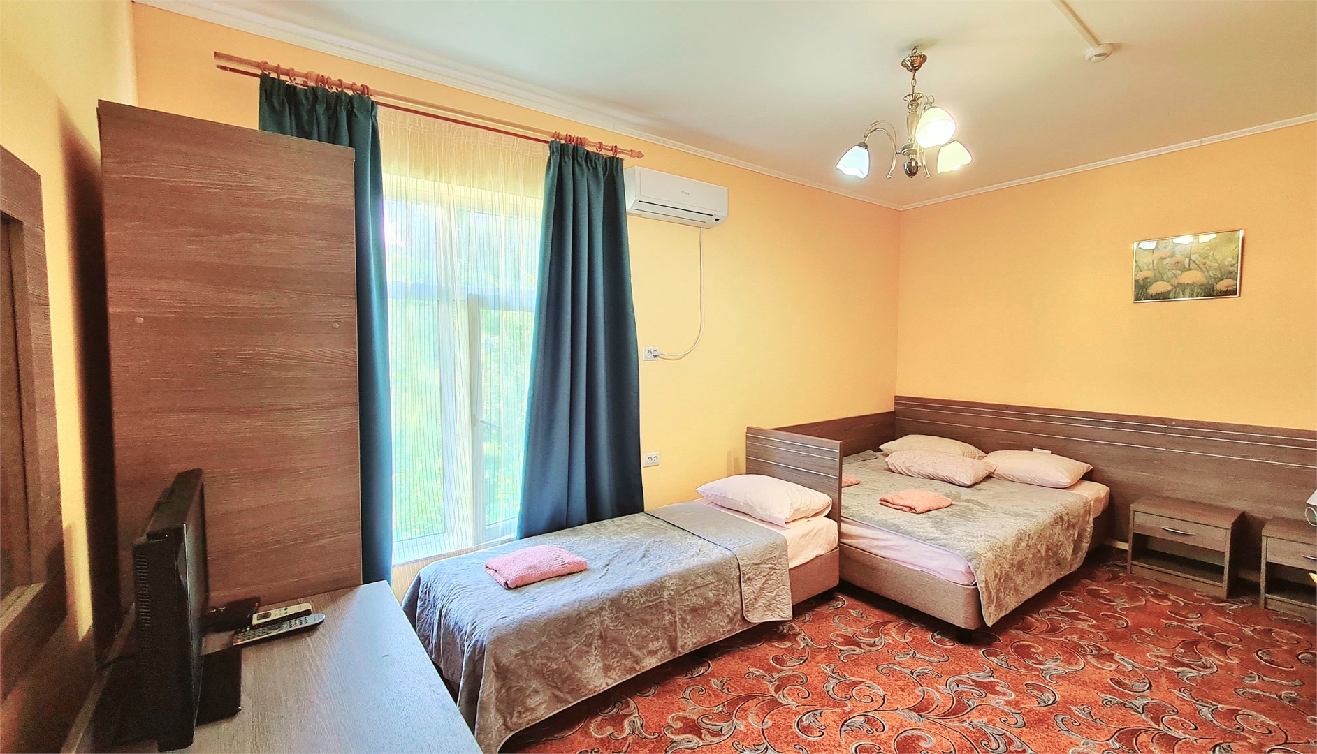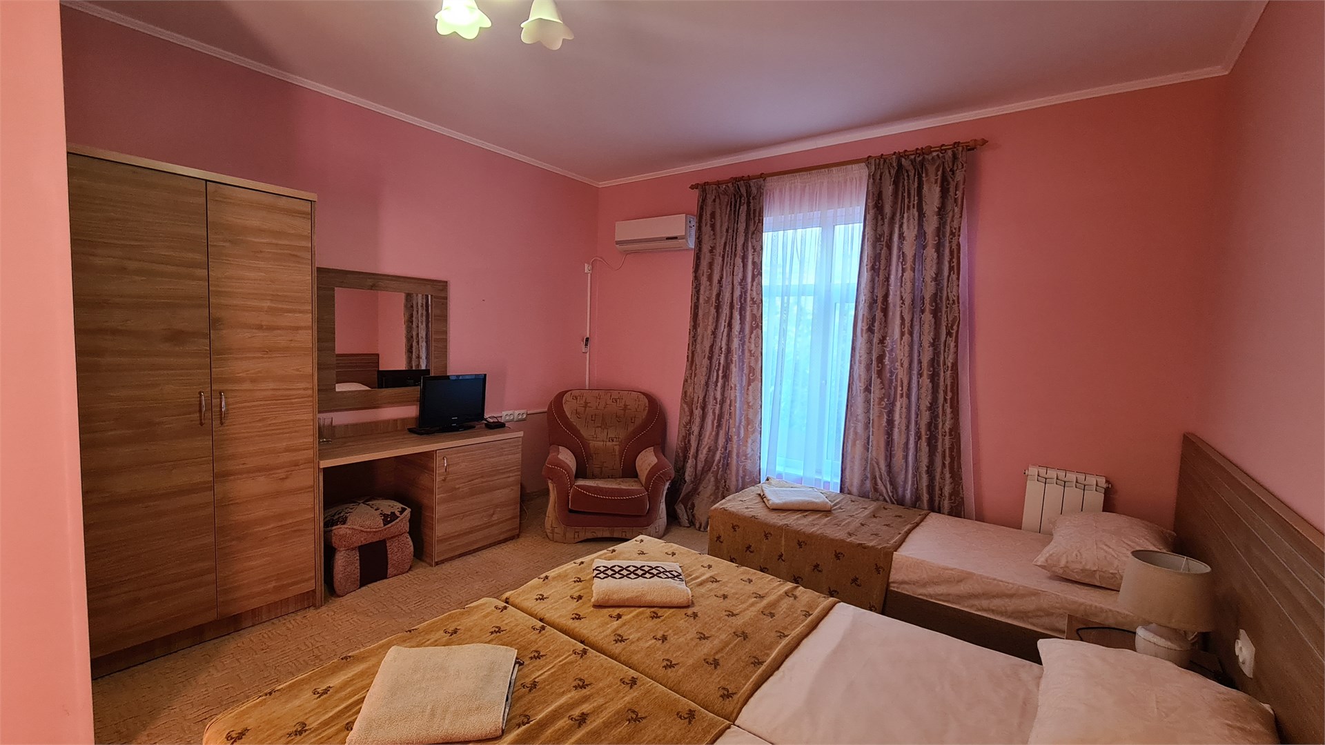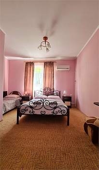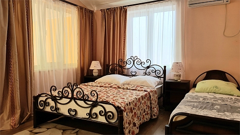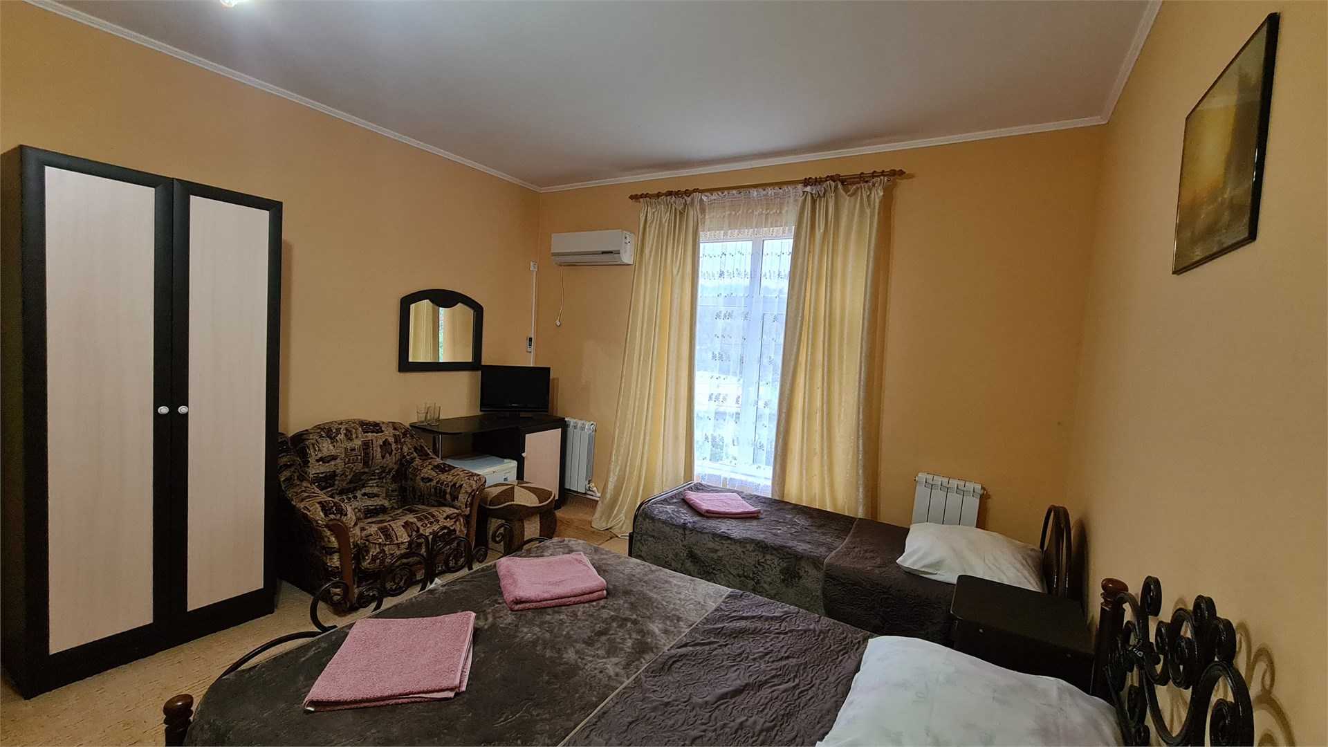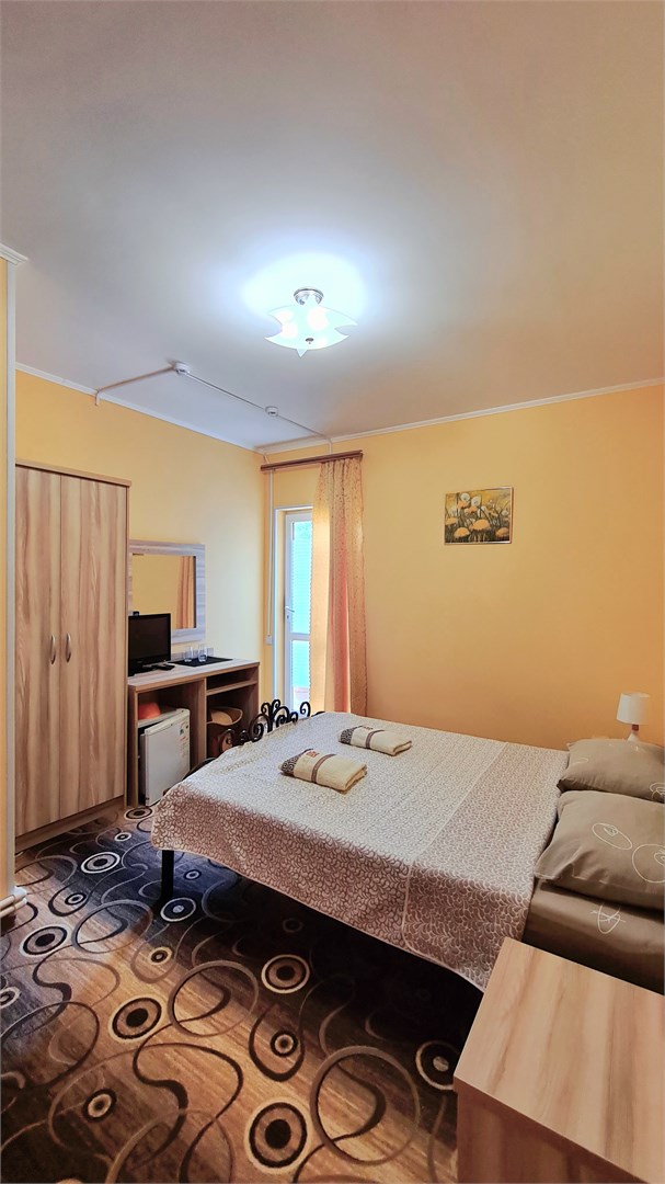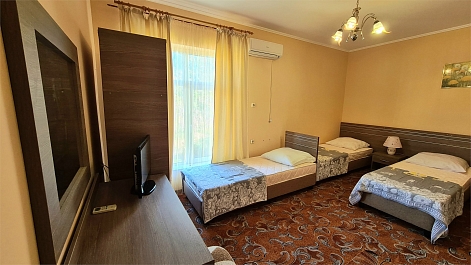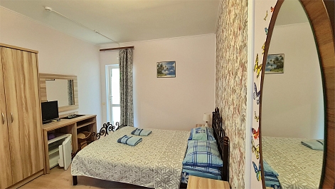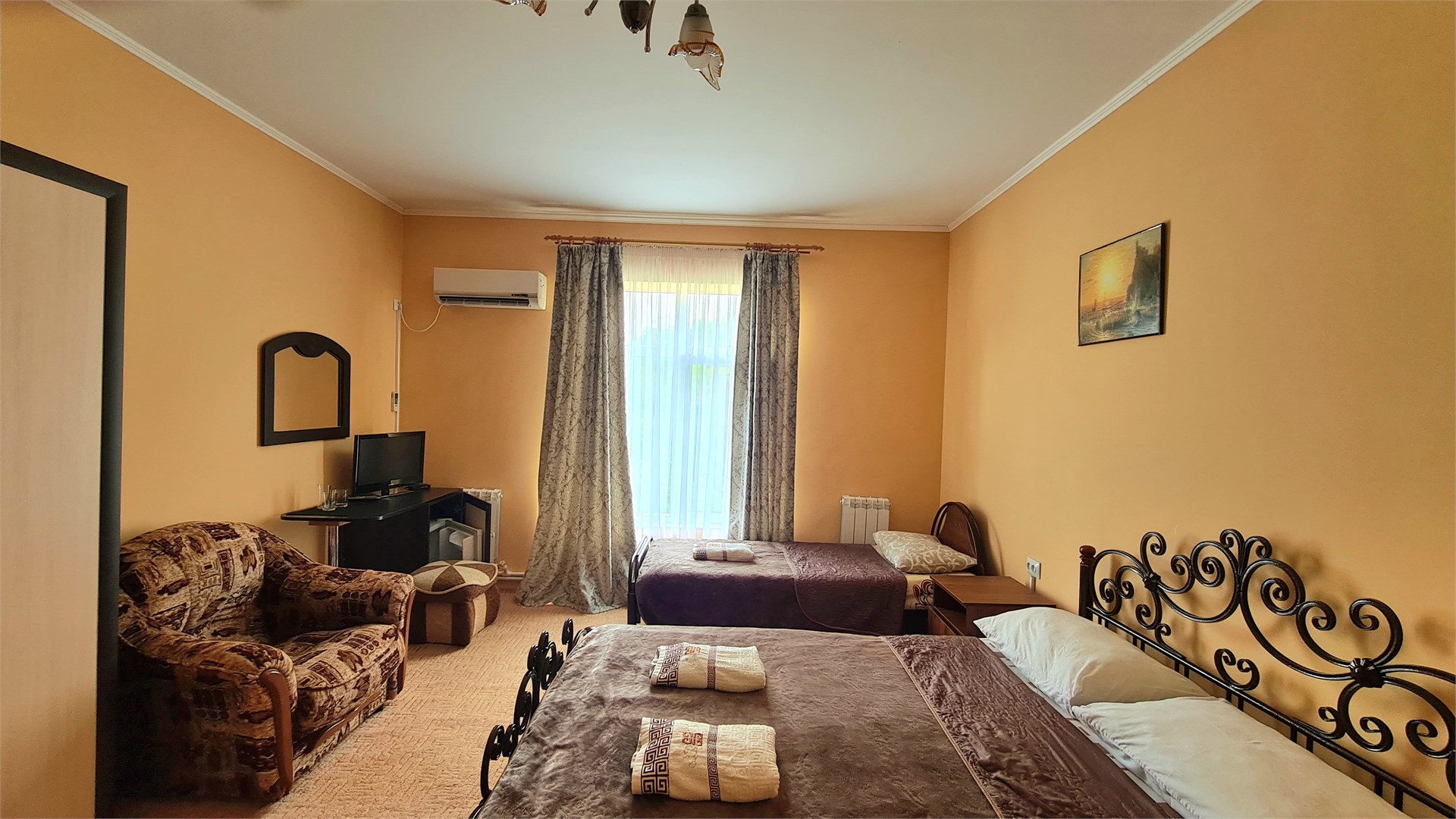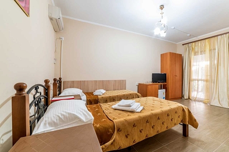 В номере: кровать двуспальная, кровать односпальная, прикроватные тумбочки, стол, шкаф, мини-холодильник, сплит-система, телевизор
