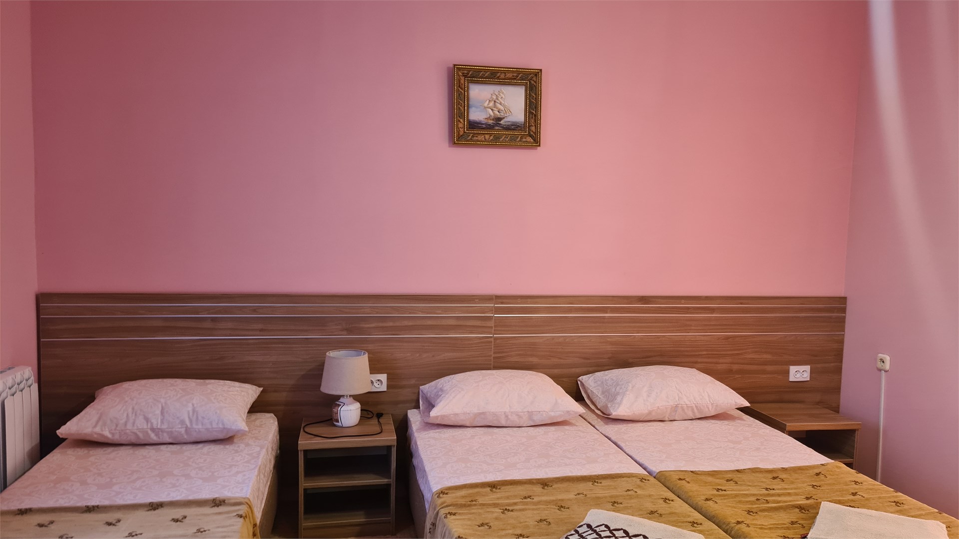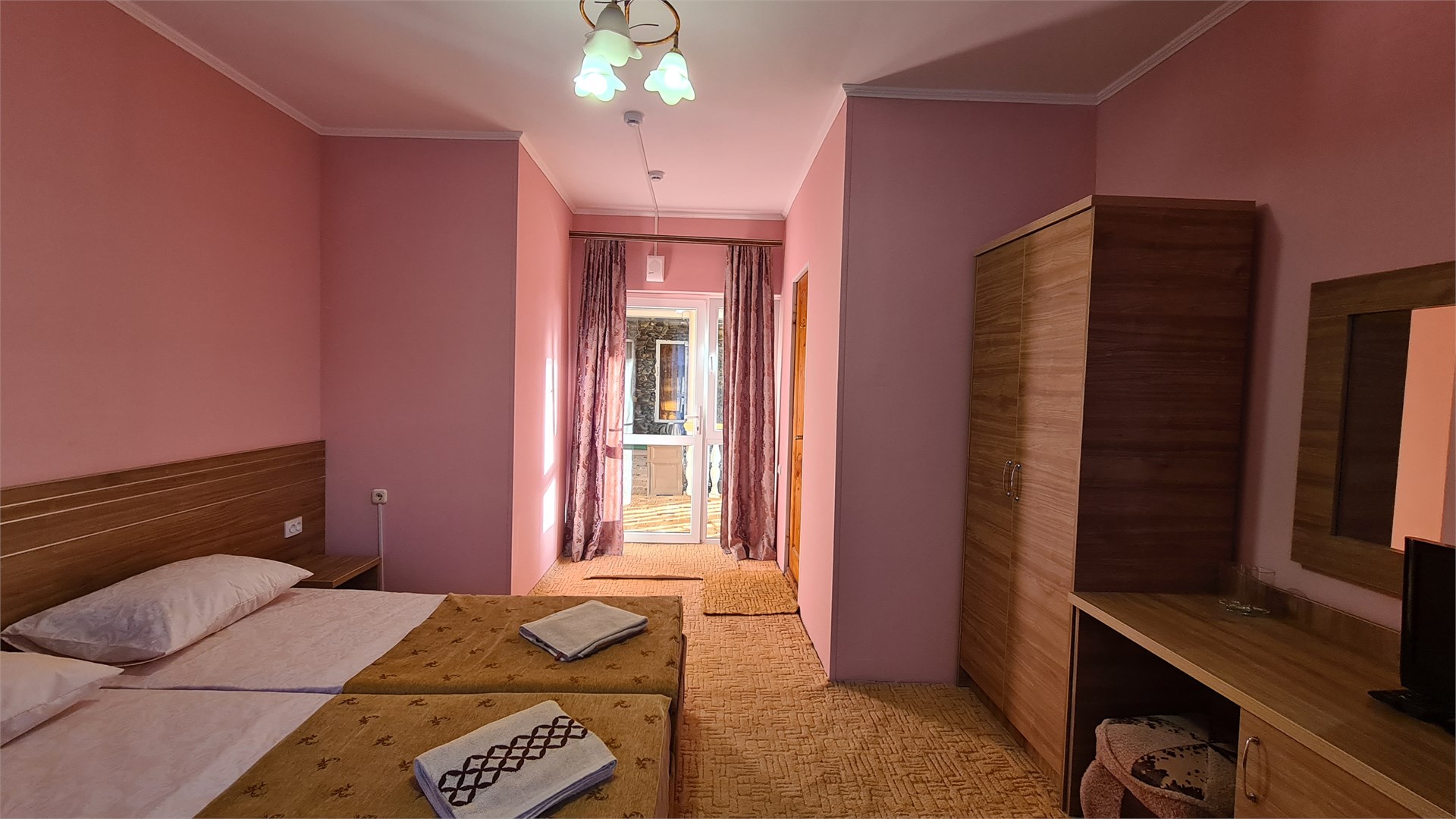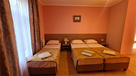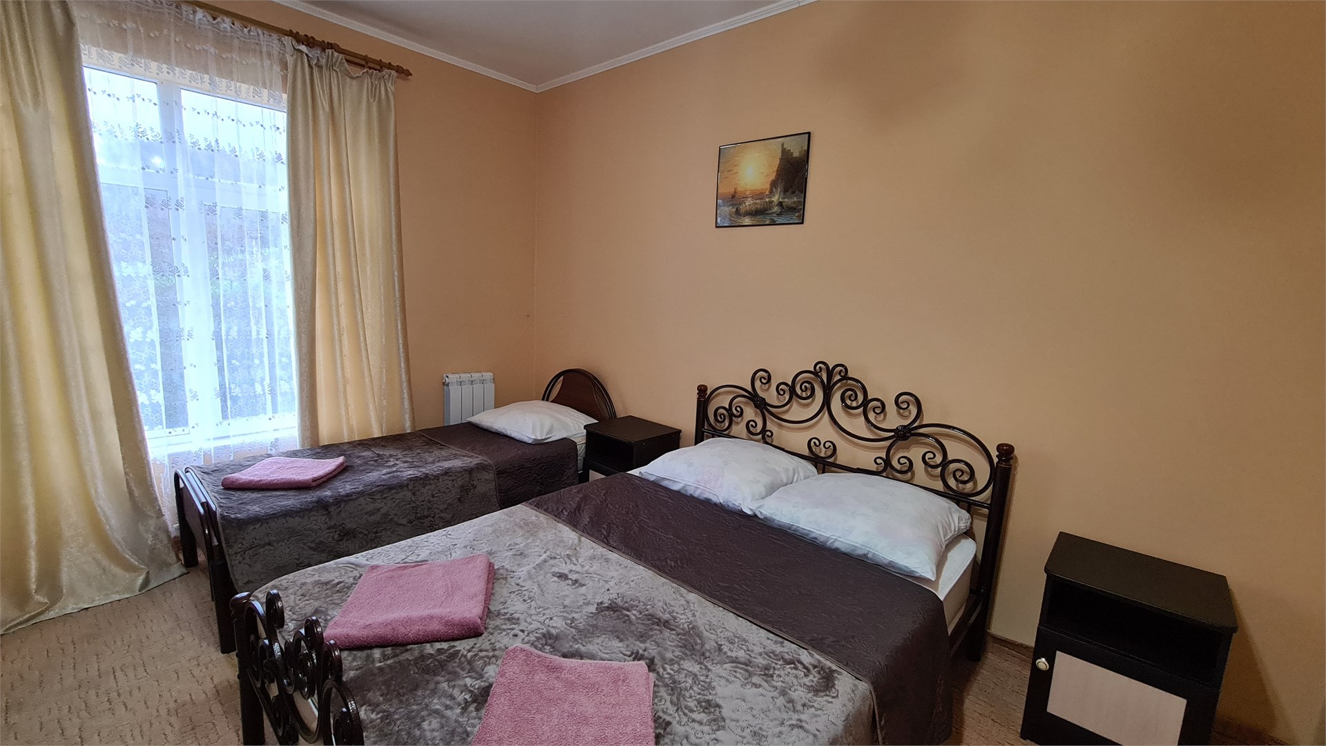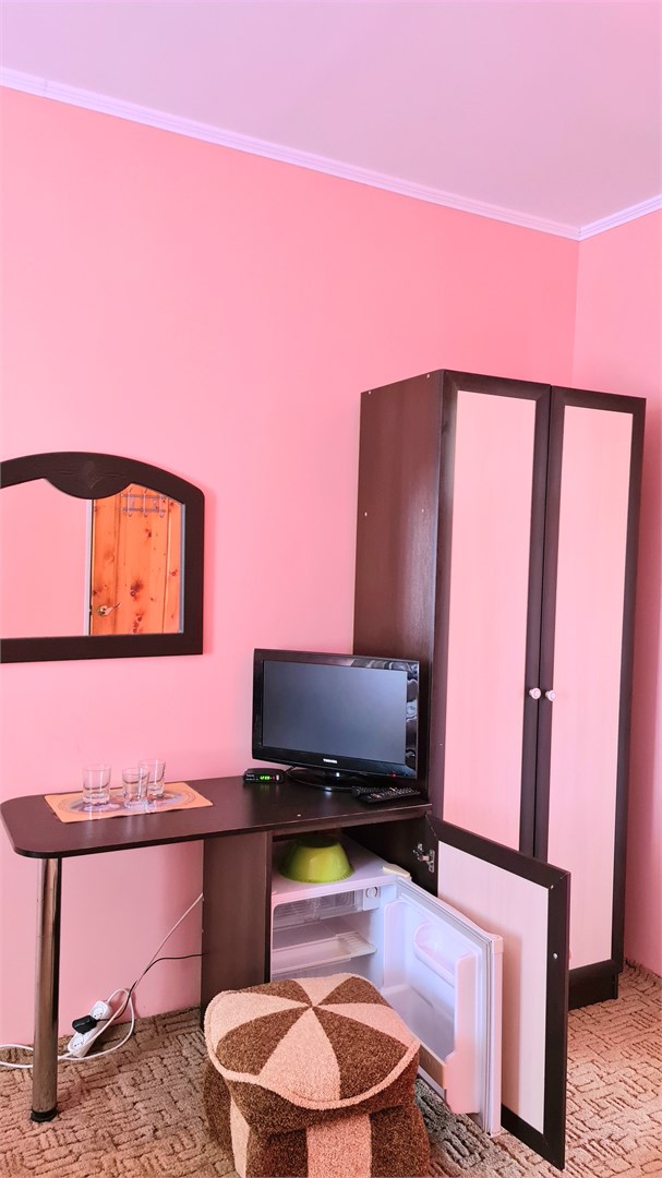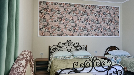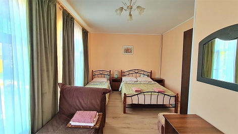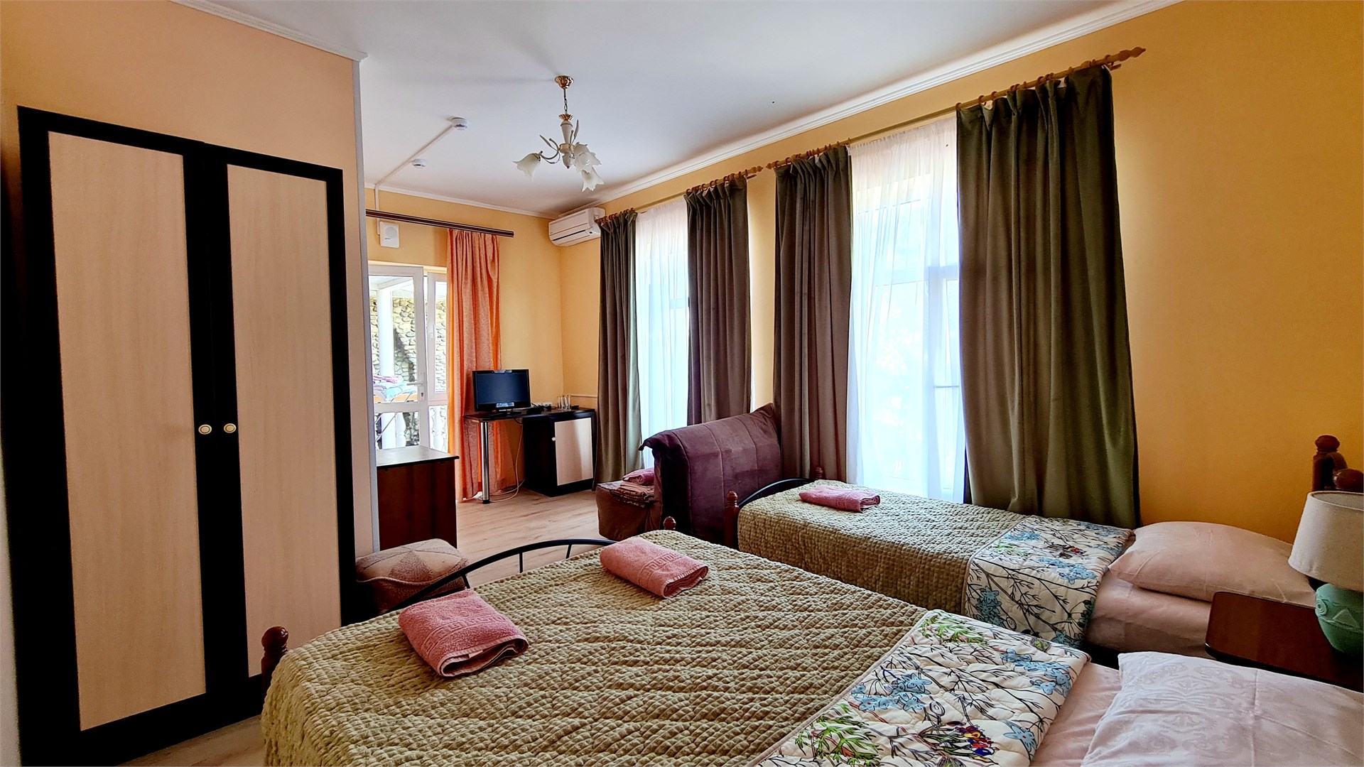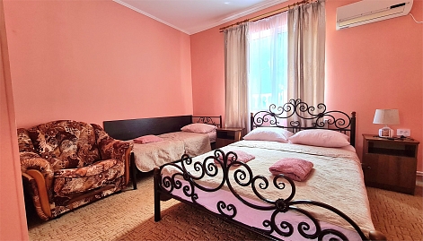 В номере: кровать двуспальная, кровать односпальная, прикроватные тумбочки, стол, шкаф, мини-холодильник, сплит-система, телевизор