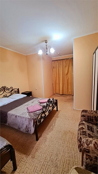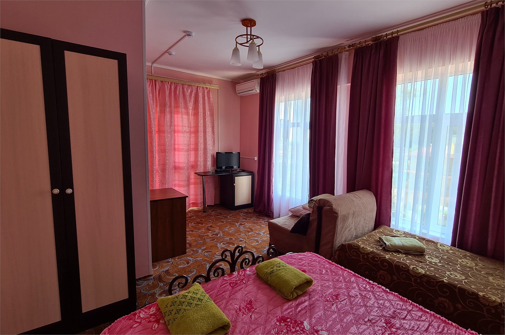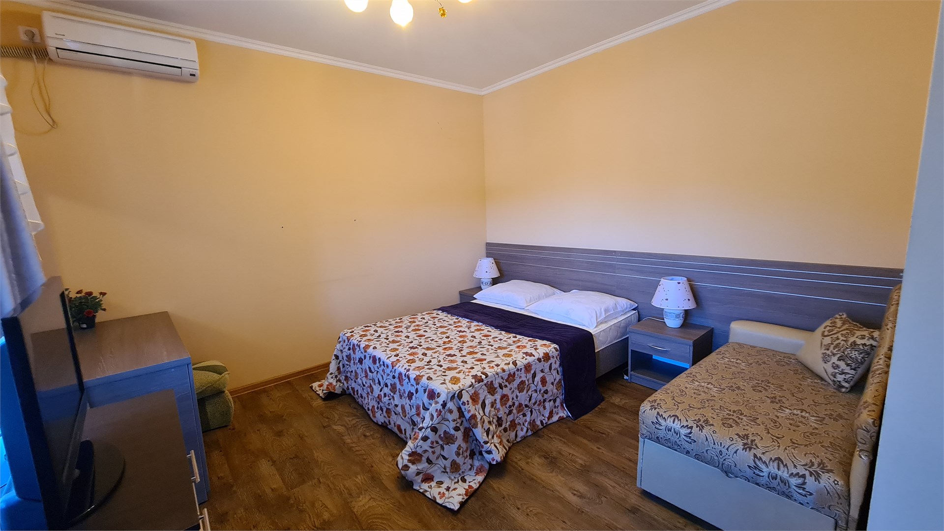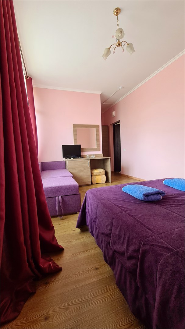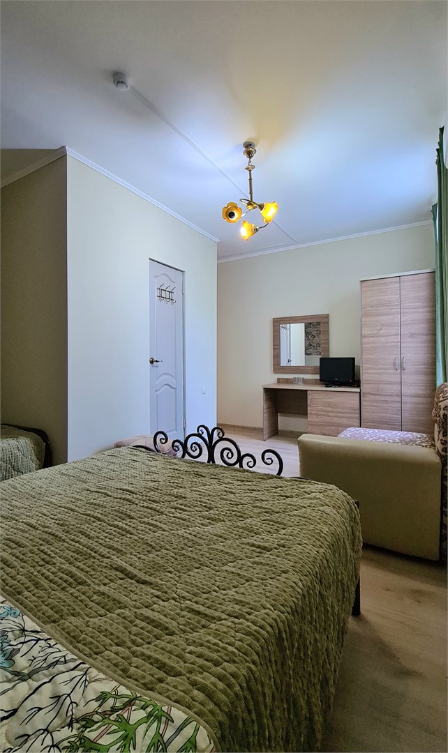 В номере: кровать двуспальная, кровать односпальная, прикроватные тумбочки, пуфик, стол, шкаф, мини-холодильник, сплит-система, телевизор