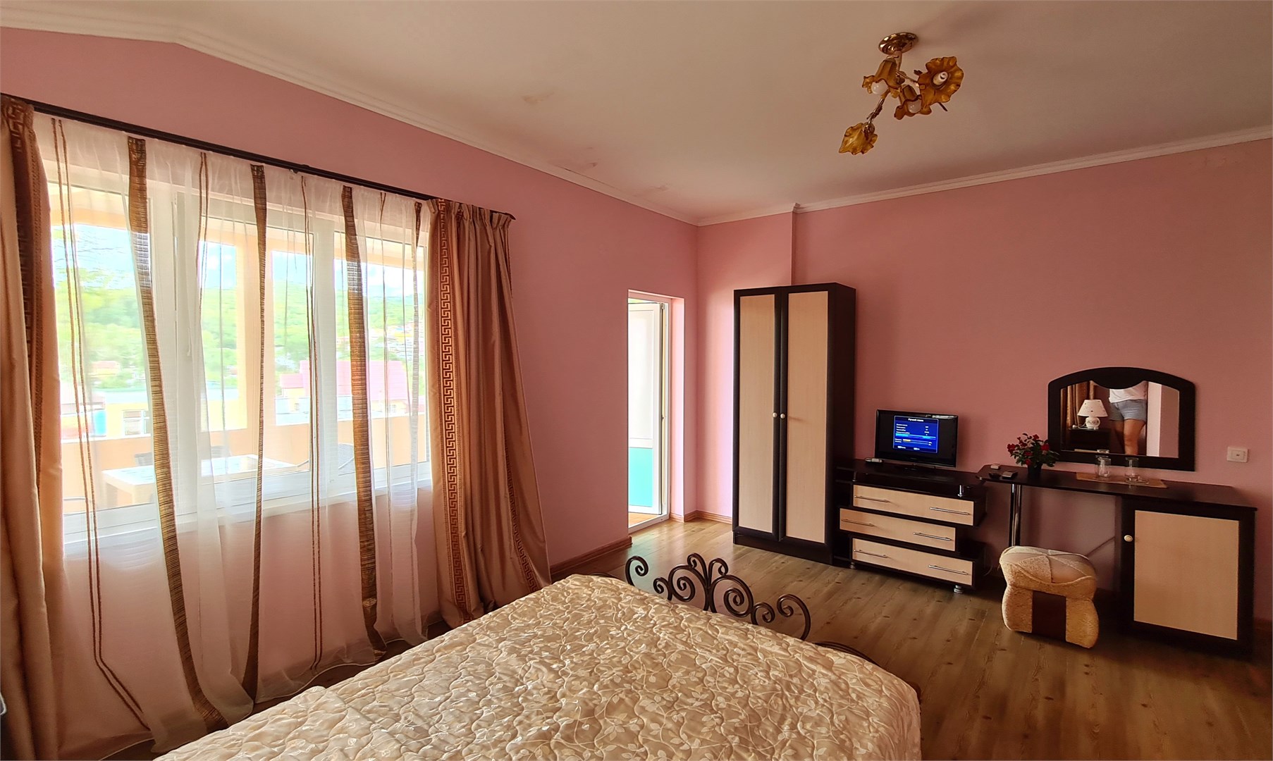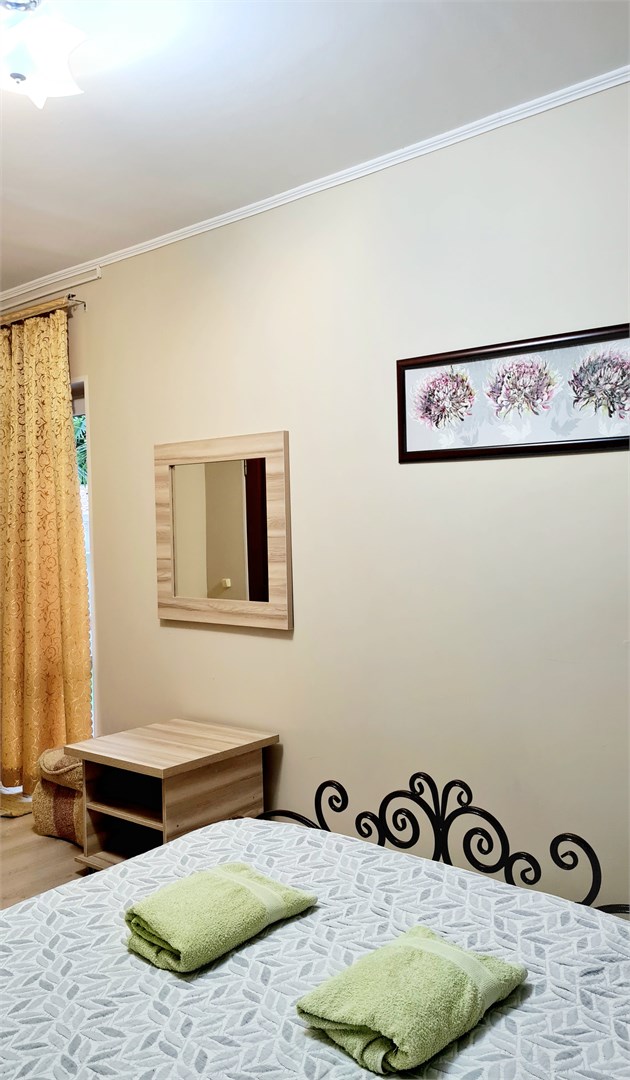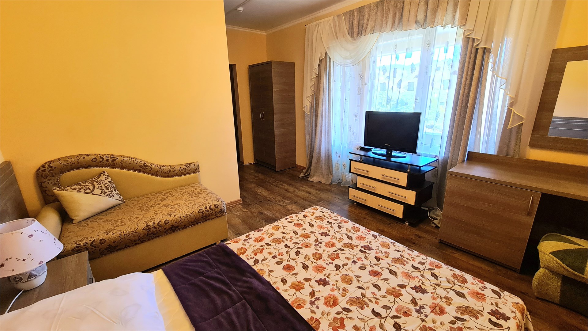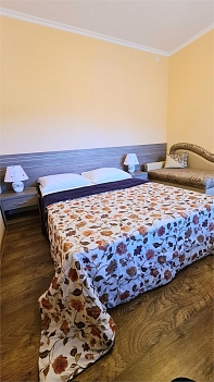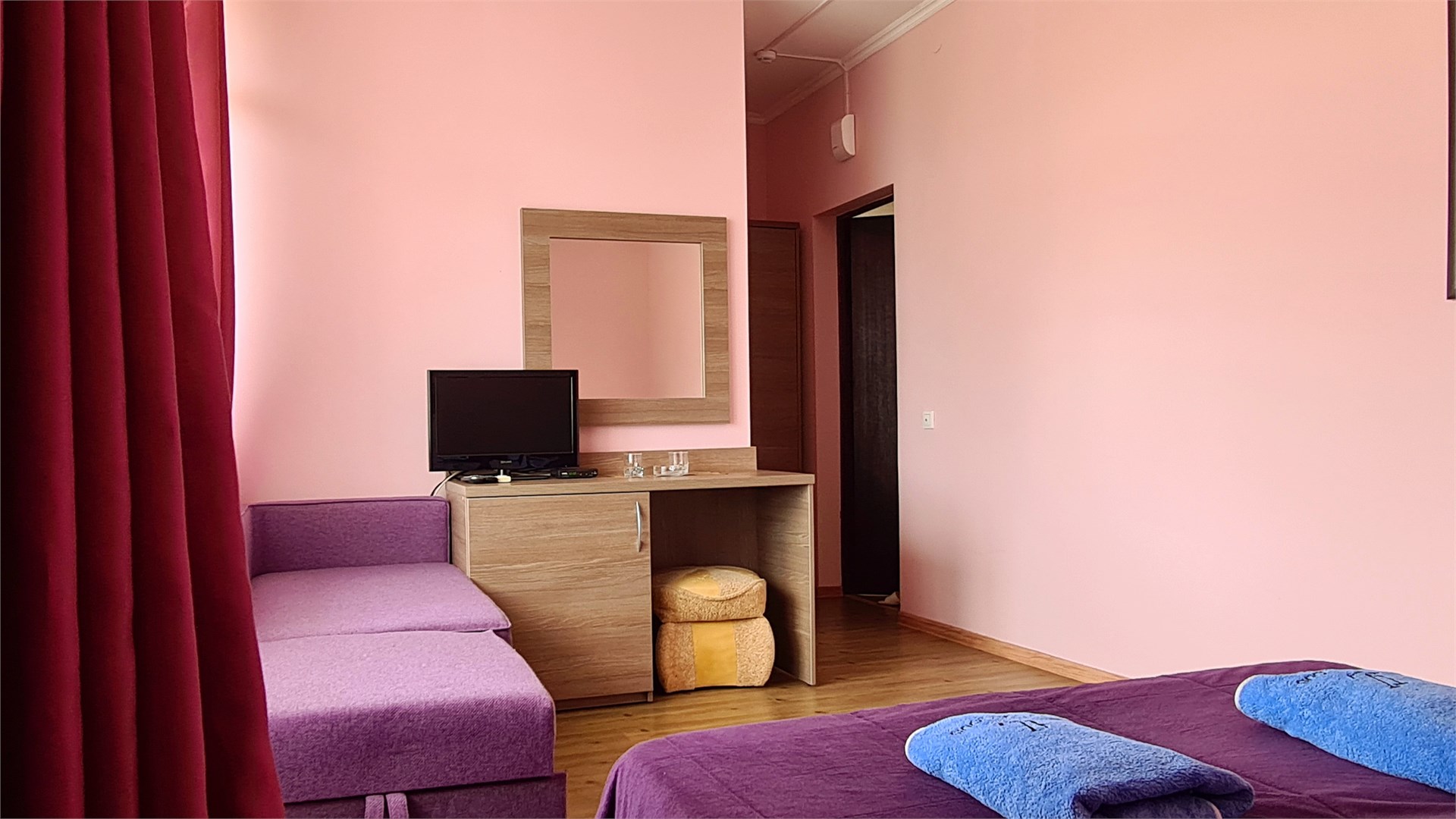 В номере: кровать двуспальная, кровать односпальная, прикроватные тумбочки, пуфик, стол, шкаф, мини-холодильник, сплит-система, телевизор