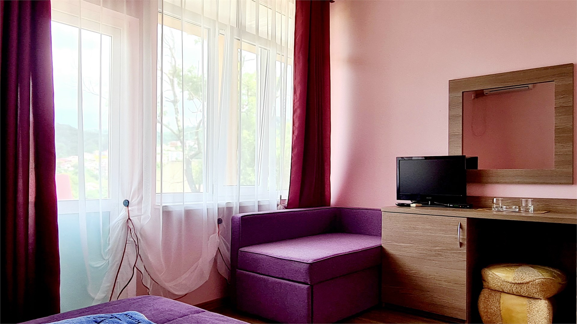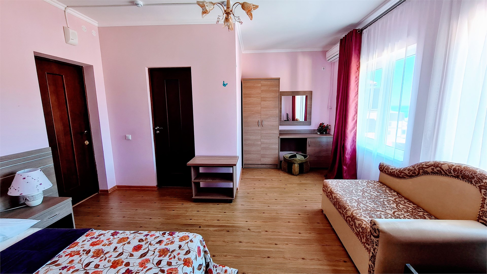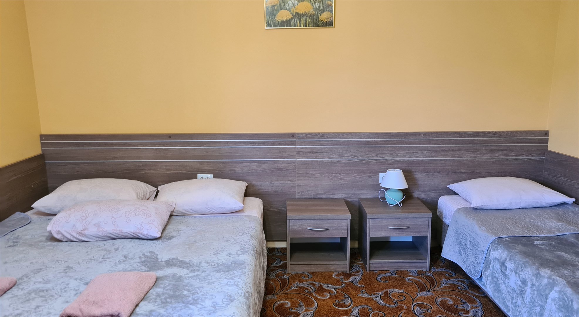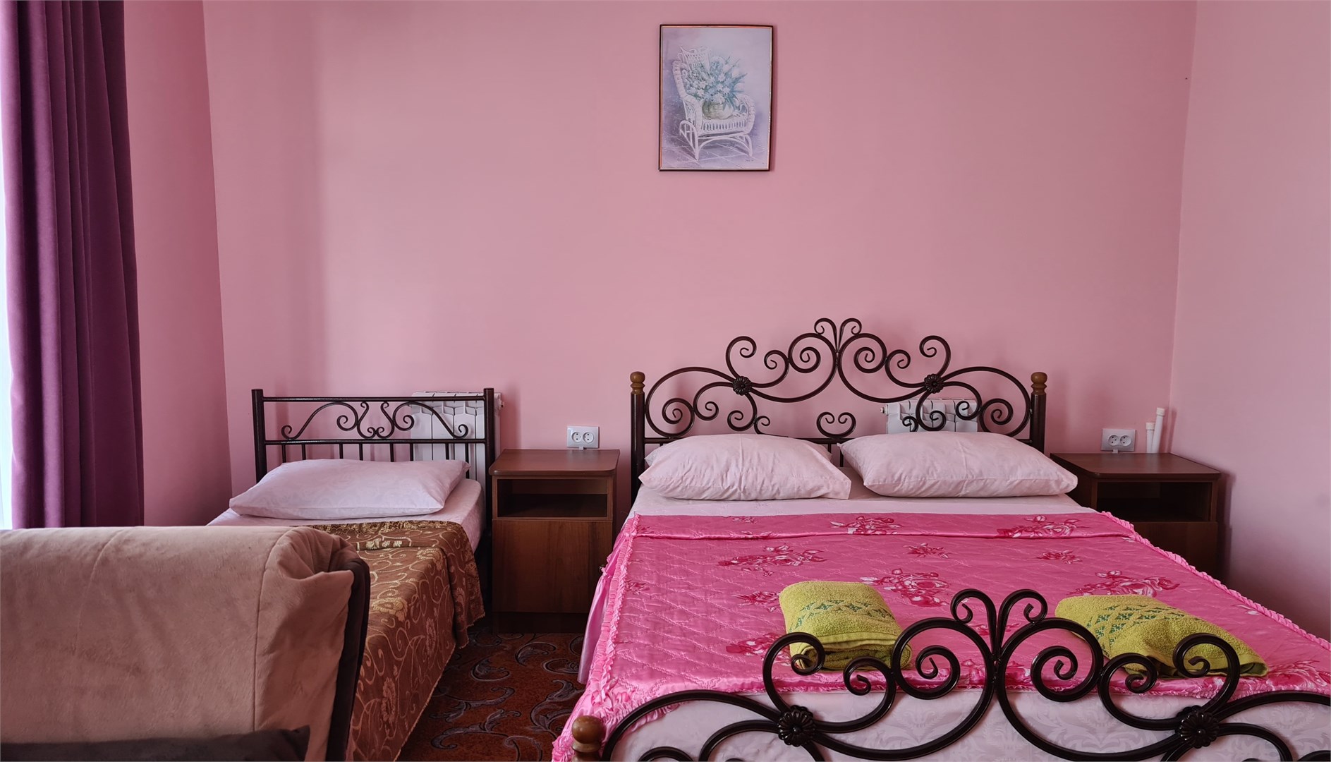 В номере: кровать двуспальная, кровать односпальная, прикроватные тумбочки, пуфик, стол, шкаф, мини-холодильник, сплит-система, телевизор