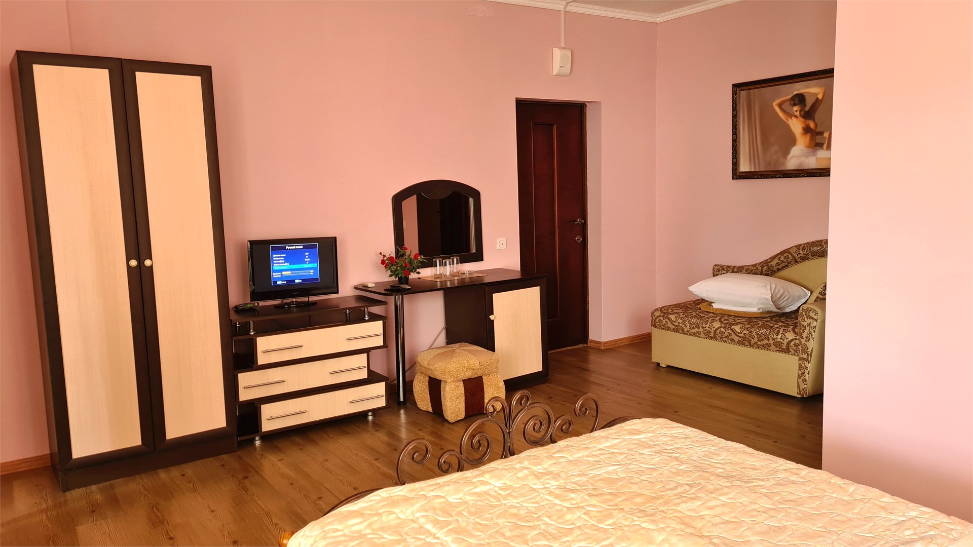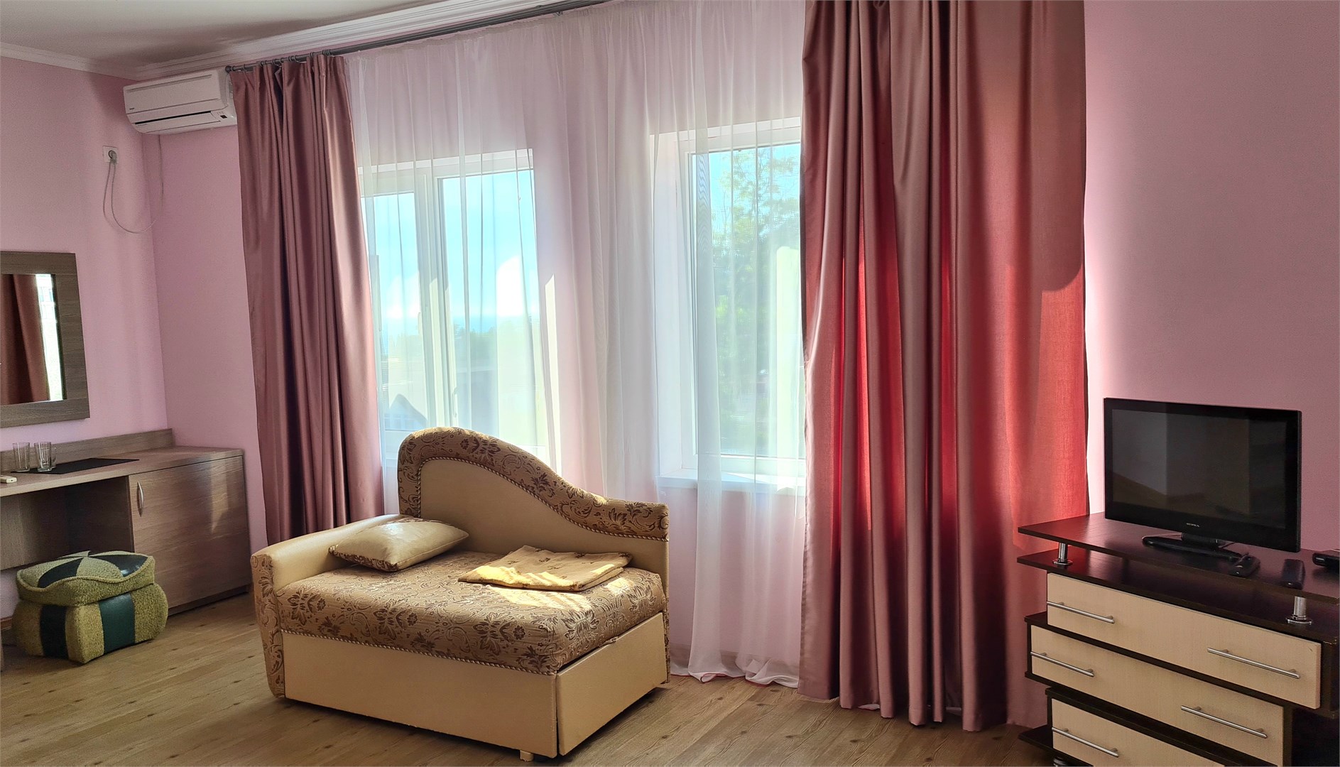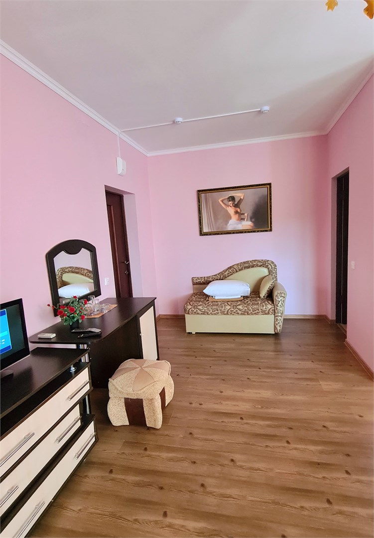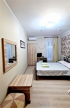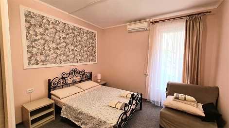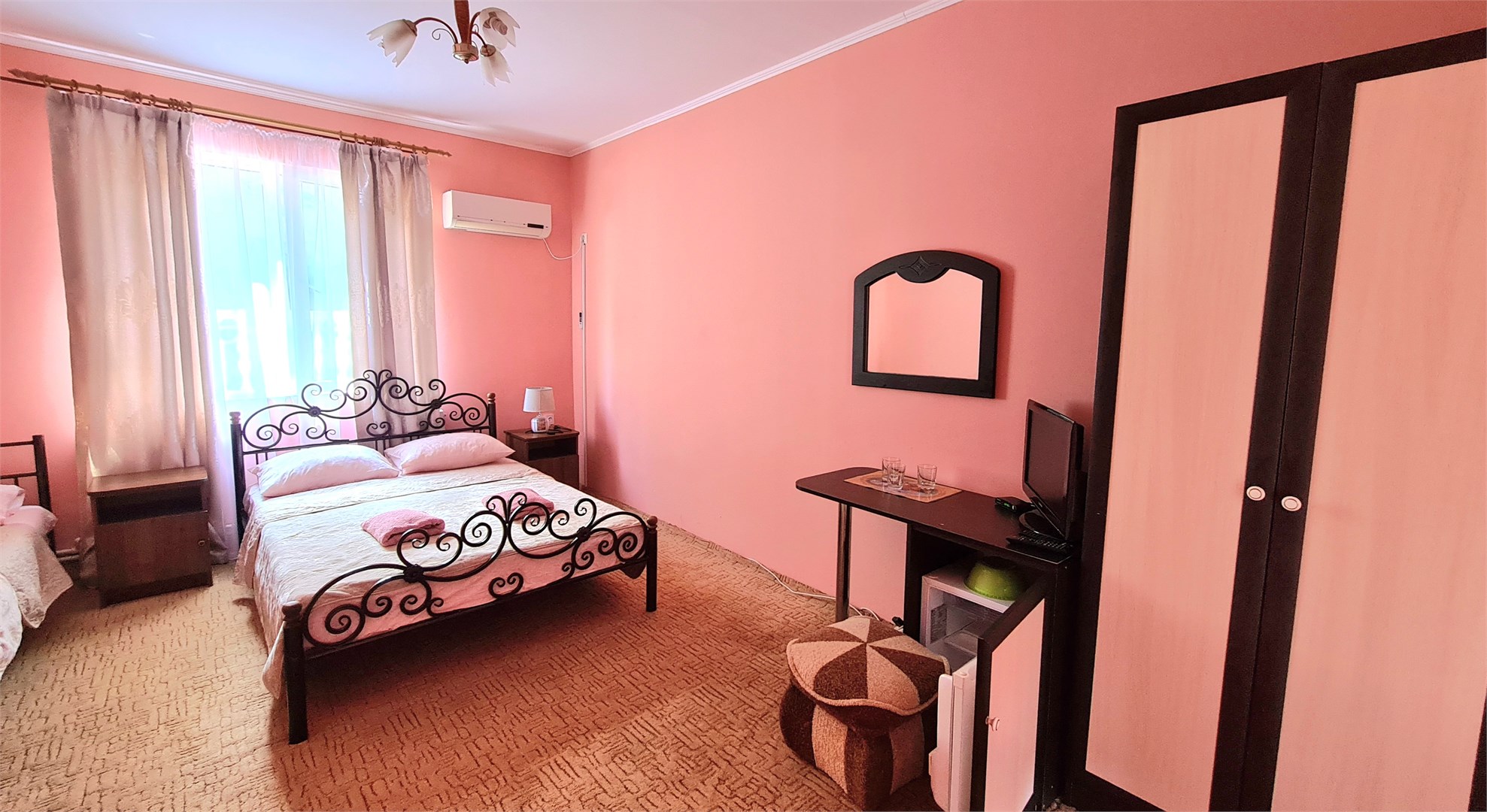 В номере: диван, кровать двуспальная, прикроватные тумбочки, пуфик, стол, шкаф, мини-холодильник, сплит-система, телевизор