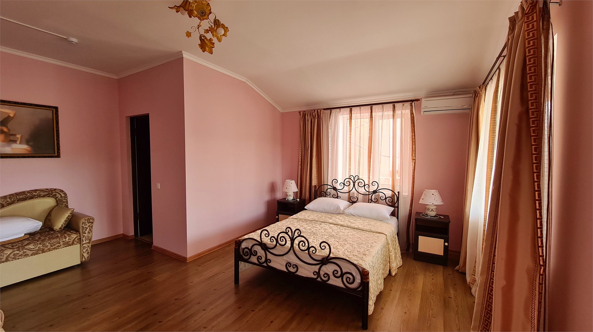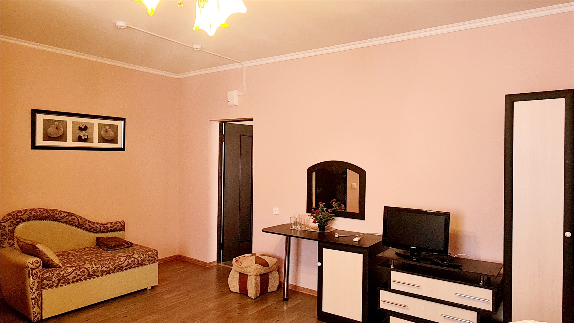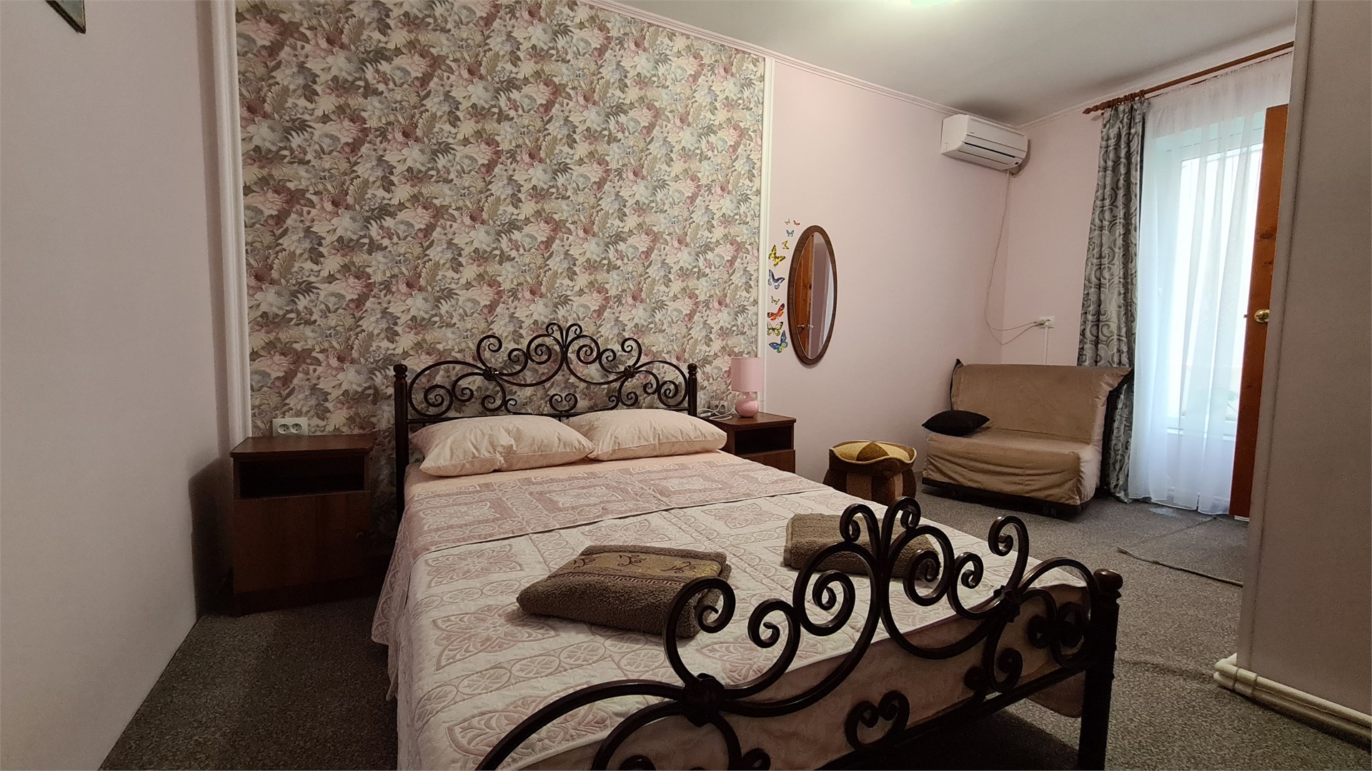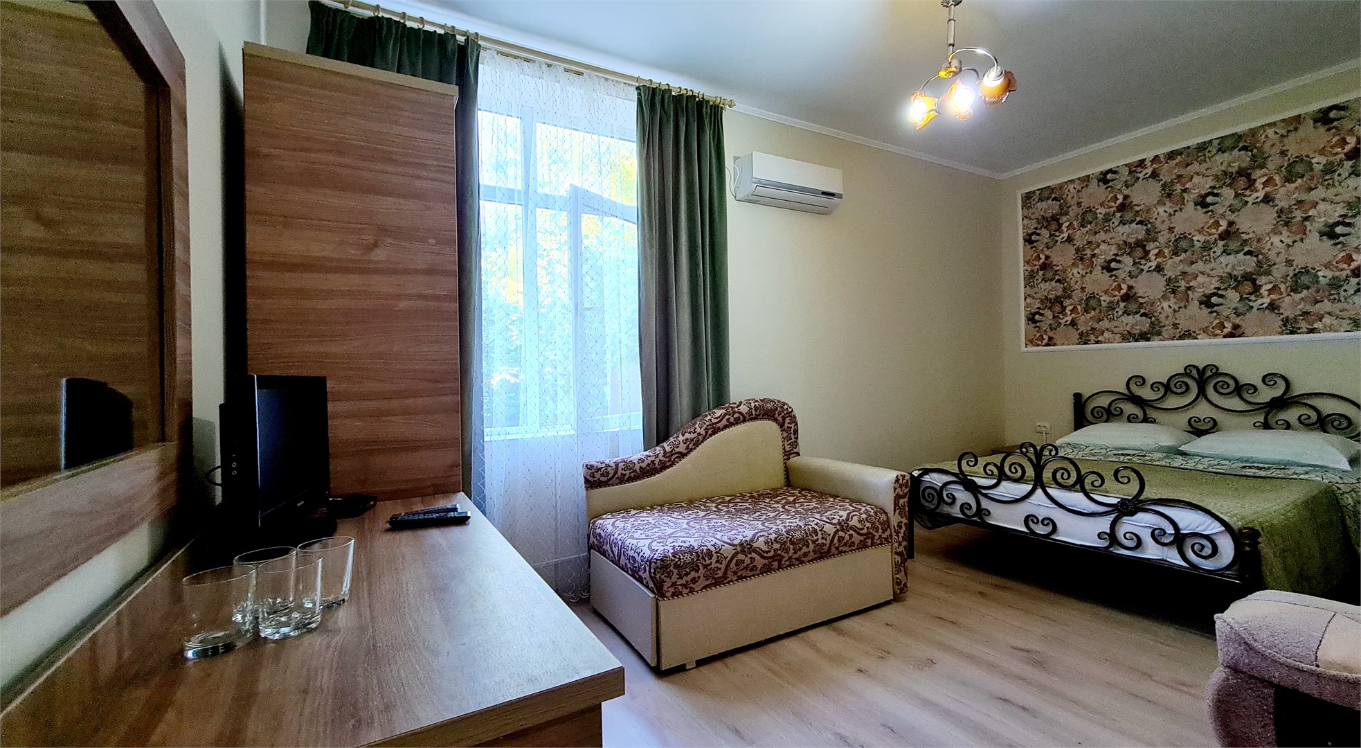 В номере: диван, кровать двуспальная, прикроватные тумбочки, пуфик, стол, шкаф, мини-холодильник, сплит-система, телевизор