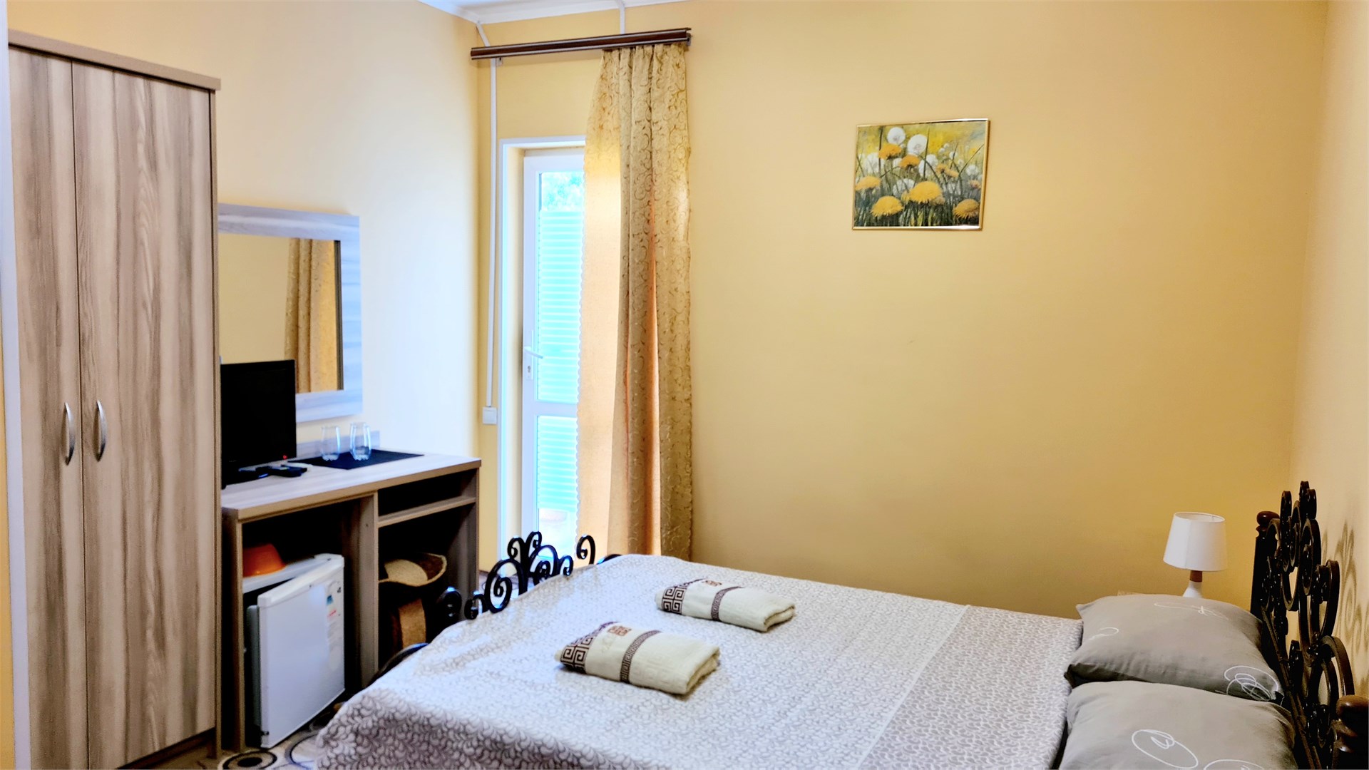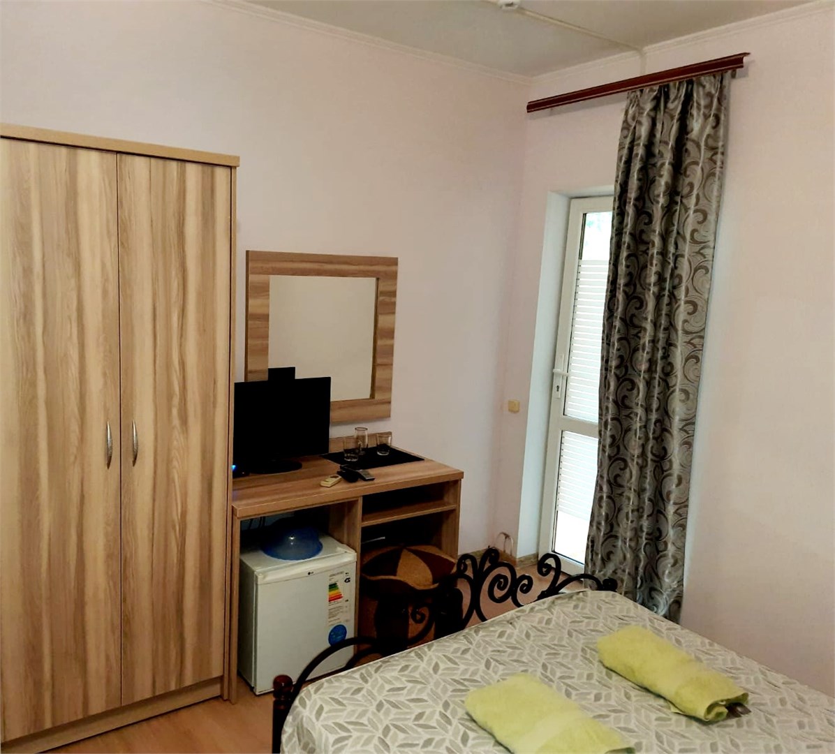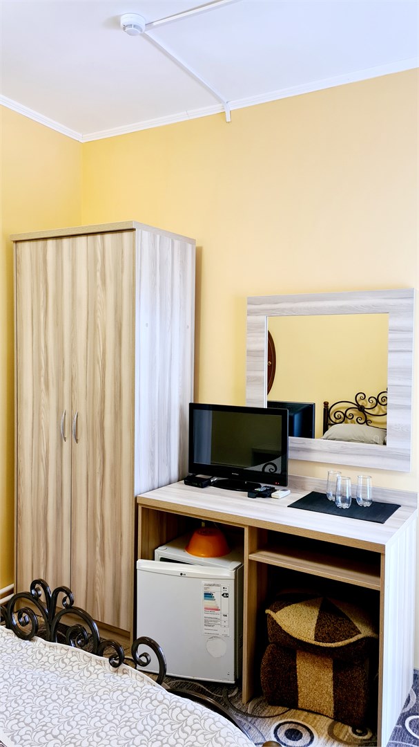 В номере: кровать двуспальная, прикроватные тумбочки, стол, шкаф, мини-холодильник, сплит-система, телевизор