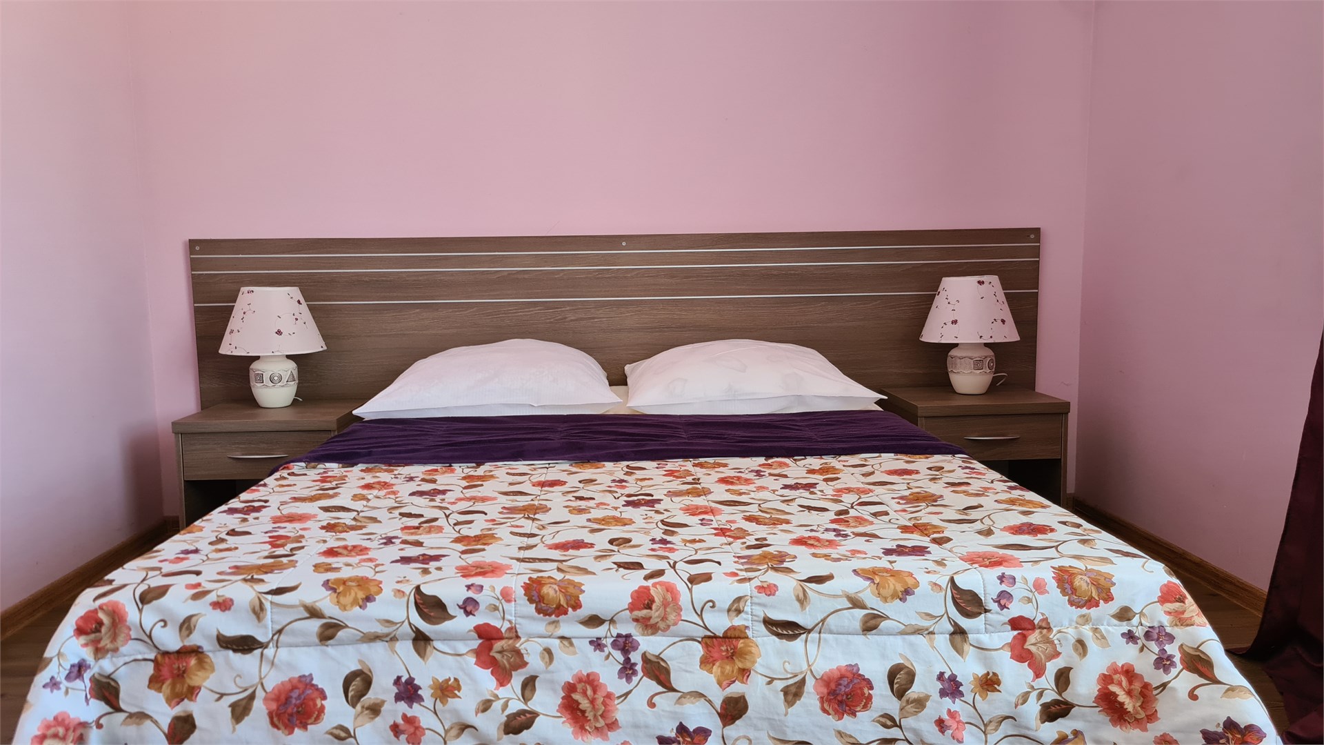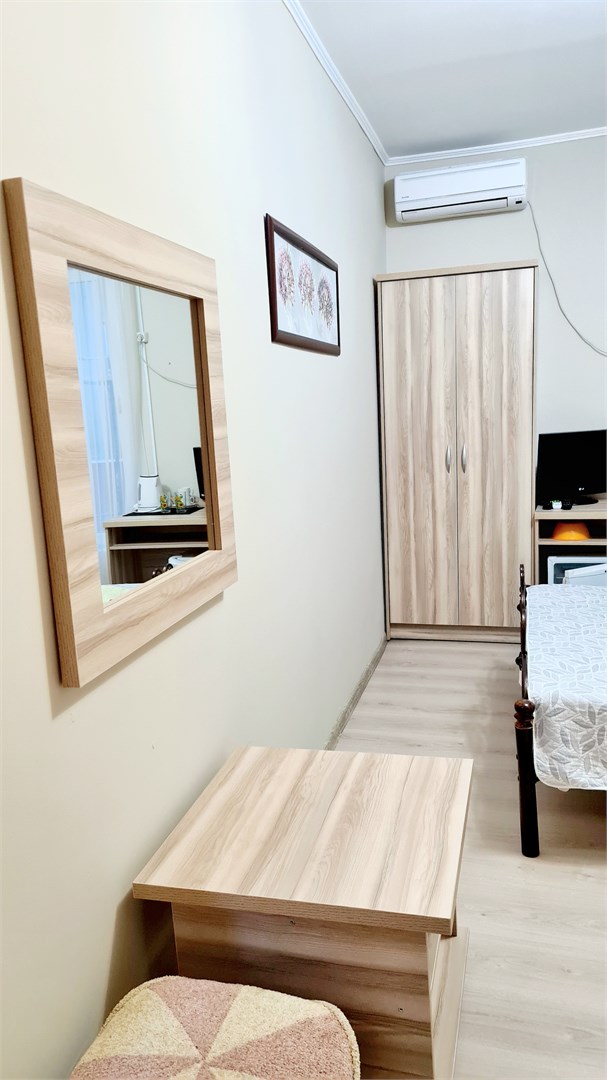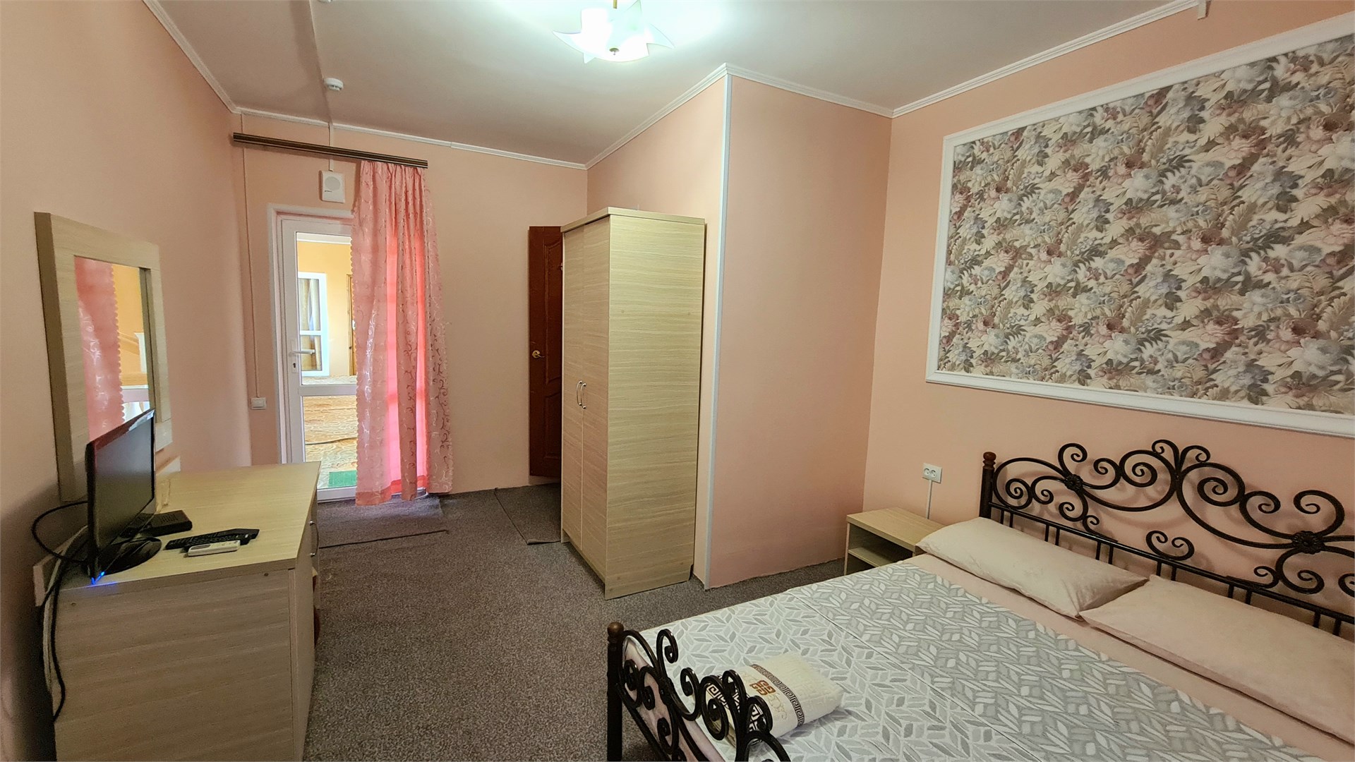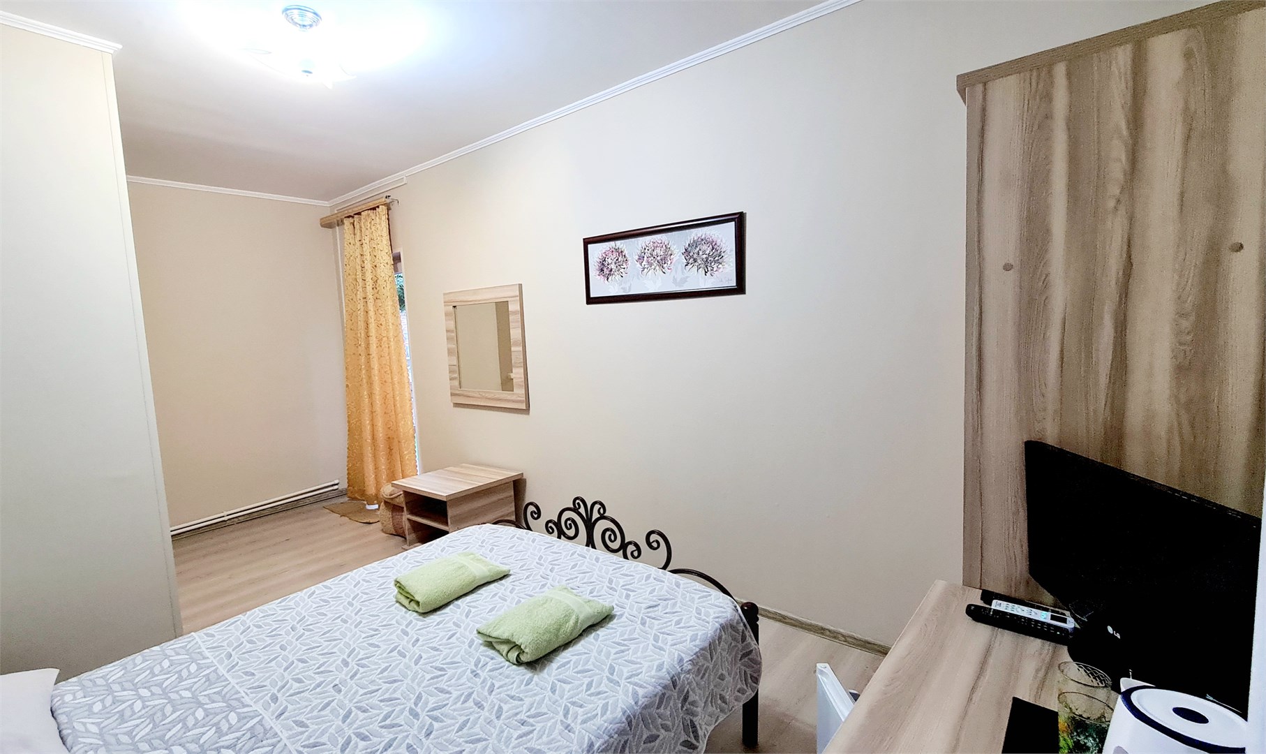 В номере: кровать двуспальная, прикроватные тумбочки, стол, шкаф, мини-холодильник, сплит-система, телевизор